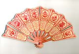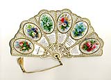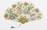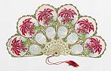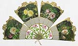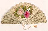 Hand fan that opens to reveal a three-dimensional pair of roses.