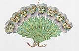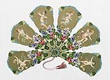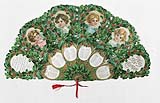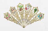 Hand fan showing a young girl wearing a green dress and carrying a bouquet of flowers. For the other side, see Image 51.