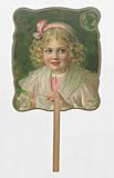 Stock fan showing a portrait of a young girl used by Frederick Loeser & Co., Brooklyn, New York. The portrait, by Carle J. Blenner (1862‒1952), depicts a girl blowing bubbles. It was adapted from a 30" x 24" painting by Blenner that was auctioned in 2009. For the other side, see Image 53.