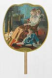 Fan illustrating a domestic scene showing a mother with her two daughters and a sewing machine in the background. Circulated compliments of the New Home Sewing Machine Co., Orange, Massachusetts and used by an agent, J. Quincer, Redwood, New York. For the other side, see Image 57.