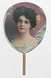 Hand fan from the New Home Sewing Machine Co., Orange, Massachusetts, featuring a portrait of a young woman. For the other side, see Image 59.