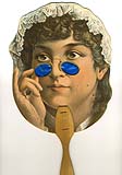 Hand fan featuring a young woman wearing blue-tinted sunglasses. On the back is an advertisement for Brine & Norcross Reliable Stores, Boston, which sold hosiery, gloves, small wares, and fancy goods. The business suggests that people hold the fan up to their eyes in order to protect them from the sun.
