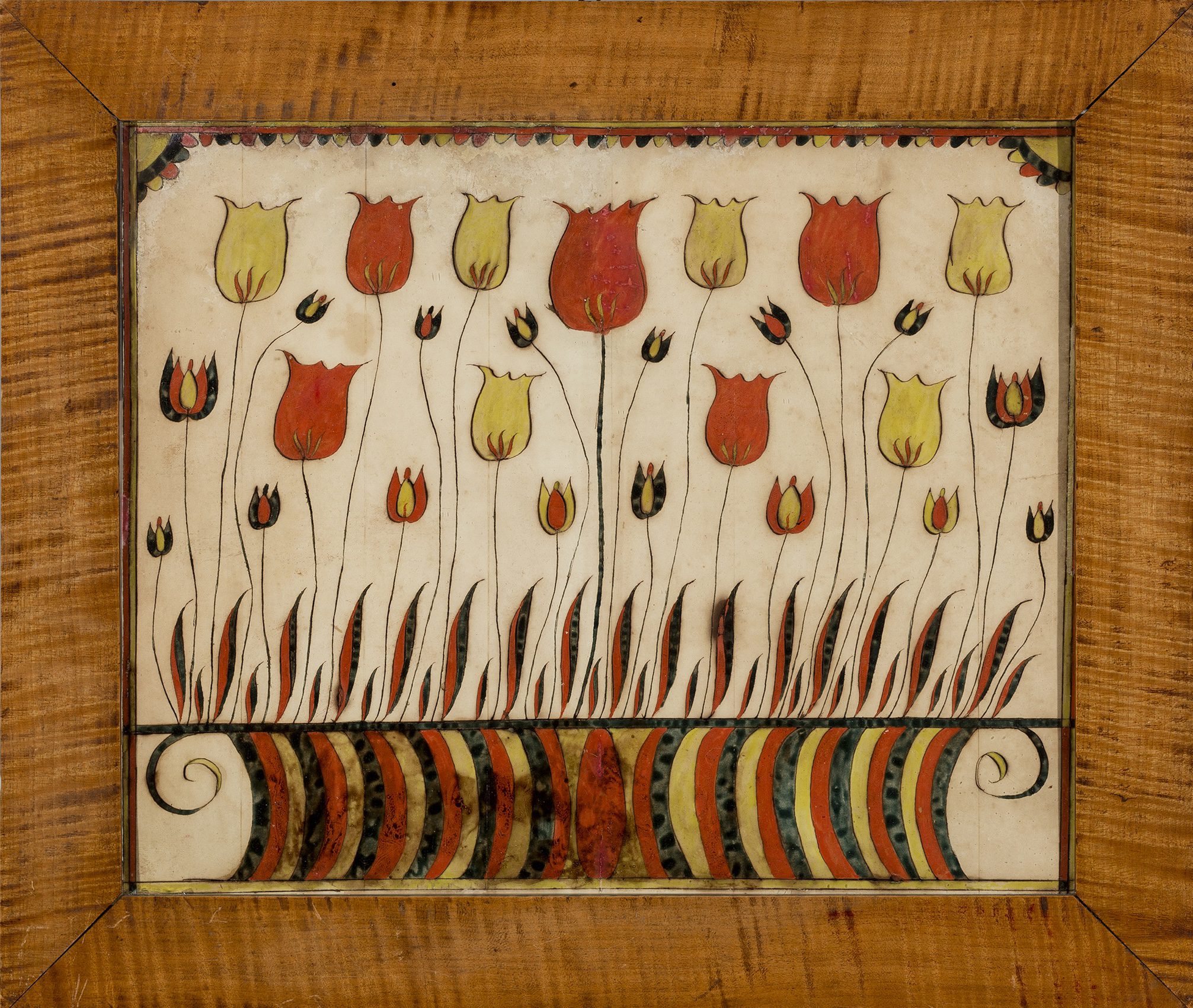 Tulips were a popular motif for the tile markets of Europe from the 17th through the19th centuries. When German and Dutch immigrants moved to Pennsylvania, they brought elements of their culture with them, and tulips are a common design motif on ceramics, furniture, fabric, and works on paper in the collection.