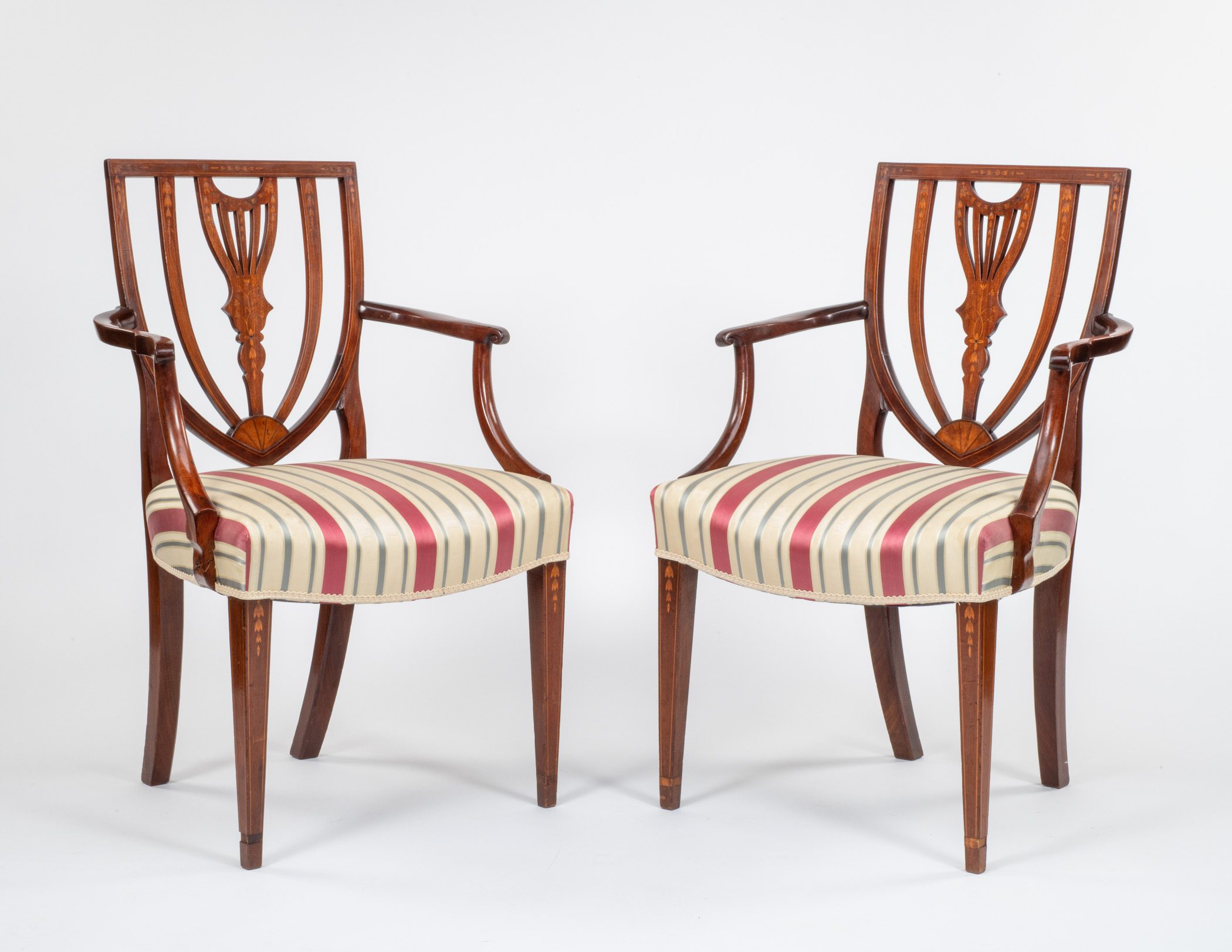 The chairs are made of mahogany. All are decorated with swags of floral inlay, each meticulously incised, then rubbed with ink or paint to heighten the illusion of relief. The seats curve upward at the corners for comfort. The tops are flat, unlike typical shield-back chairs. The Hamiltons used them in the dining room of The Grange, their Federal-style home in Manhattan.