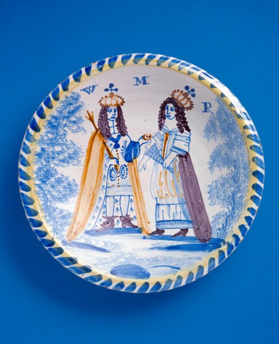 Ceramic mugs and plates are commonly created to commemorate a monarch or a specific event such as a coronation. A delftware plate portrays William of Orange (r. 1689–1702) and his wife, Mary Stuart (r. 1689–1694). The couple, who jointly ruled the kingdoms of England, Scotland, and Ireland, is shown in an outdoor setting wearing their coronation attire, with the initials “W M R” for William and Mary Rex/Regina near their heads. This plate was most likely made in Bristol or London around the time of their coronation. Evidence of delft commemorative plates like this one have been found in America, particularly in New England.