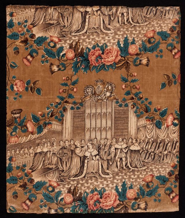 A more elaborate scene from the coronation of Queen Victoria in 1838 is featured on a printed textile in the collection. The swags of flowers that surround the scene resemble those used to decorate fabrics with American patriotic motifs. Evidence of patterns showing Queen Victoria’s coronation have been found in America.