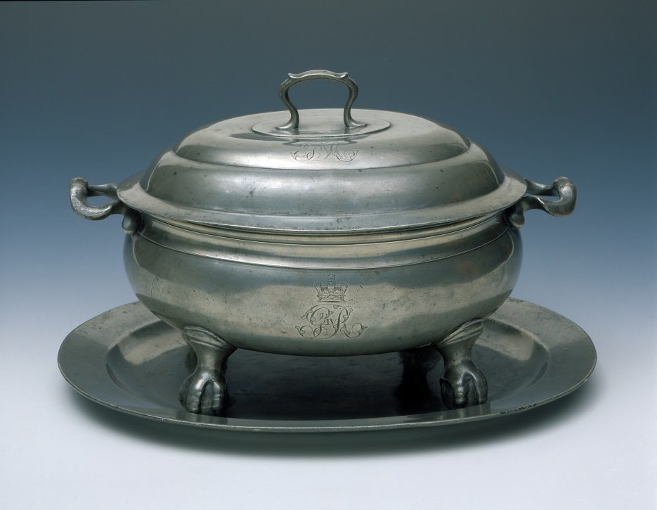 The coronation of King George IV is also represented in the Campbell Collection of Soup Tureens by a pewter tureen, one of a group of table wares created for the banquet following the ceremony. The menu featured turtle soup, which may have been served in this very vessel. The Observer reported that crowds plundered the tables of the coronation banquet, taking the pewter dishes like this one marked for the sovereign. It bears the inscription “G IV R” below a crown.