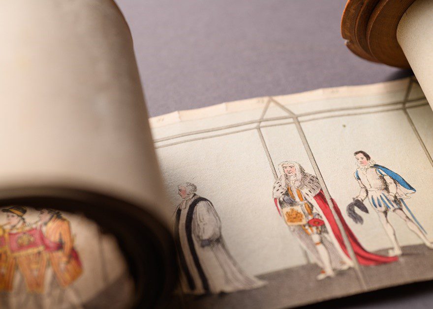 One of the newest is a remarkable hand-held panorama reel of King George IV’s coronation procession in 1821. The object reveals important information about the historic event and those who participated in it. Wound on a bobbin casing and housed in a wooden cylinder, the paper is pulled through a slot, which allows the holder to witness the procession in action. The panorama reel is on view in Conversations with the Collection in the first floor of the Galleries.