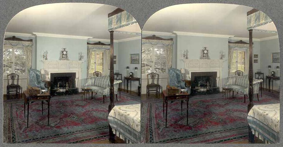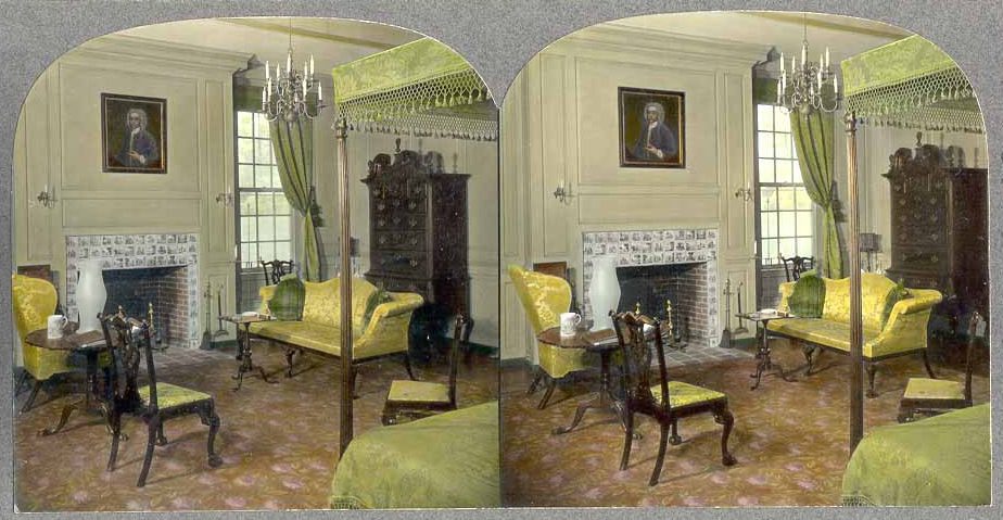 Fan illustrating a domestic scene showing a mother with her two daughters and a sewing machine in the background. Circulated compliments of the New Home Sewing Machine Co., Orange, Massachusetts and used by an agent, J. Quincer, Redwood, New York. For the other side, see Image 57.