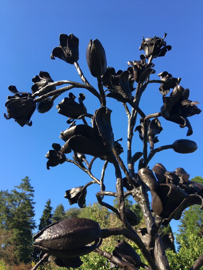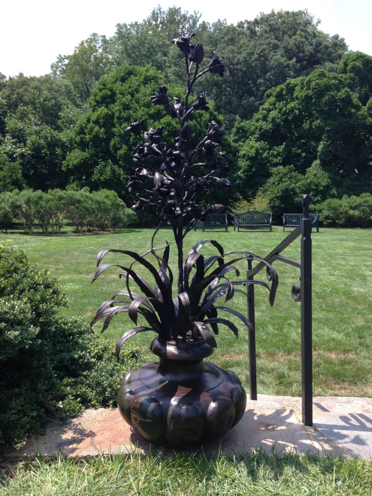 We also know that they are unique— no other comparable sculptures are known to date. Each one stands about 5 feet tall and consists of meandering hand-wrought iron flowers, leaves, and stems embedded in concrete- and lead-filled bronze vases.