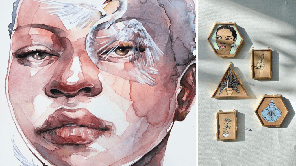 Kara Hinson Fine Art prominently features representations of black women in a variety of mediums, including vivid, layered watercolor portraits and illustrative ink/digital drawings. Surrealistic colors create a dreamlike atmosphere in which her paintings focus on the diversity and strength of women.
