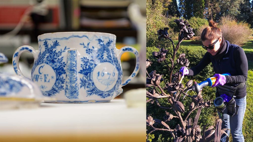 Image (left): Tin-glazed earthenware posset pot with missing spout, c. 1676, Winterthur Museum 2016.0034.015. Image (right): Lauren Fair performs annual maintenance to one of the iron lily sculptures in the Sundial Garden.