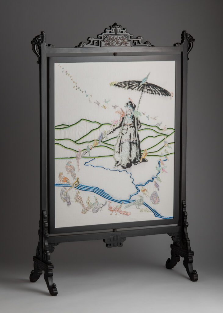 Though he occasionally feels the need to explore avenues of expression beyond that of the needle, the majority of Saja’s work focuses on creating interferences on the formal patterns of French toile through embroidery.