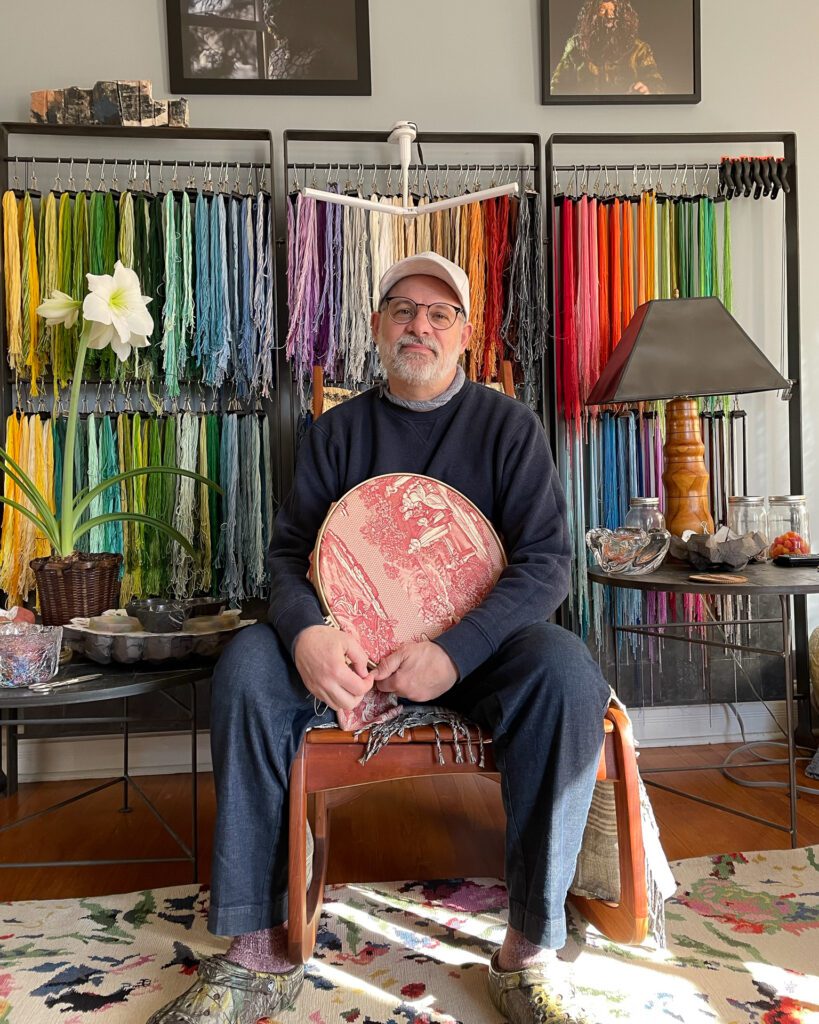Richard’s enduring love and fascination for textiles derives from the absolutely unlimited interplay of pattern, color and texture – there is no other medium where this trinity is so fully realized. He came up with the embellished toile concept while waking from sleep years ago. The original idea was to embroider Maori facial tattoos onto figures in the print but he soon discovered there were no toile prints available where that concept could be realized because of the relatively small scale of nearly all toile prints. He thus amended the concept slightly to include any and all embellishment. Historically, toile de Jouy is a print that through its dense repetition becomes anonymous. It’s a tabula rasa begging for context not unlike a child’s coloring book. The act of selectively embellishing small areas of it automatically inverts its historical usage: suddenly the anonymity of the print is broken and it evolves through its subversion which appeals greatly to Richard. With an economy of means, a whole new context is created. There is another story there, it just needs to be drawn out.