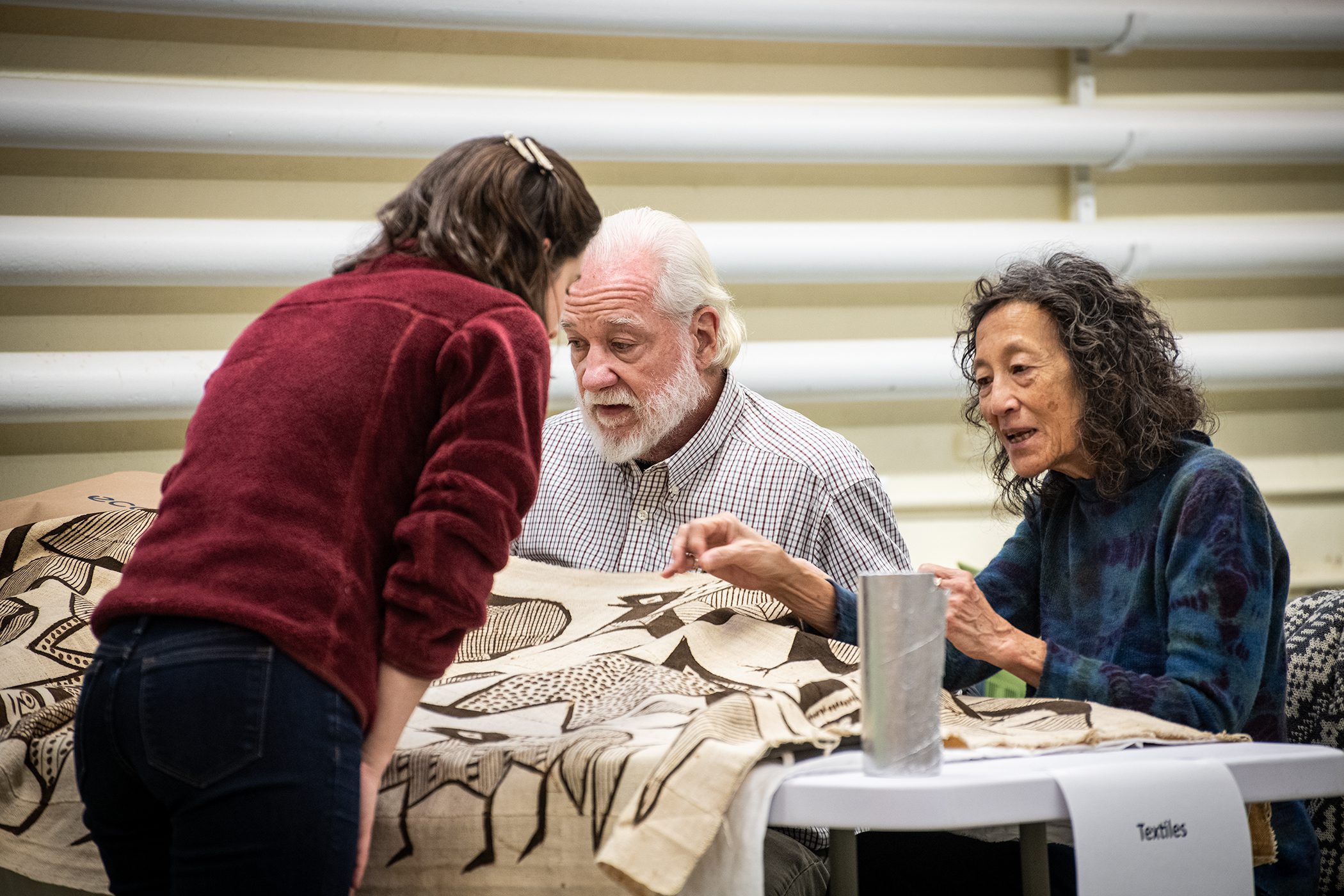 Gail Bush, Winterthur textile conservation volunteer, and Matthew Monk, Linda Eaton Associate Curator of Textiles, examine the Gees Bend quilt. Photo by Azuree Holloway.
