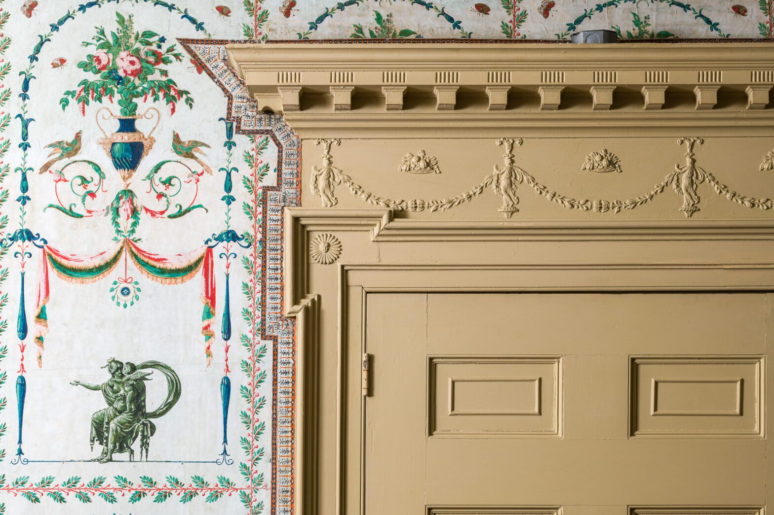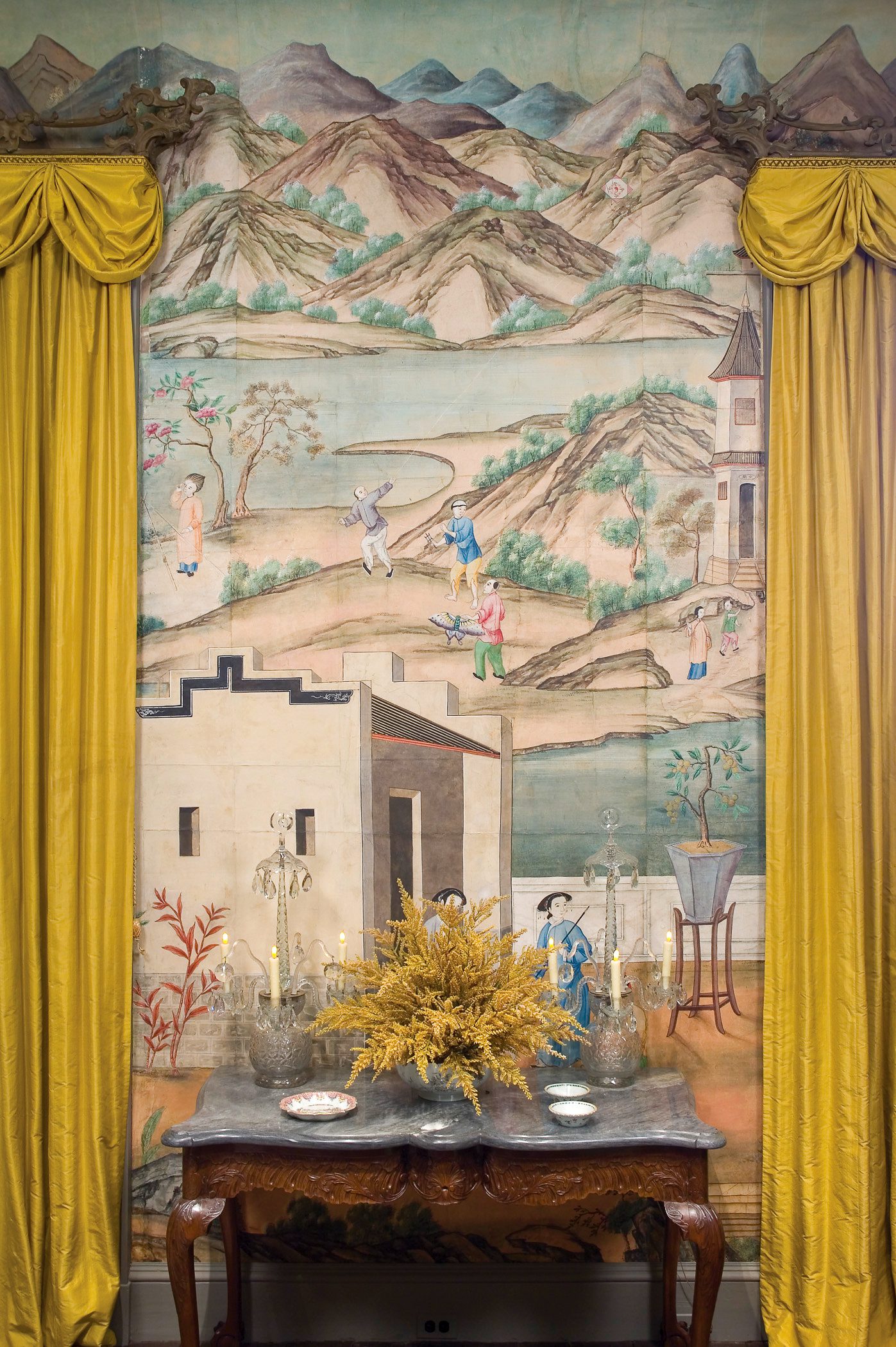 The concert champêtre wallpaper in this room was made near Lyon, France, between 1783 and 1810. A genre of 16th-century painting, this style emphasized entertainment and refreshment in a picturesque setting, and by the 18th century, women were prominently featured along with allegorical or mythological figures. As part of Winterthur’s House Lighting Project in the late 1990s, all fifteen wallcoverings in the museum were cleaned and conserved. The lighting project included moving a water main. It failed, and water flowed down the interior walls of Winterthur, severely damaging this lovely example of French wallpaper.
