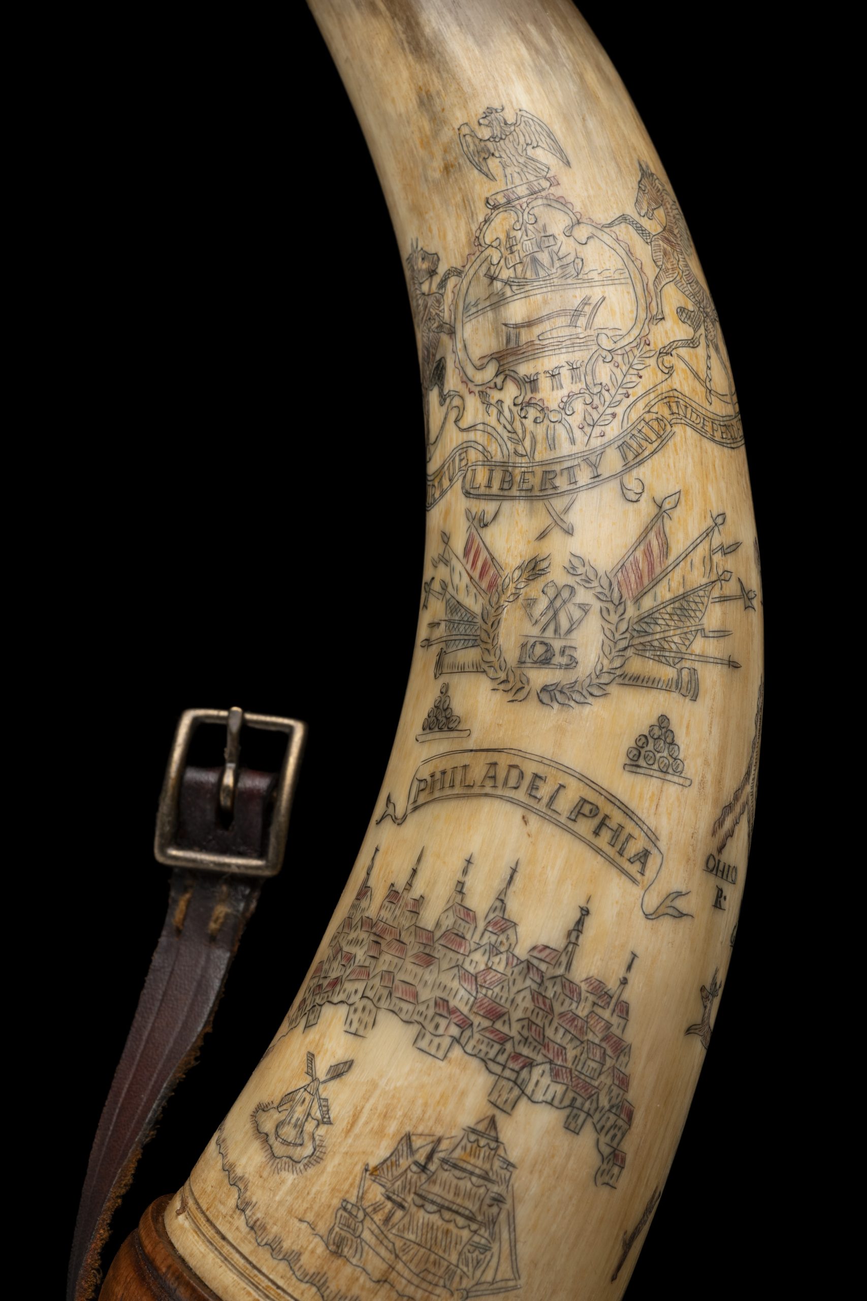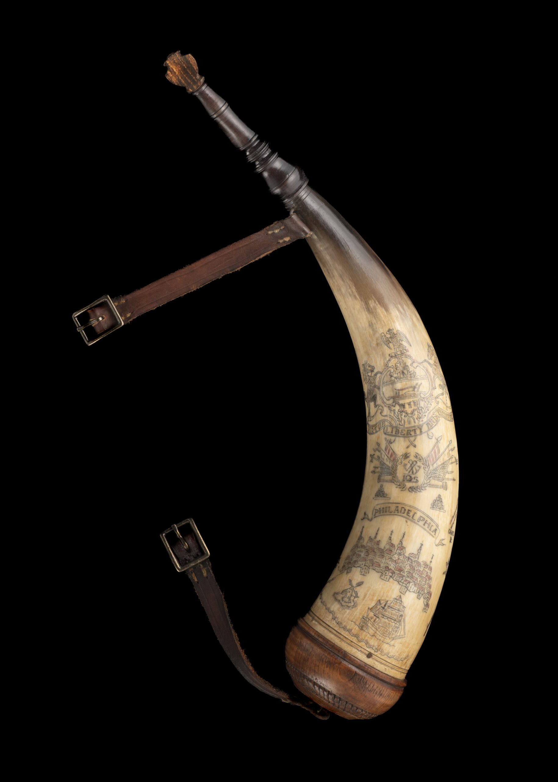 The Pennsylvania commission offered a full commemorative set including a powder horn bearing the state seal (see fig. 2). Although he is not mentioned in the promotional material, master hornsmith Roland Cadle also assisted with the project.  When I lectured at the Hornsmith Guild’s annual meeting in 2024, Roland Cadle learned of Winterthur’s newly acquired longrifle. He was moved to reprise his role from nearly fifty years ago and donate a powder horn to the museum (see fig. 3). He carved a historically accurate Lancaster-style screw-tip horn with polychrome decoration. He included the seal and colonial landmarks from Fort Pitt to the city of Philadelphia and personalized it with the rifle’s “105” and the Winterthur “W” (see fig. 4). To complete this set, he also made a fringed hunting pouch.