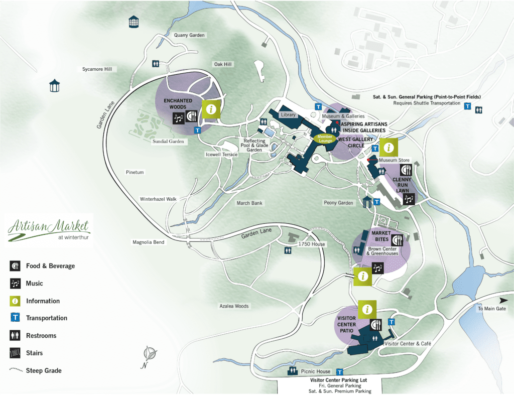 Guests will receive a map upon arrival, but here is a handy reference for you to explore in advance and note where all the vendor areas and activities are located, as well as transportation stops, food and beverage spots, water bottle refill stations, and restrooms. Have more questions? See our Artisan Market Guest FAQ.