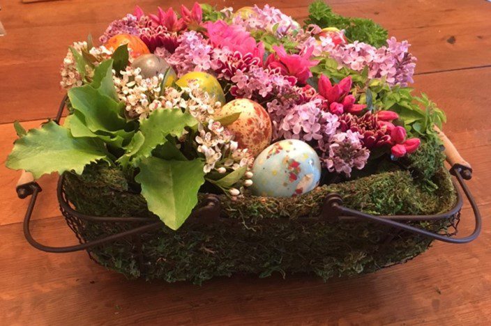 Design a basket filled with flowers, plants, and eggs. This pavé style is thick, with densely filled in geometric rows giving the design a distinctive look. Join Heidi Militana, floral design supervisor, for this spring-themed arrangement. $75; $65 for Members