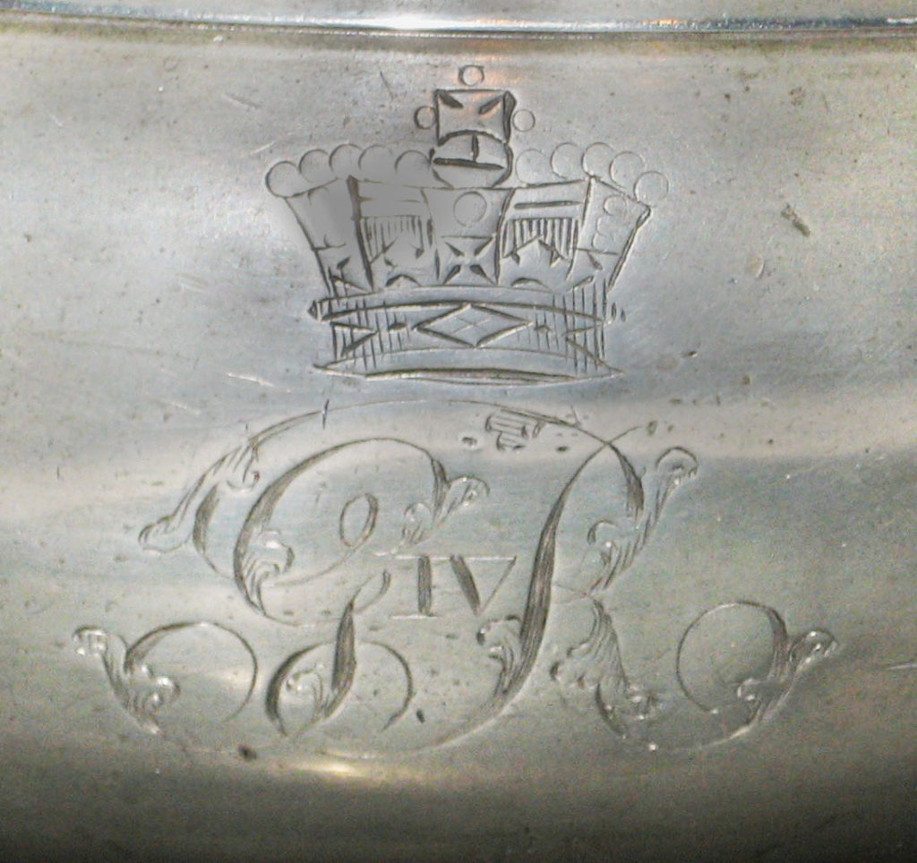 One of the tureens that came to Winterthur as part of the Campbell Collection is from a group of pewter tureens and other tableware created for the banquet following the 1821 coronation of George IV. The banquet’s menu featured turtle soup, which may have been served in this very tureen. The Observer reported that crowds plundered the tables of the coronation banquet, taking the pewter dishes like this one marked for the sovereign. It bears the inscription “G IV R” below a crown. Unlike the objects above, which were souvenirs made for purchase, this object was made for use during the coronation festivities, and it was acquired by someone who decided to keep it without permission.