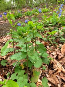 Garlic Mustard with native Virginia BluebellsVisible- round, toothed leaves and cruciform, white flowers