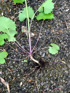 At this point in the development of the plant, I can usually compost it without issue. If composting isn’t an option, and I have to leave the plants behind, I’ll take my bunch of pulled plants and prop it up against a tree with the roots in the air so that the plants dry out and die without re-rooting.