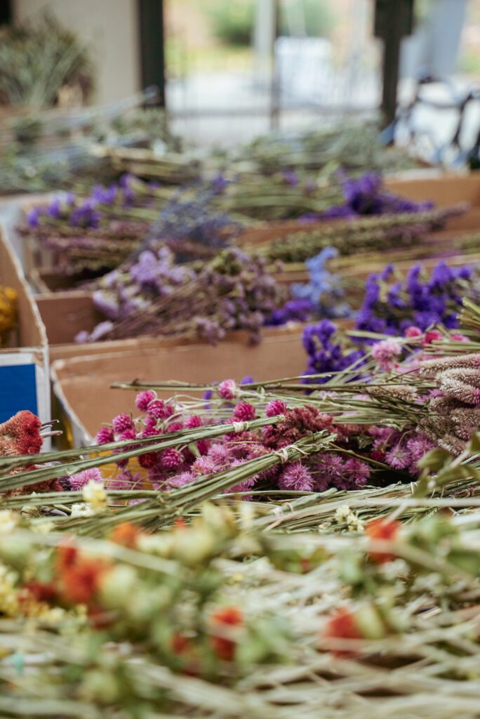 - Dry flowers in several stages of bloom: buds, partially open, fully open, and some with foliage.