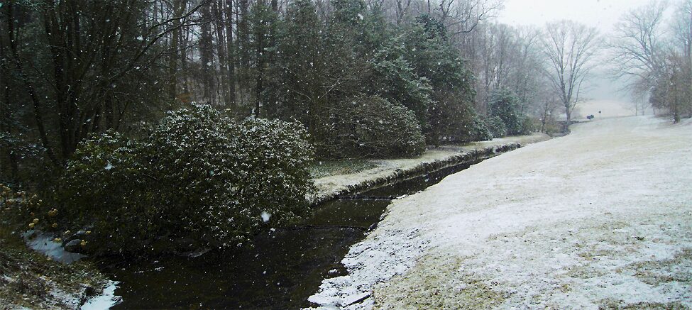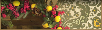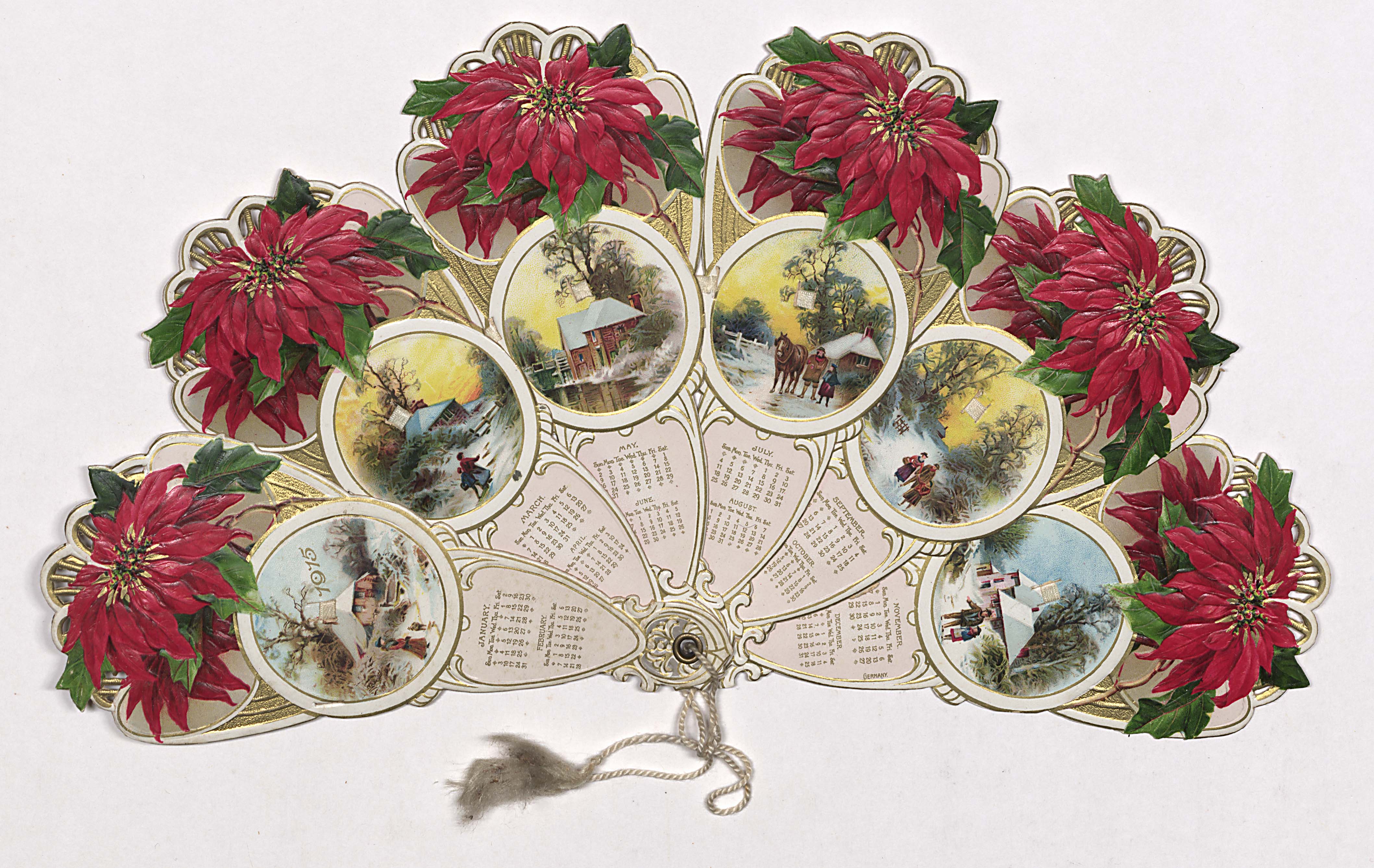 Calendar fan for 1915, showing poinsettias and rural snow-laden scenes