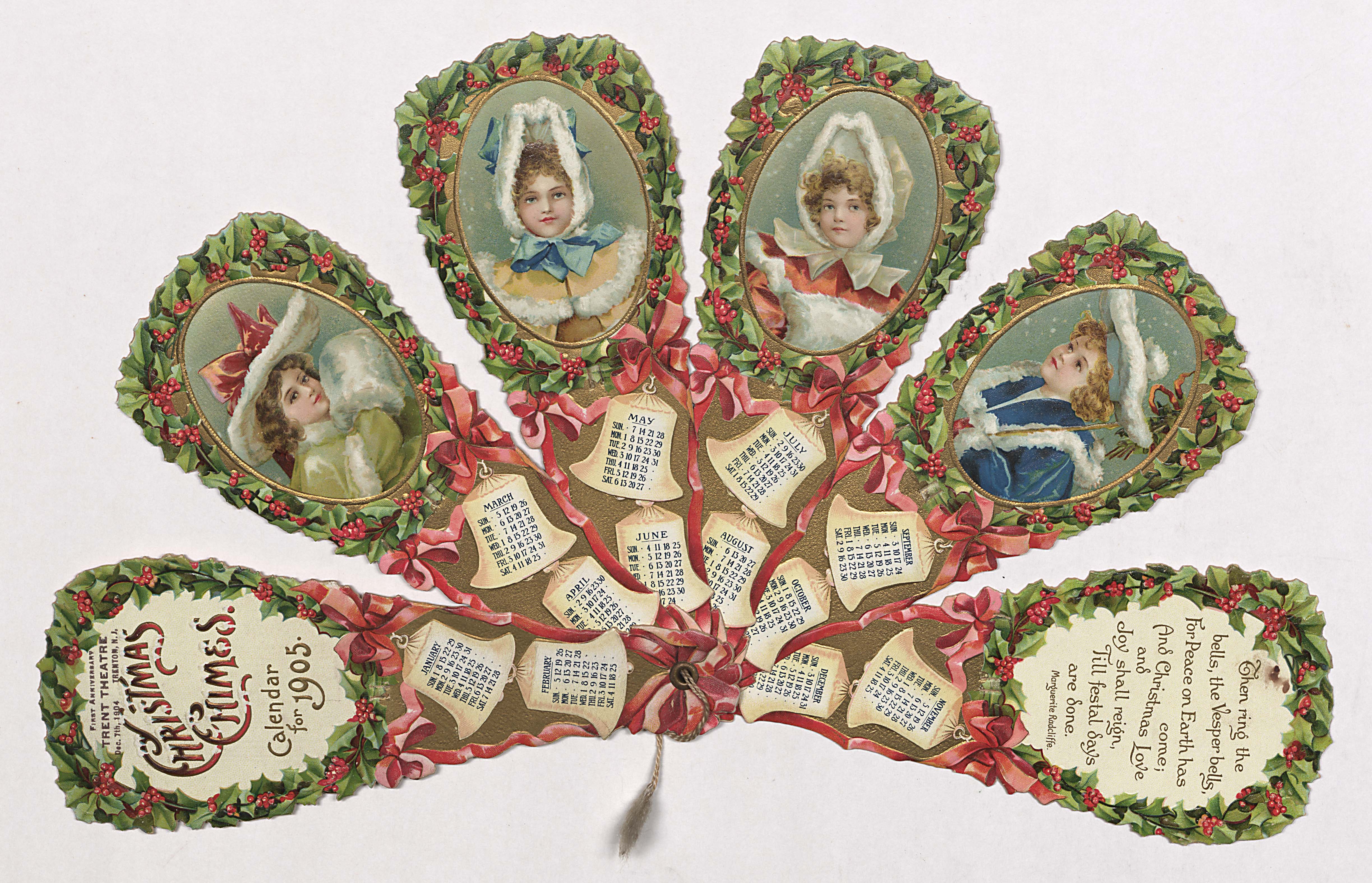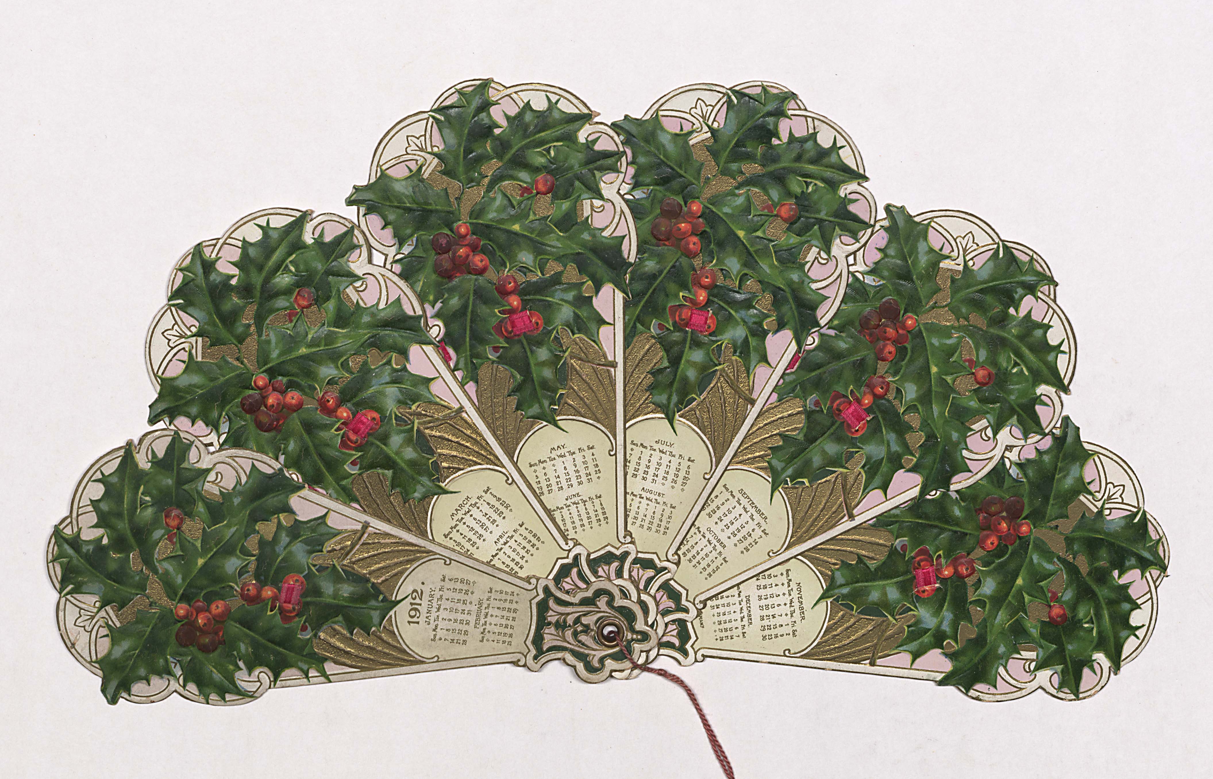 Calendar from 1909 most likely circulated at the end of 1908, judging from the abundant Christmas holly used for illustration.