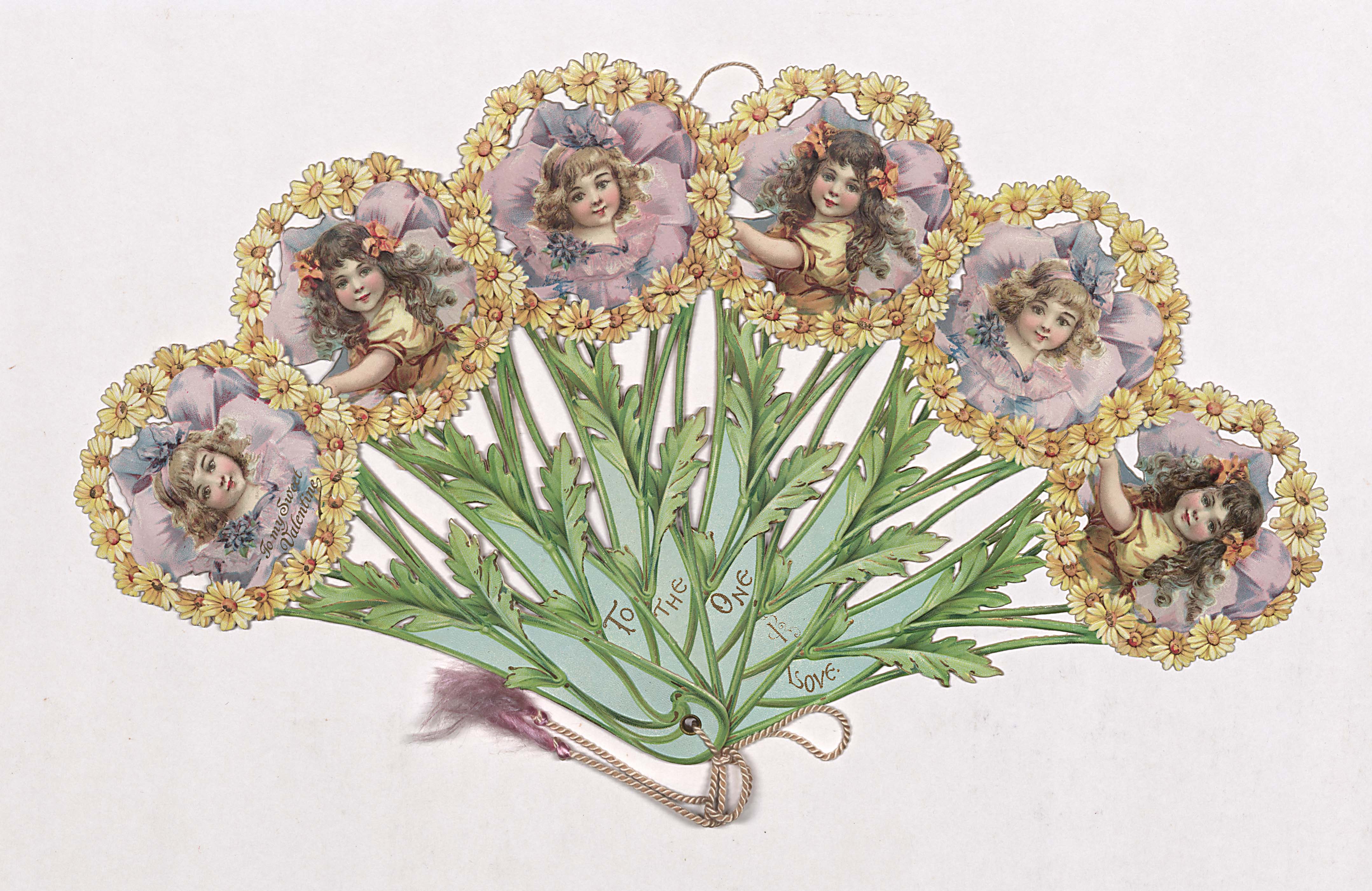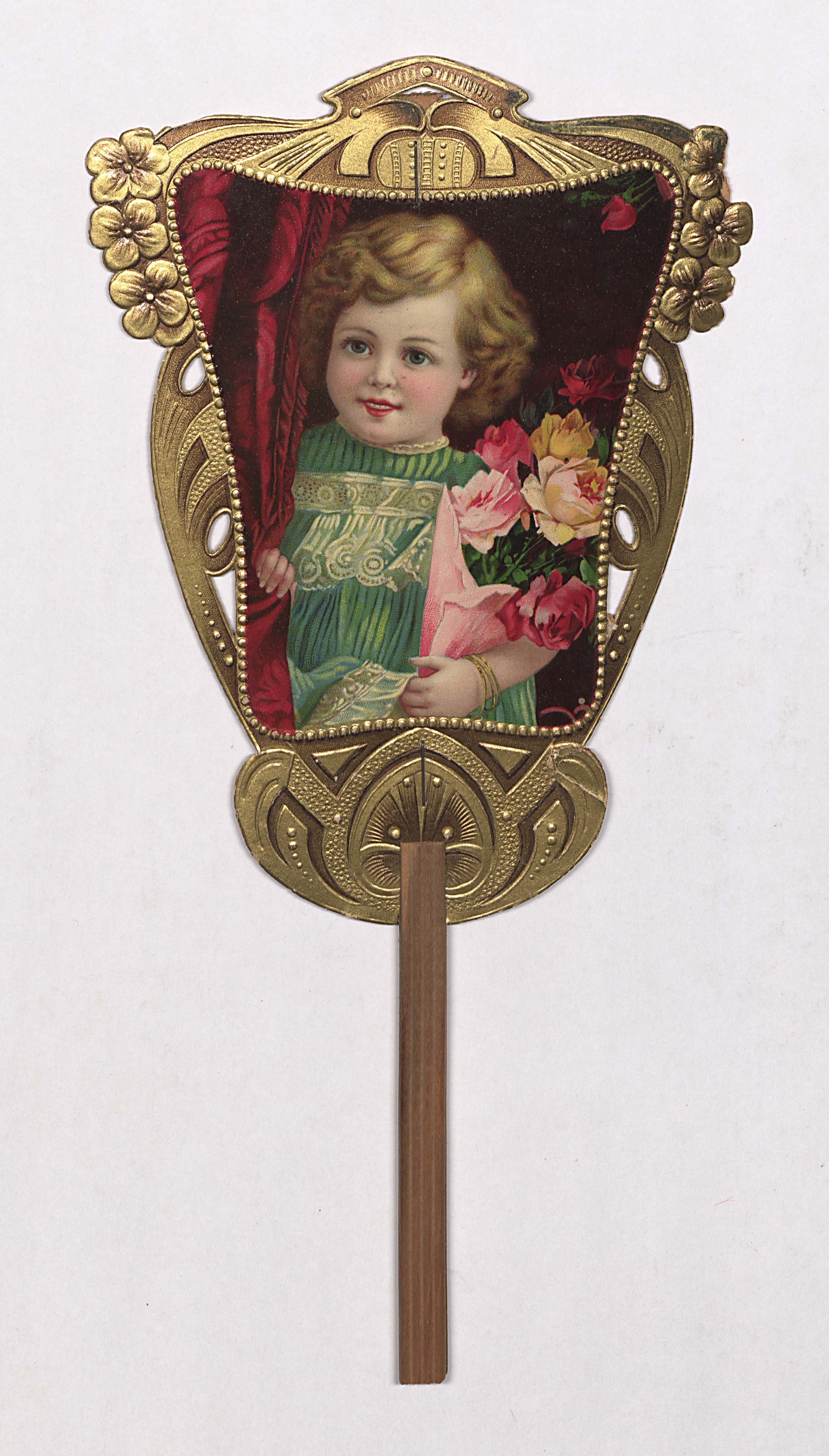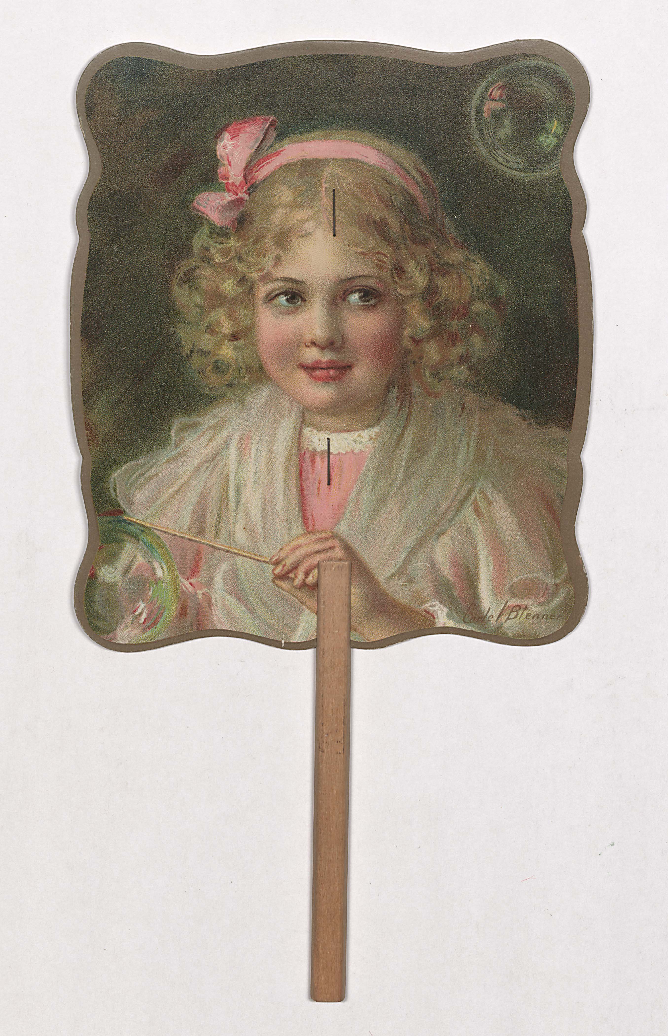 Stock fan showing a portrait of a young girl used by Frederick Loeser & Co., Brooklyn, New York. The portrait, by Carle J. Blenner (1862‒1952), depicts a girl blowing bubbles. It was adapted from a 30" x 24" painting by Blenner that was auctioned in 2009. For the other side, see Image 53.