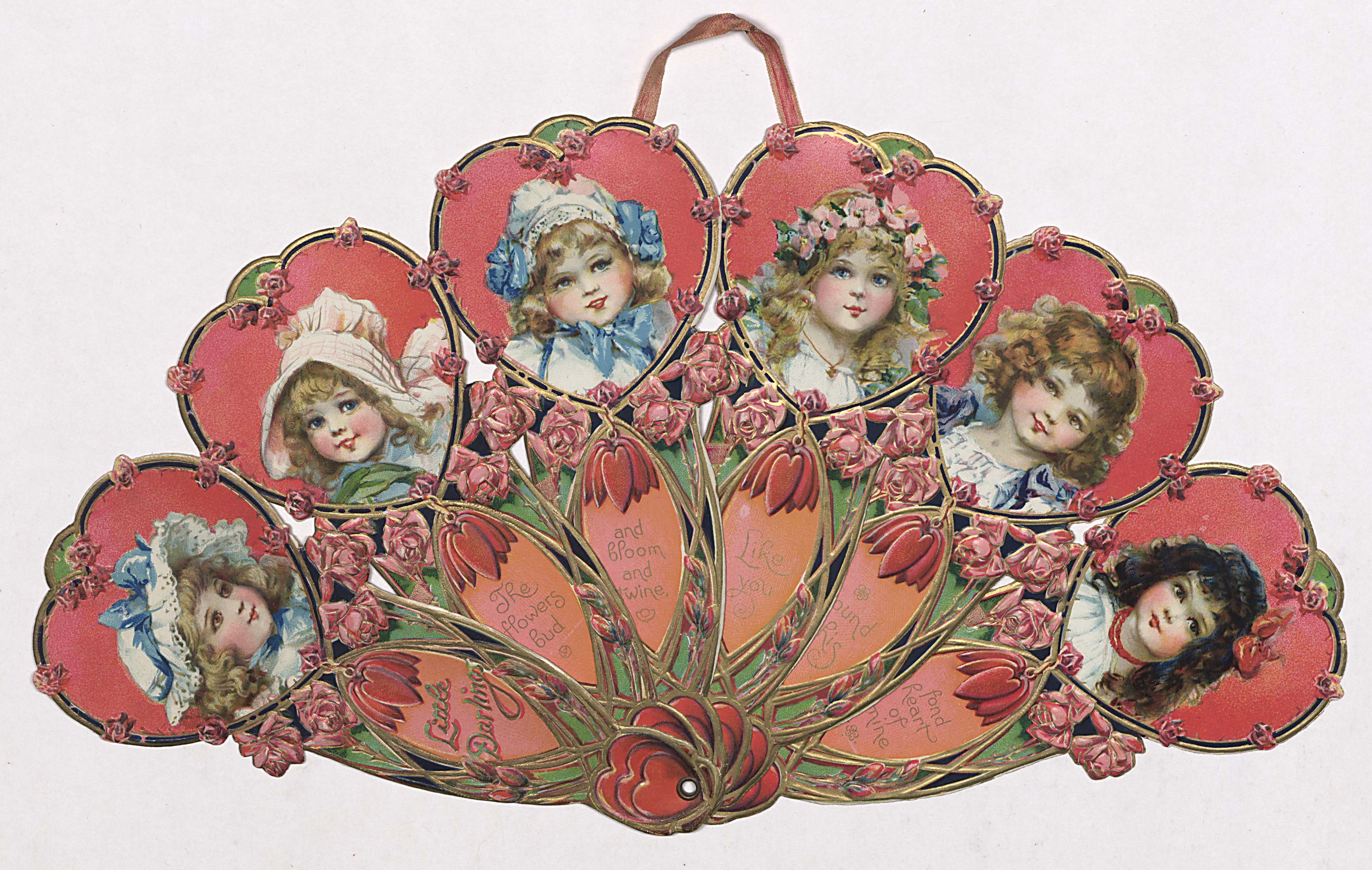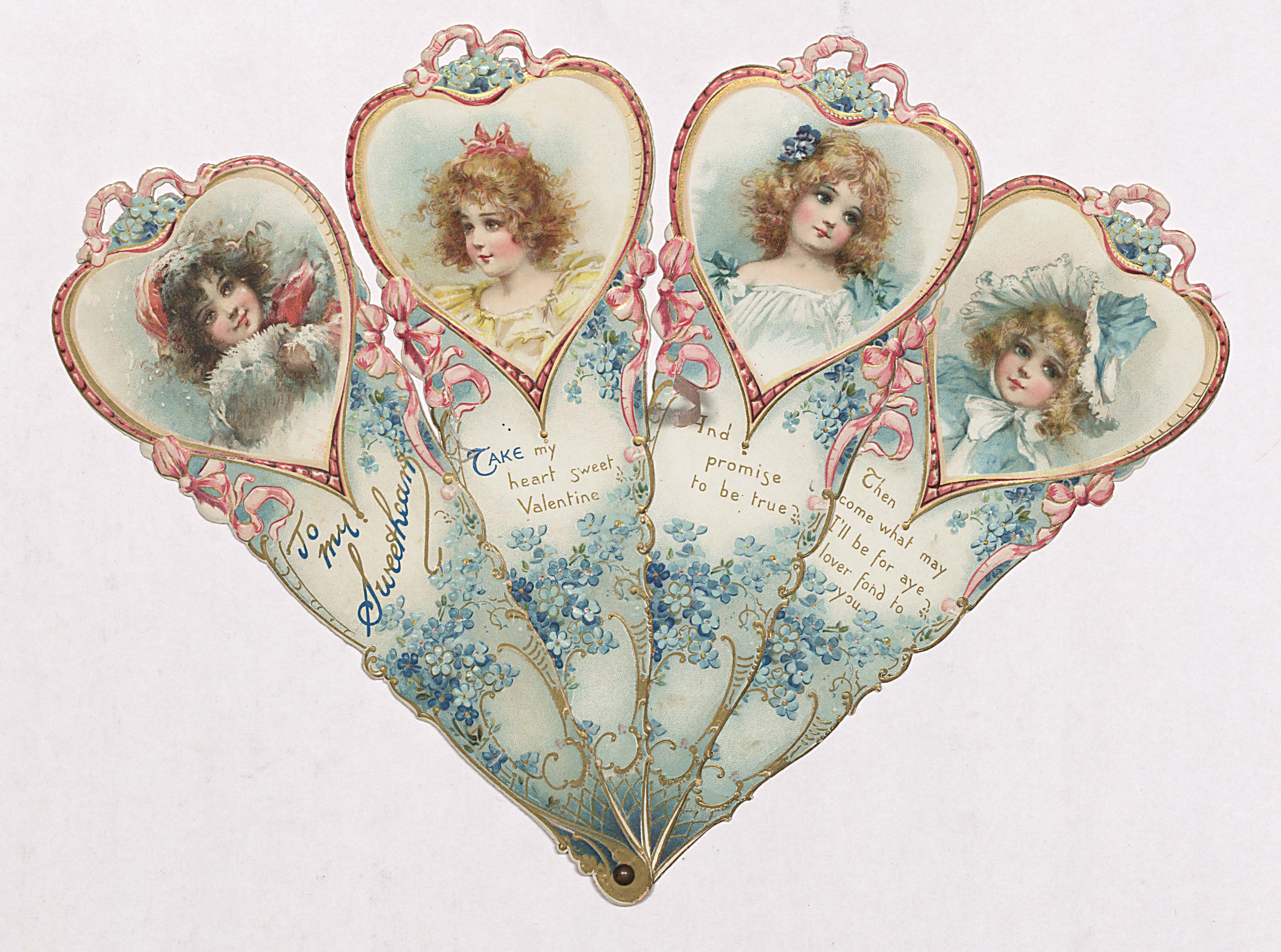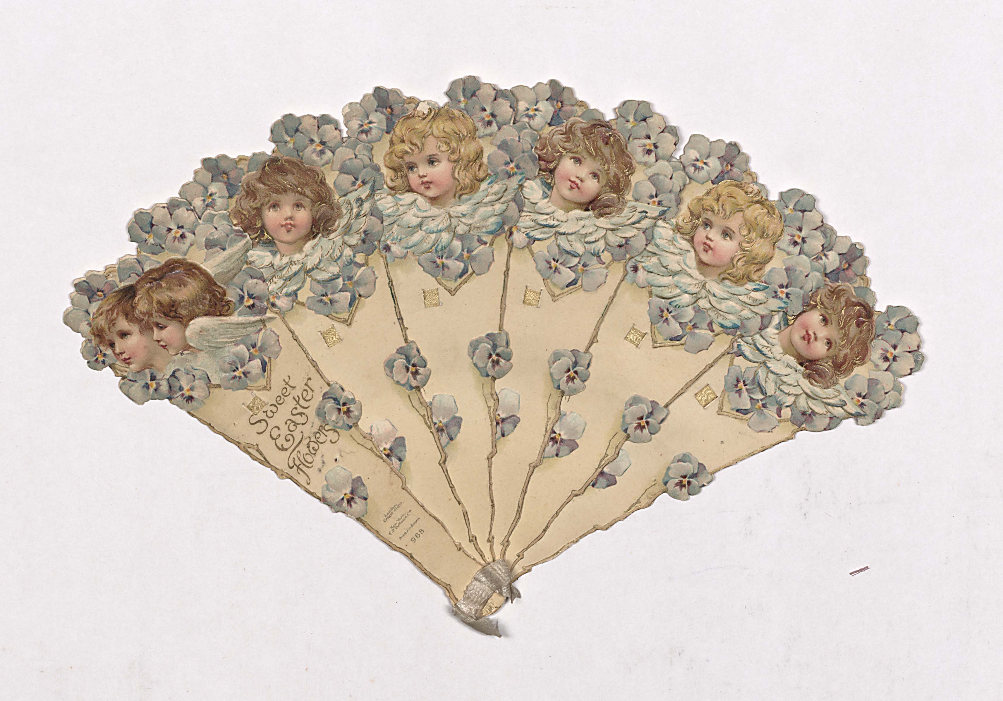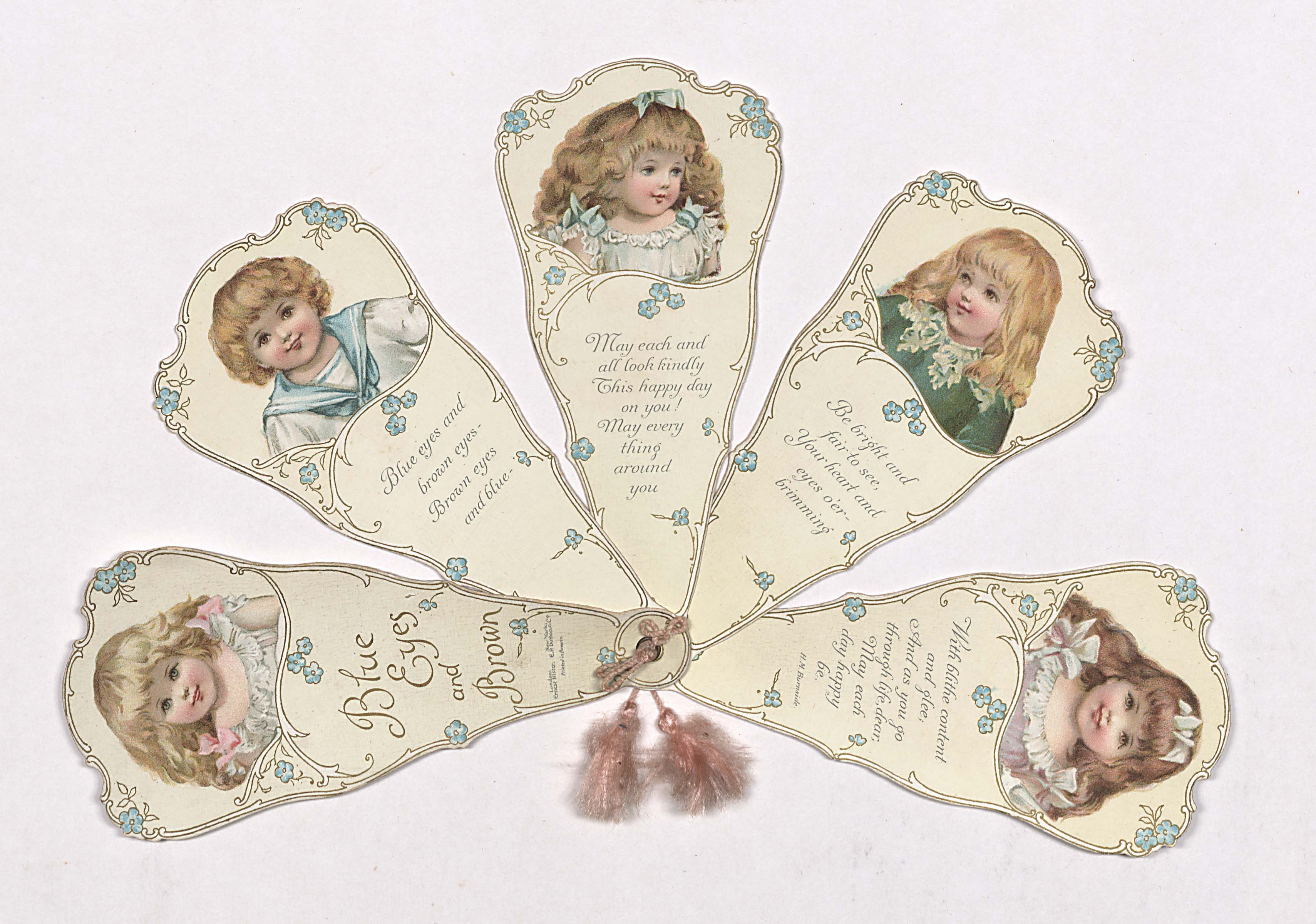 Stock fan showing a portrait of a young girl used by Frederick Loeser & Co., Brooklyn, New York. The portrait, by Carle J. Blenner (1862‒1952), depicts a girl blowing bubbles. It was adapted from a 30" x 24" painting by Blenner that was auctioned in 2009. For the other side, see Image 53.
