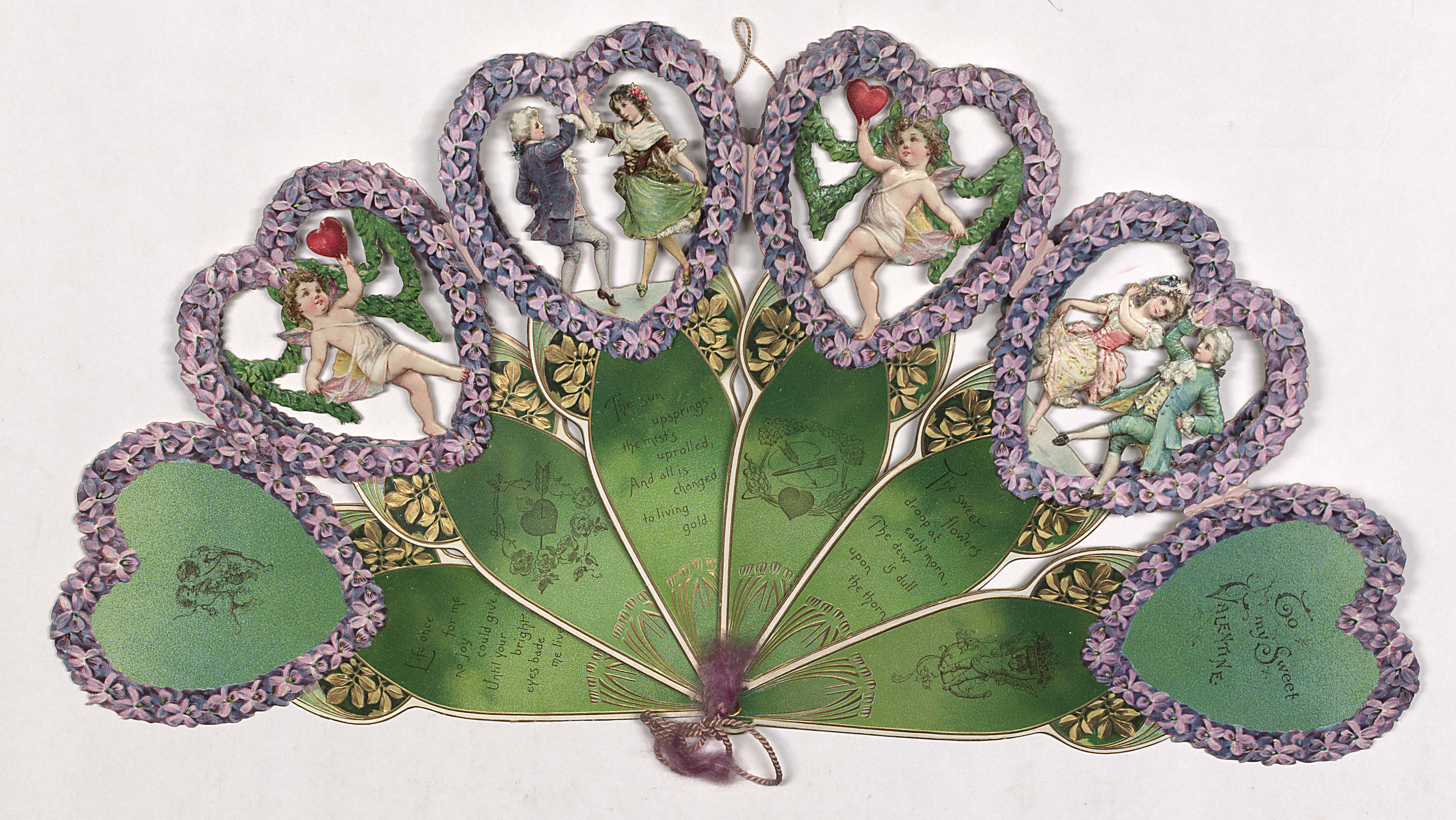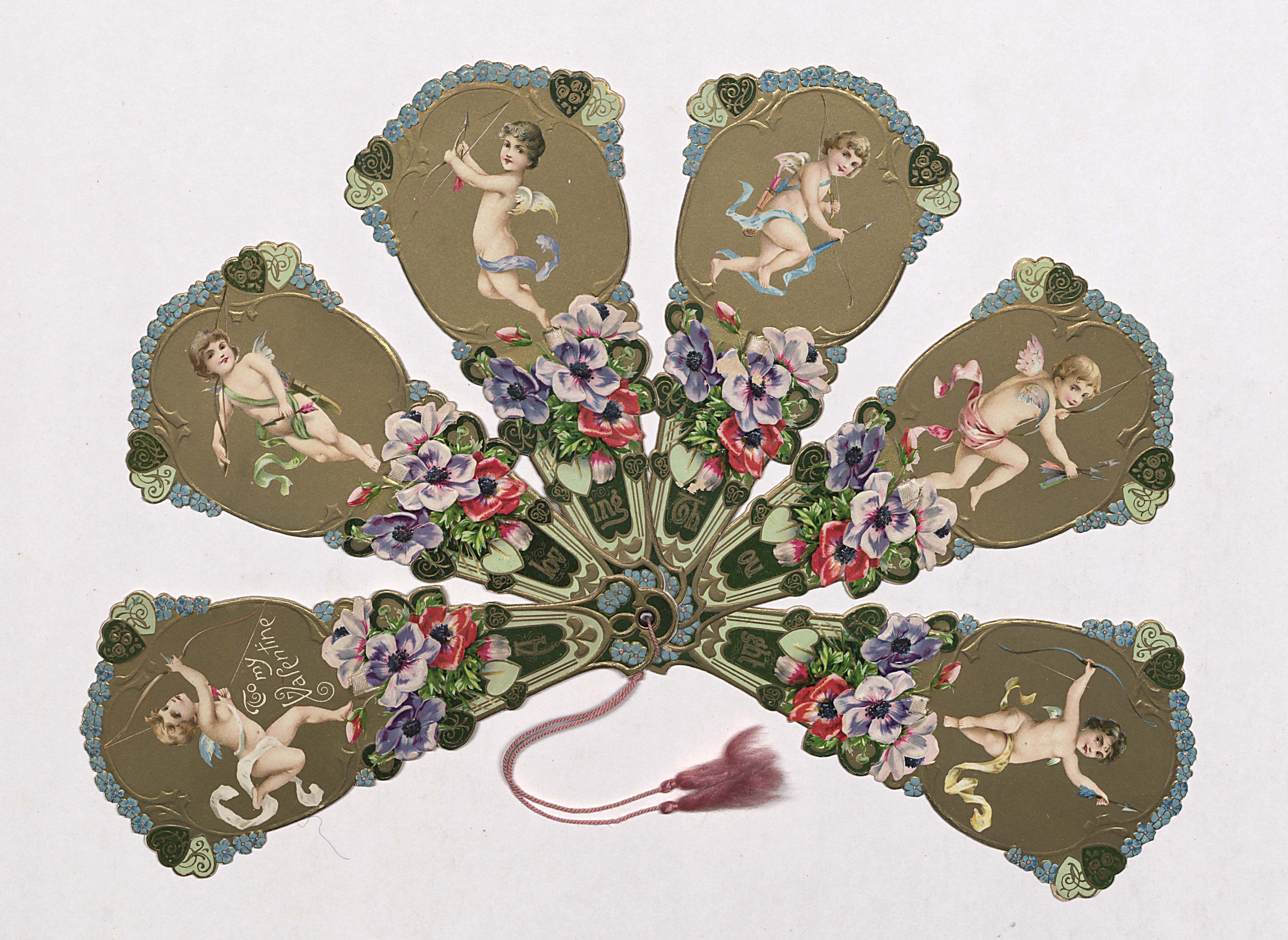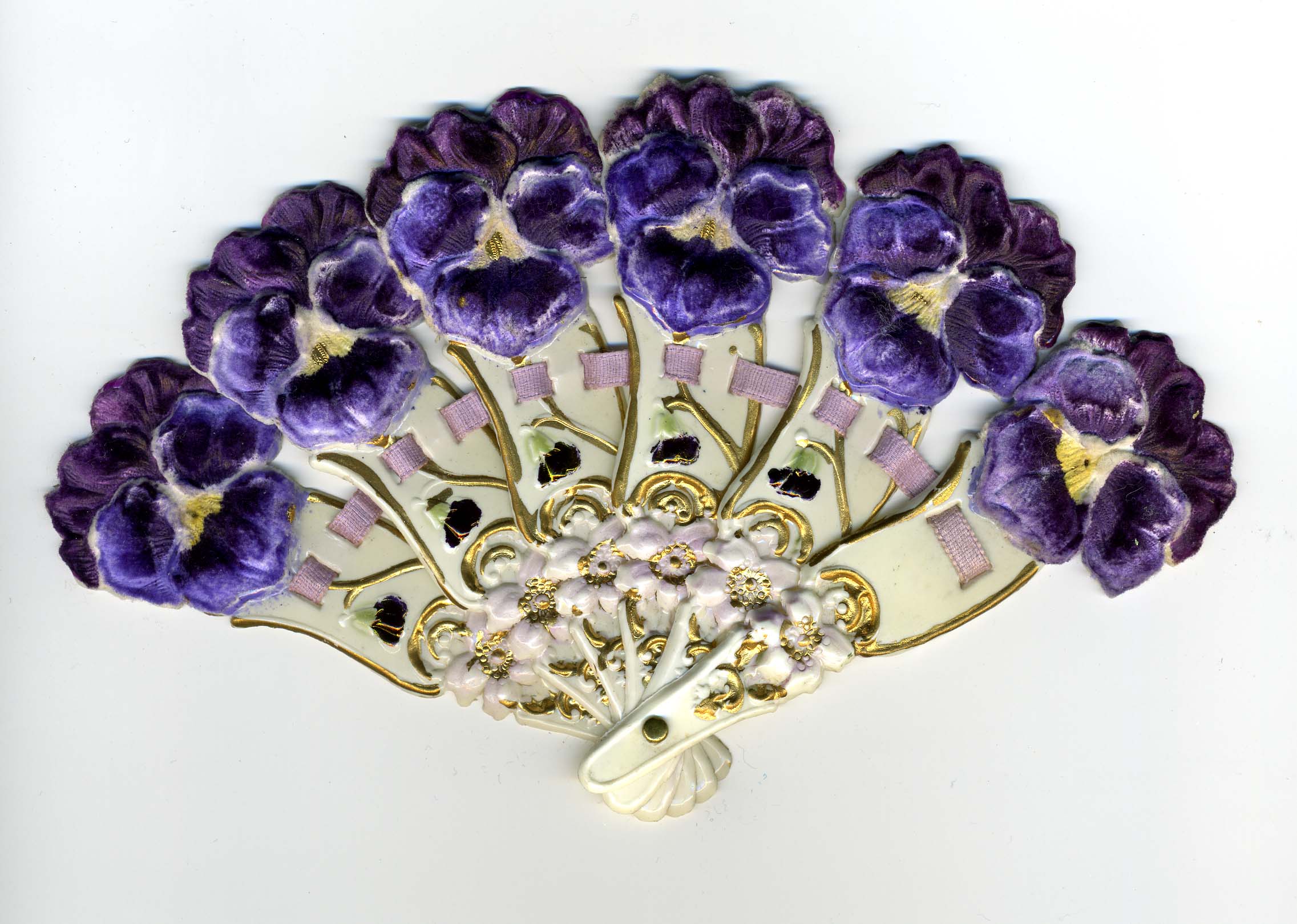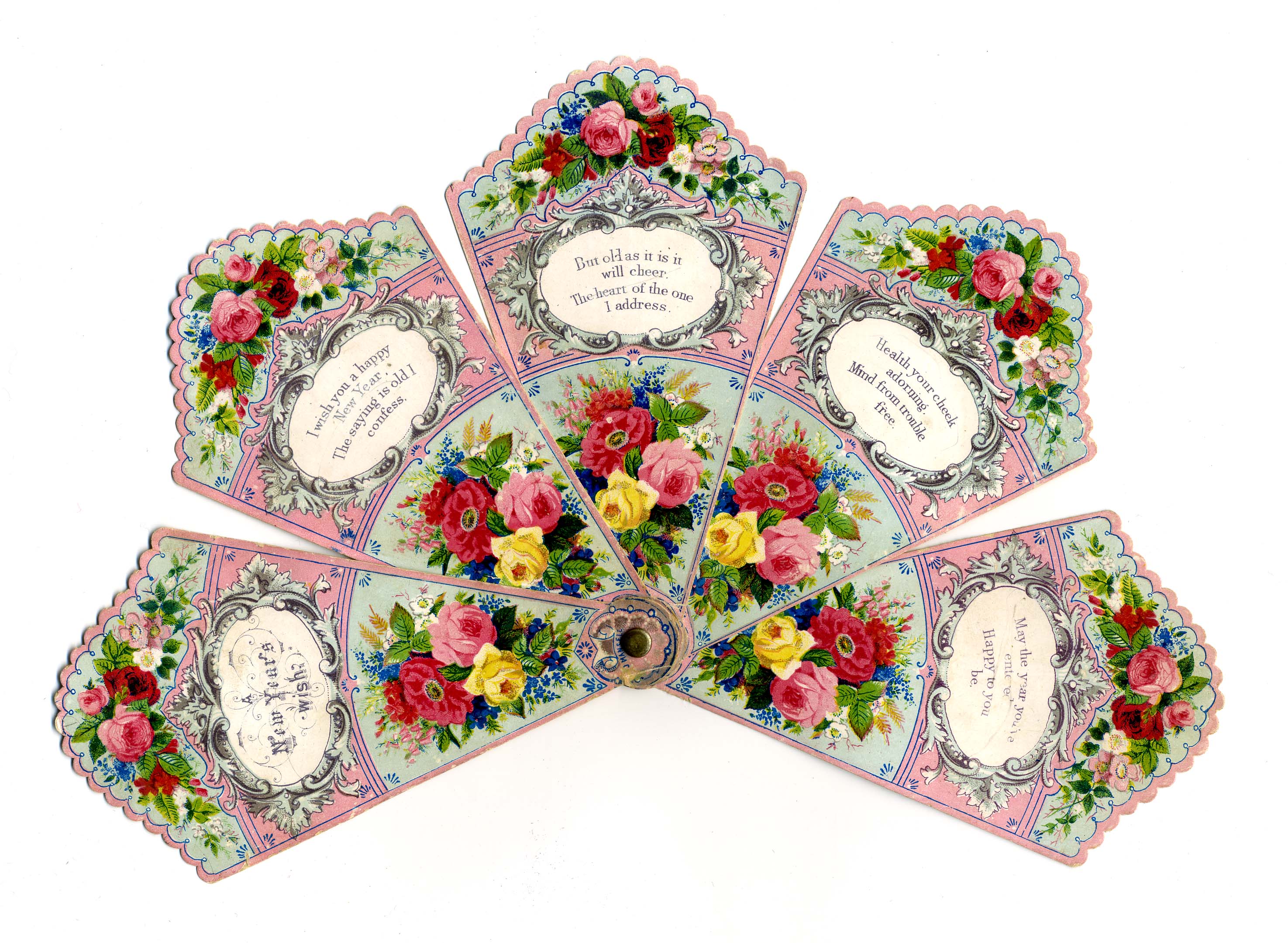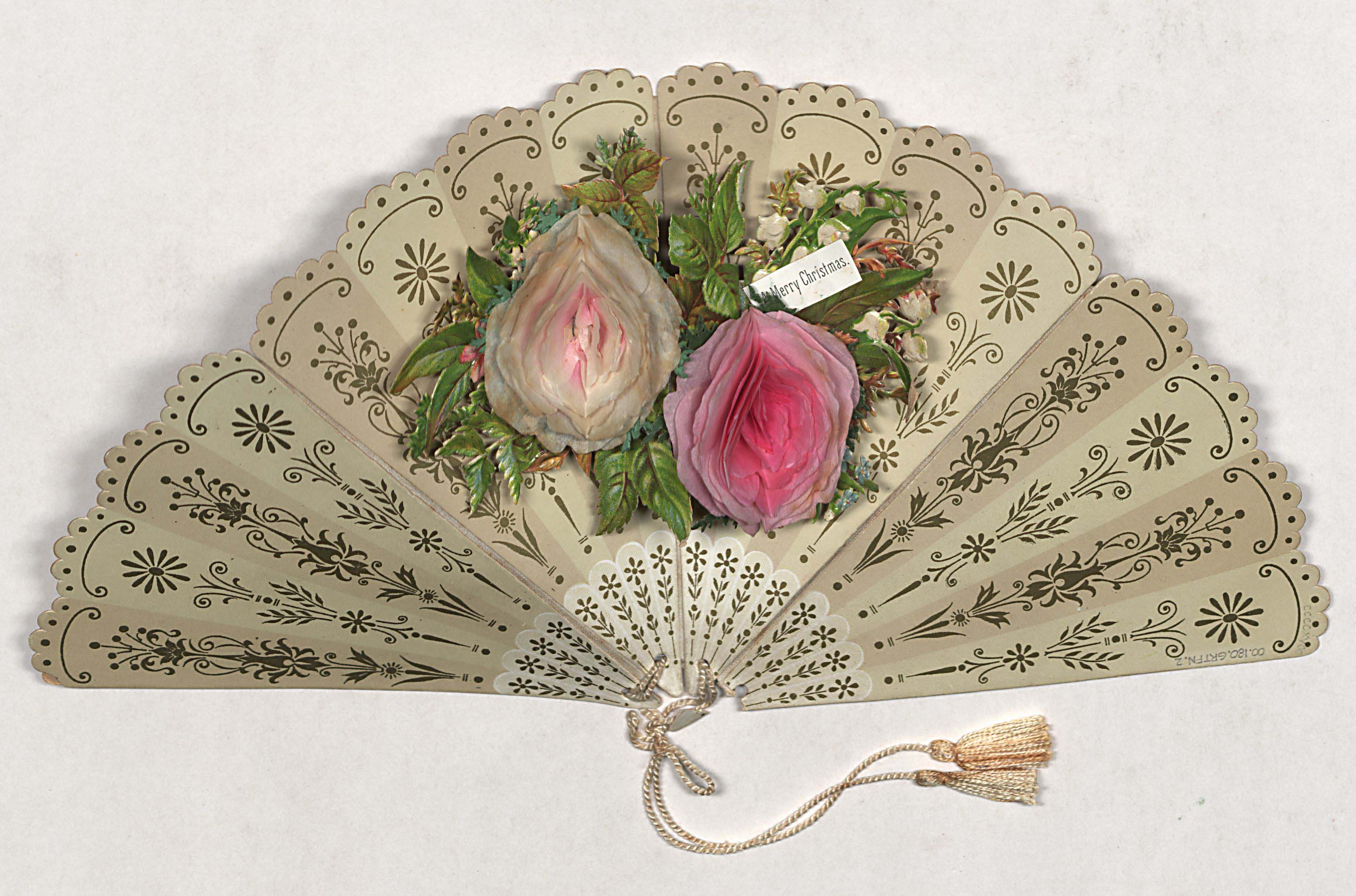 Hand fan that opens to reveal a three-dimensional pair of roses.
