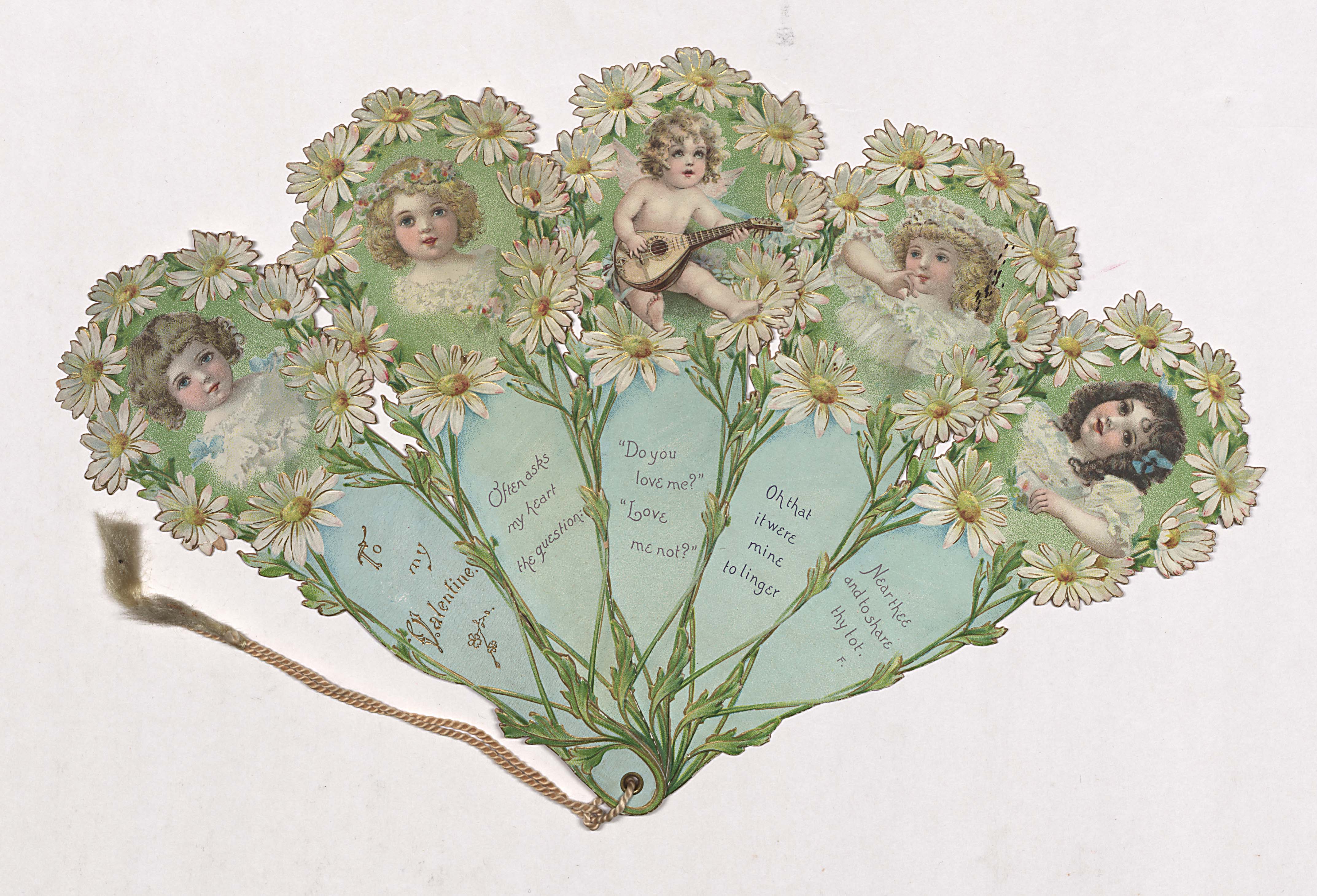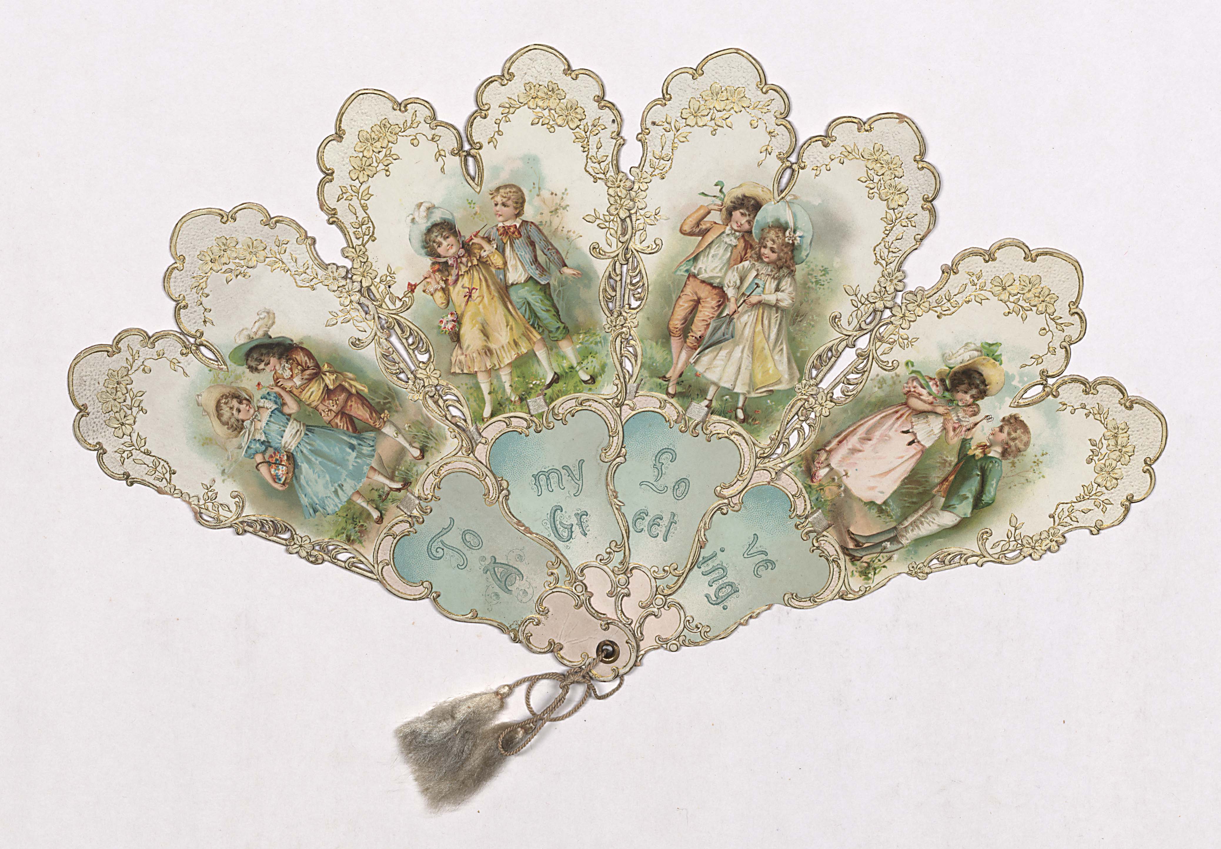 Hand fan showing a young girl wearing a green dress and carrying a bouquet of flowers. For the other side, see Image 51.