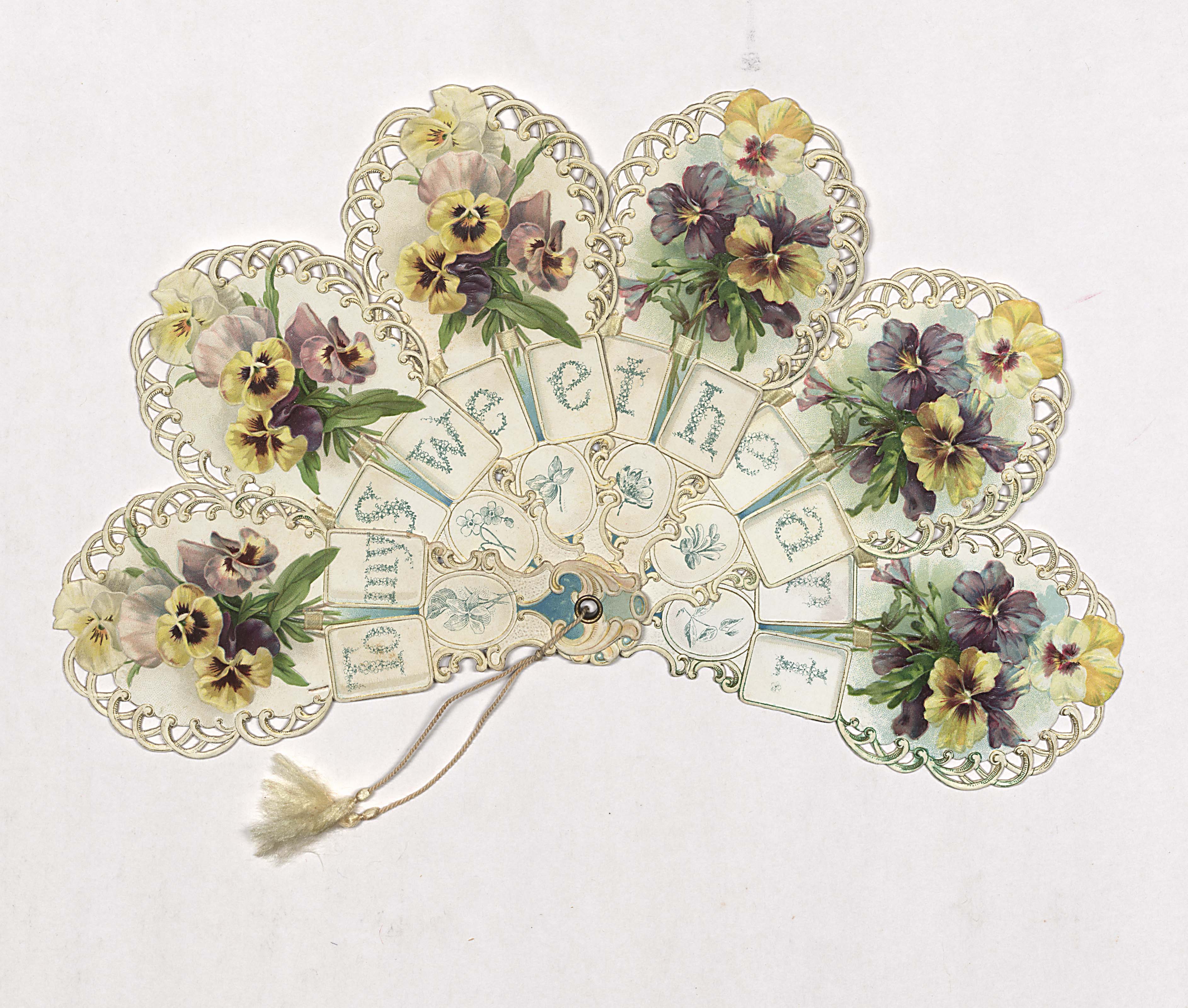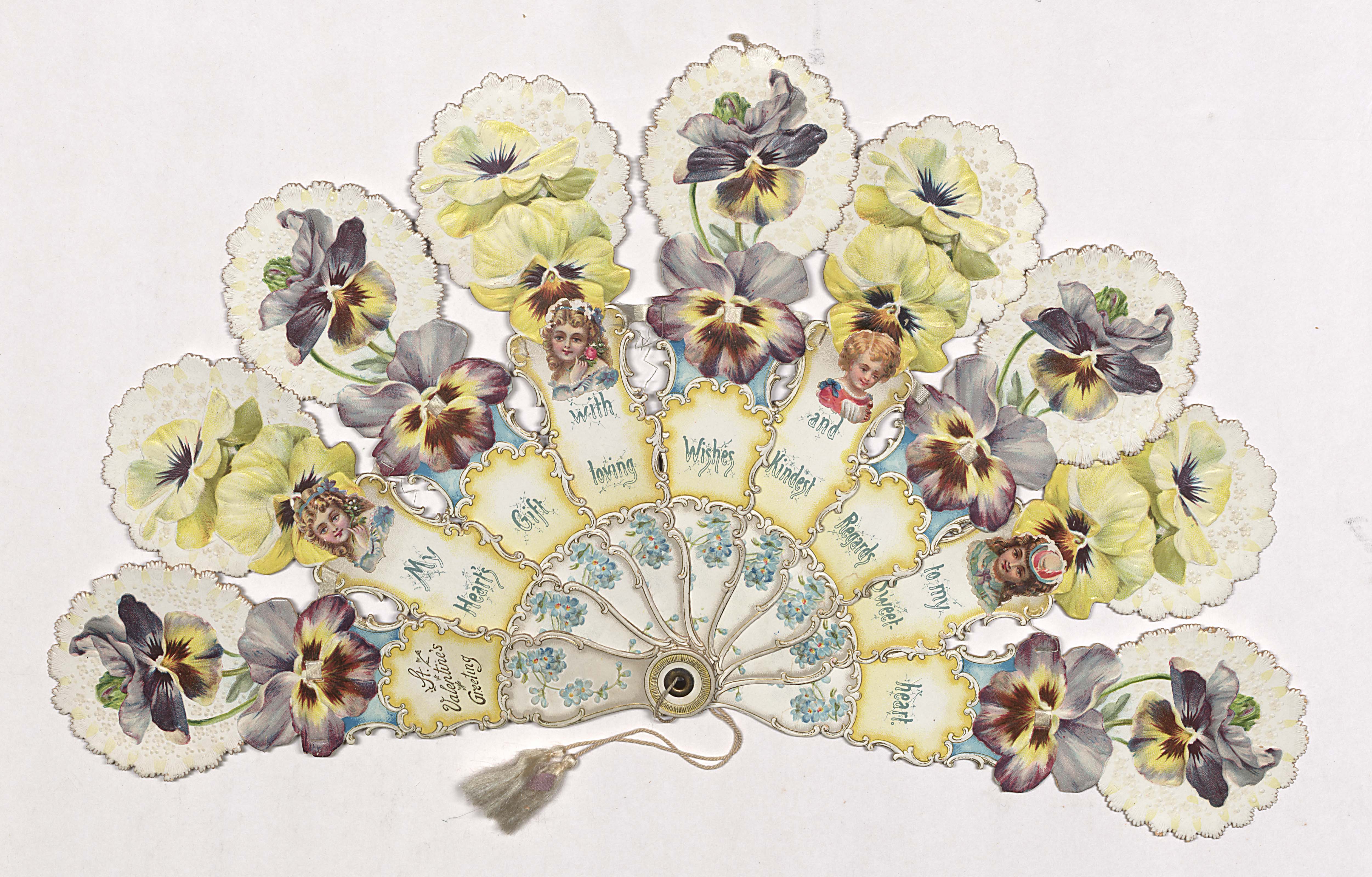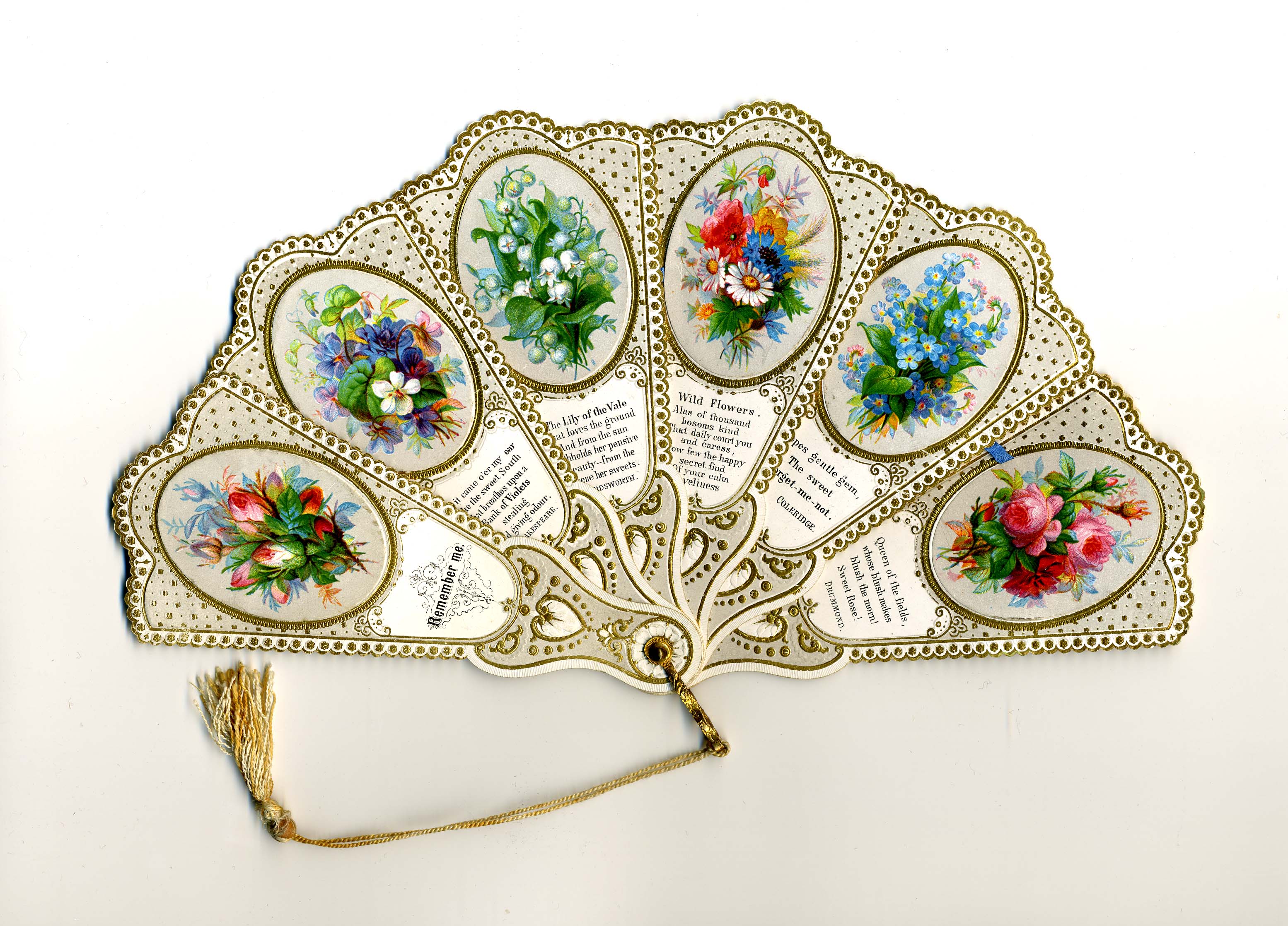 This fan shows, on one of its sides, seven different flowers: China Aster, Cowslip, Blue Bell, Pansy, Forget-Me-Not, Convolvulus, and Moss Rose and includes accompanying verse. For the other side, see Image 66.