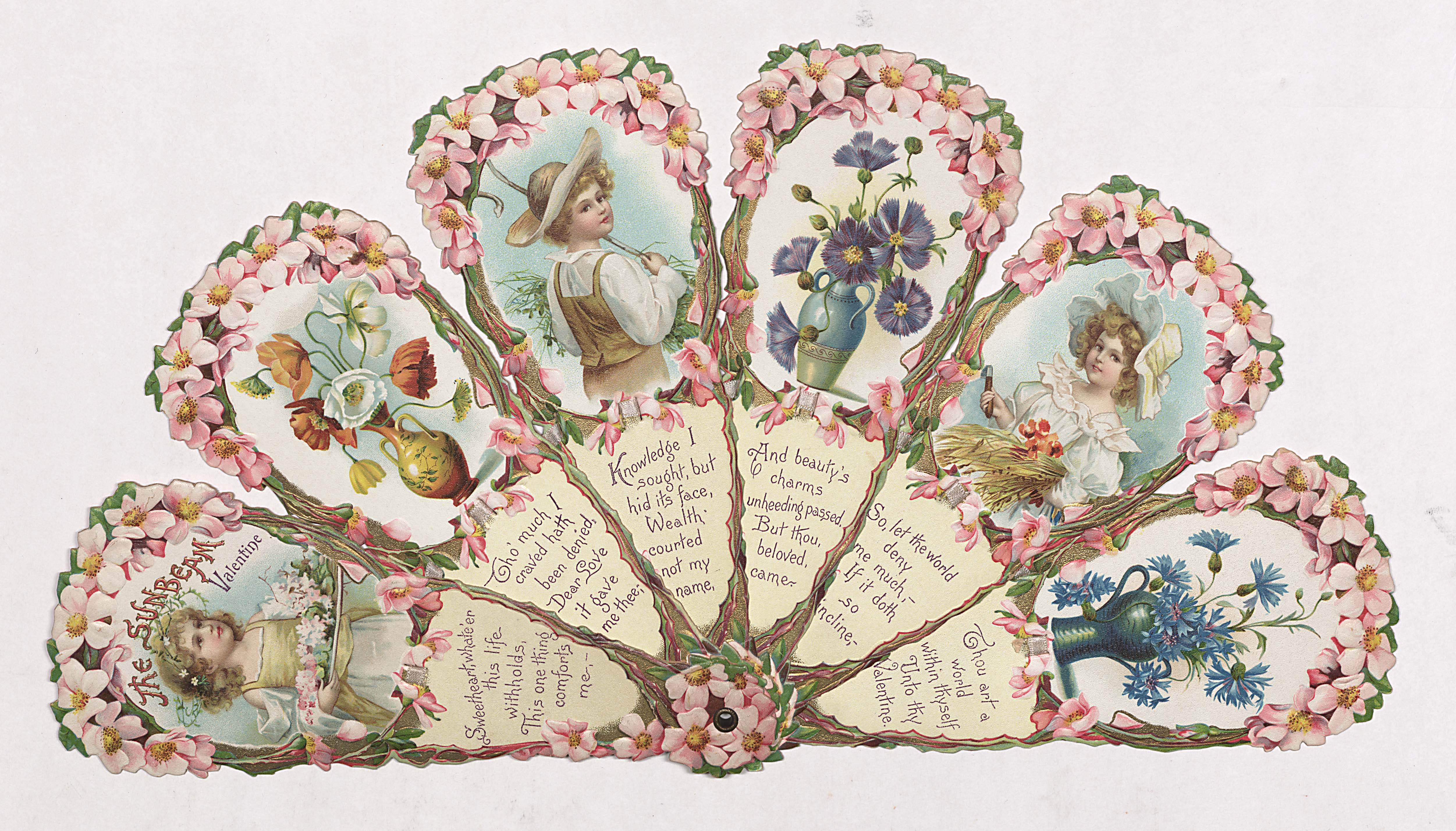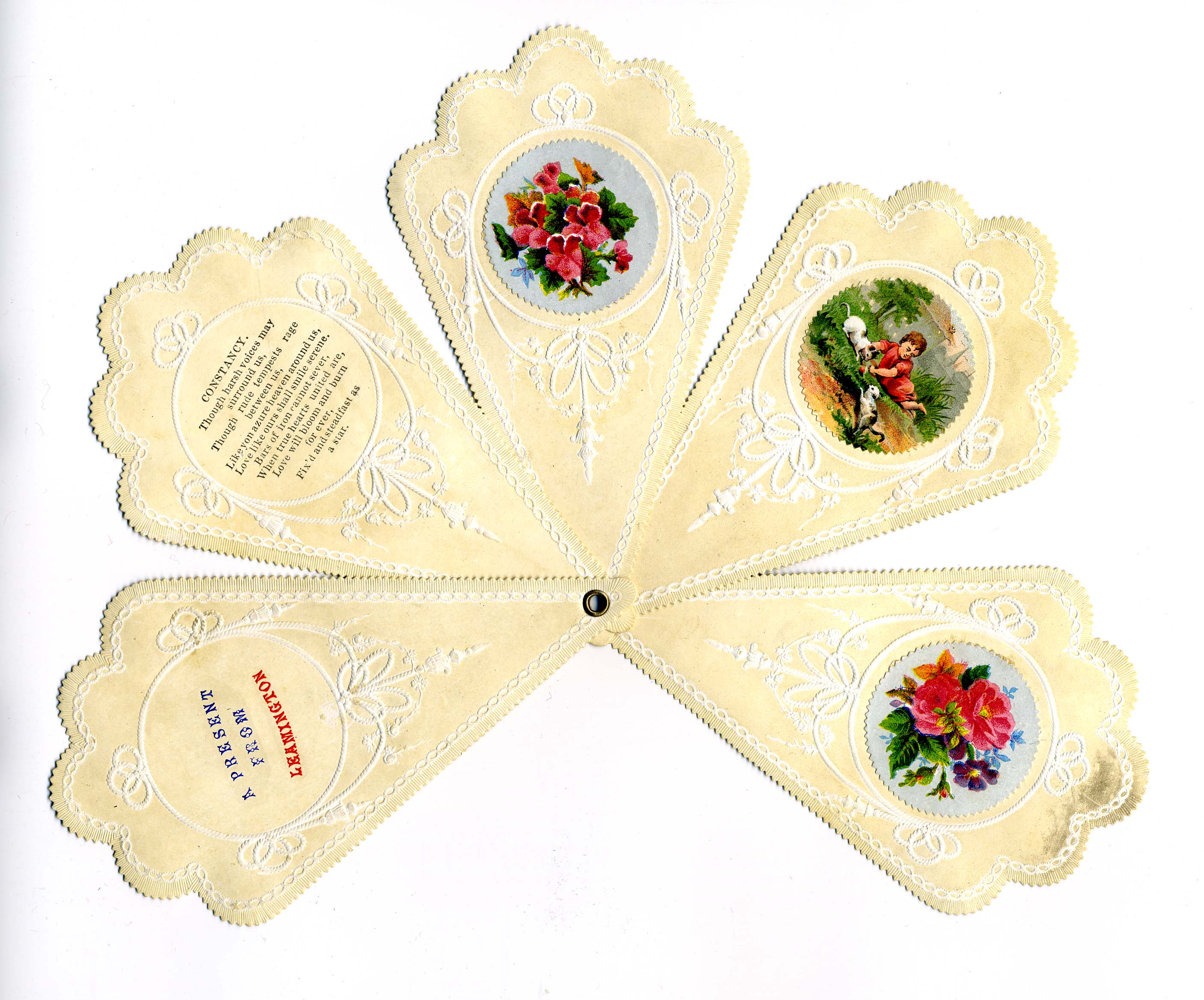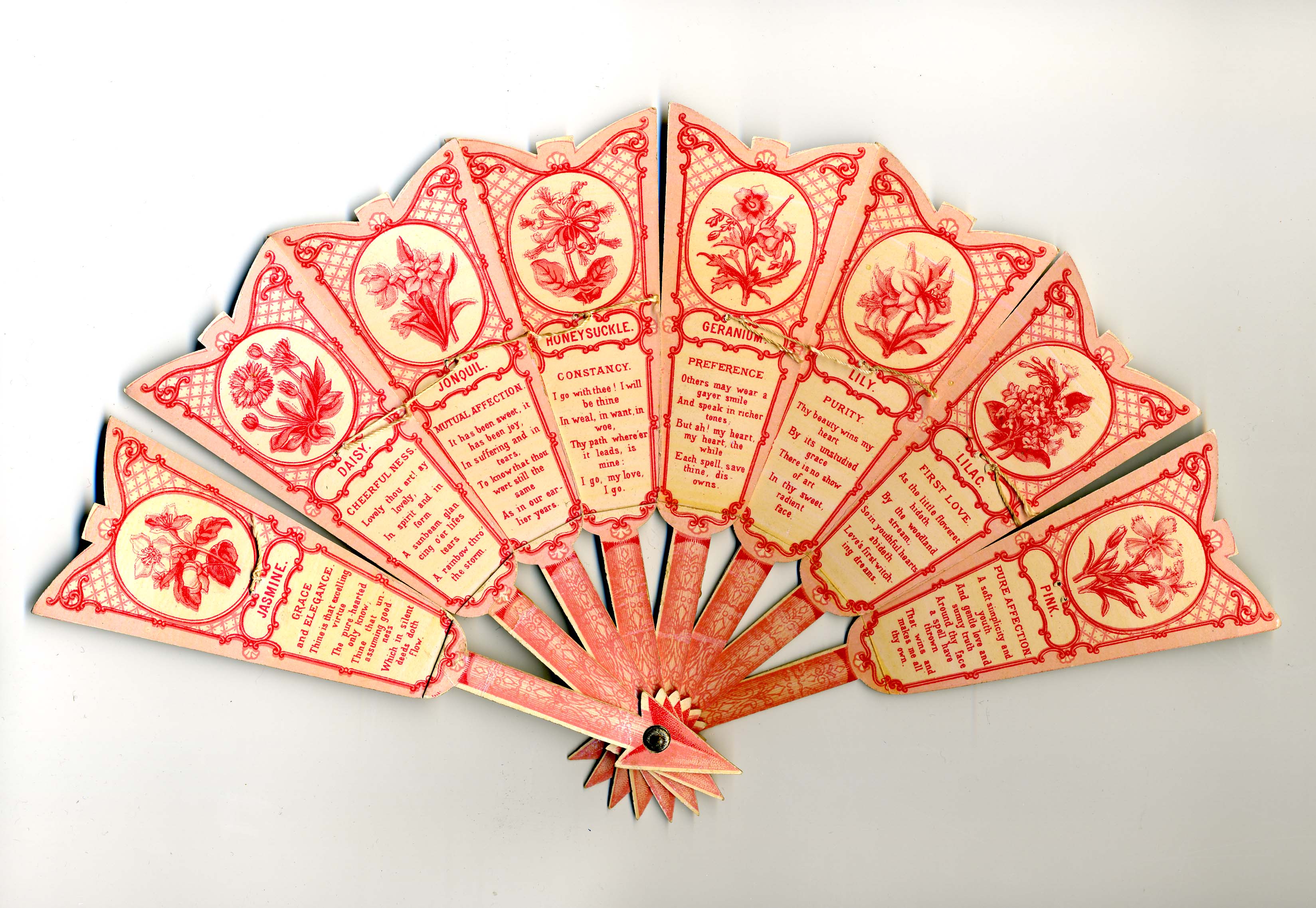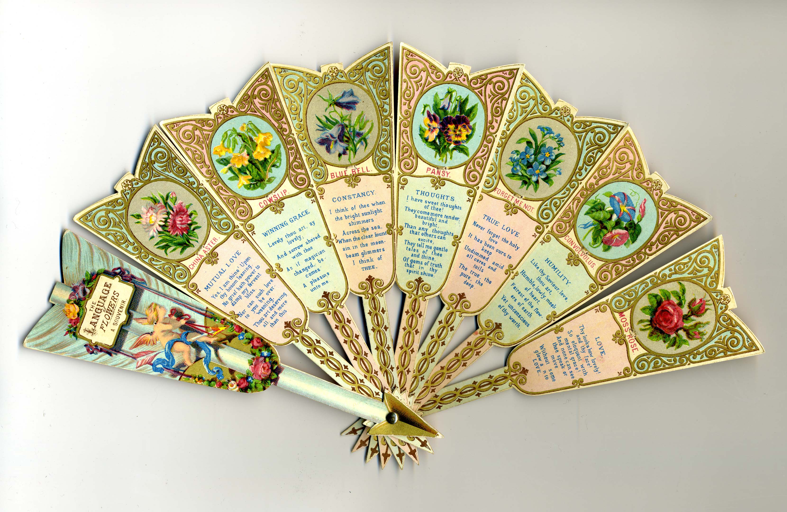 This fan shows, on one of its sides, seven different flowers: China Aster, Cowslip, Blue Bell, Pansy, Forget-Me-Not, Convolvulus, and Moss Rose and includes accompanying verse. For the other side, see Image 66.
