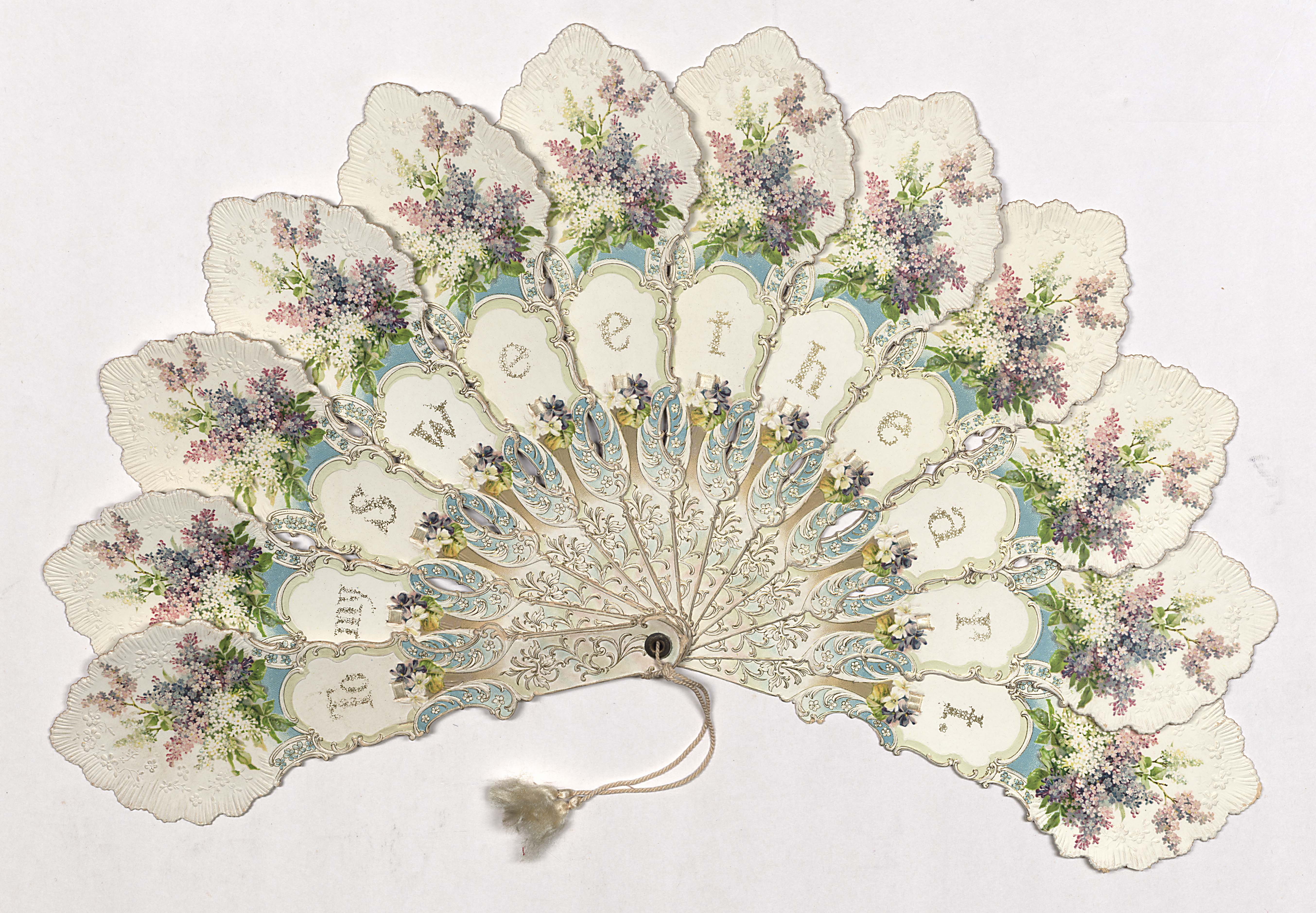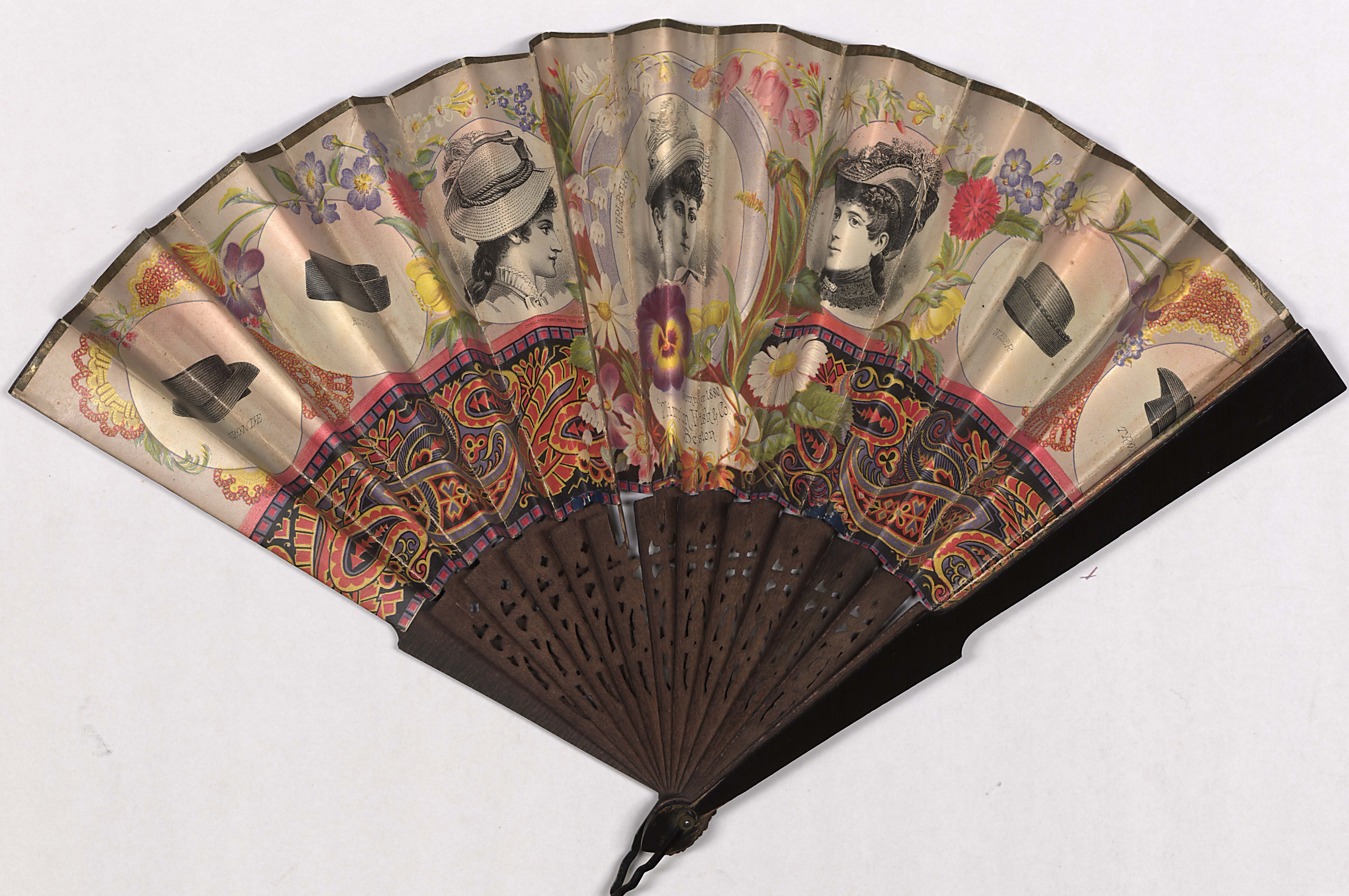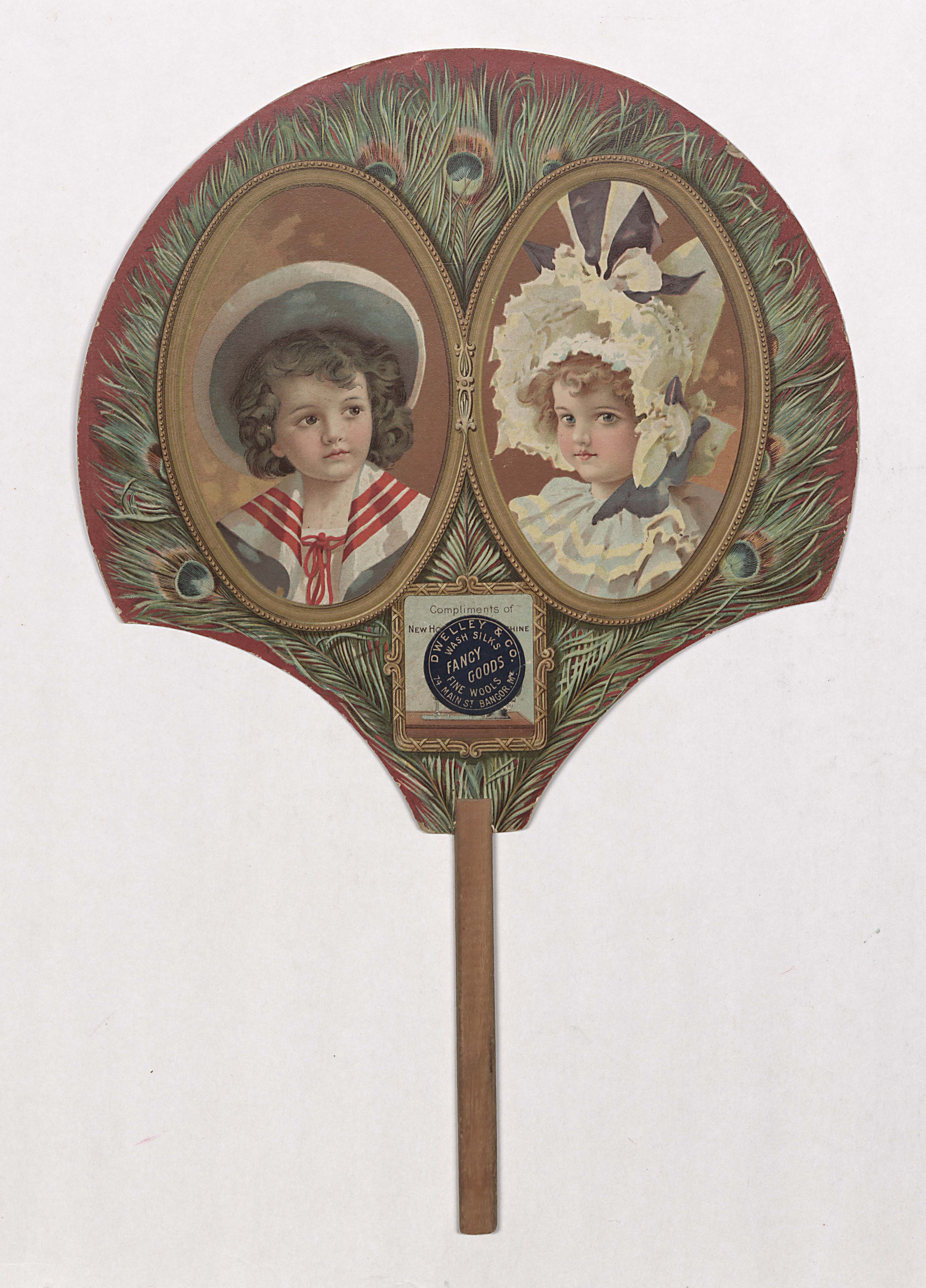 Hand fan circulated by Dwelley & Co., Bangor, Maine, a fancy goods, silk, and wool store. For the other side, see Image 55.