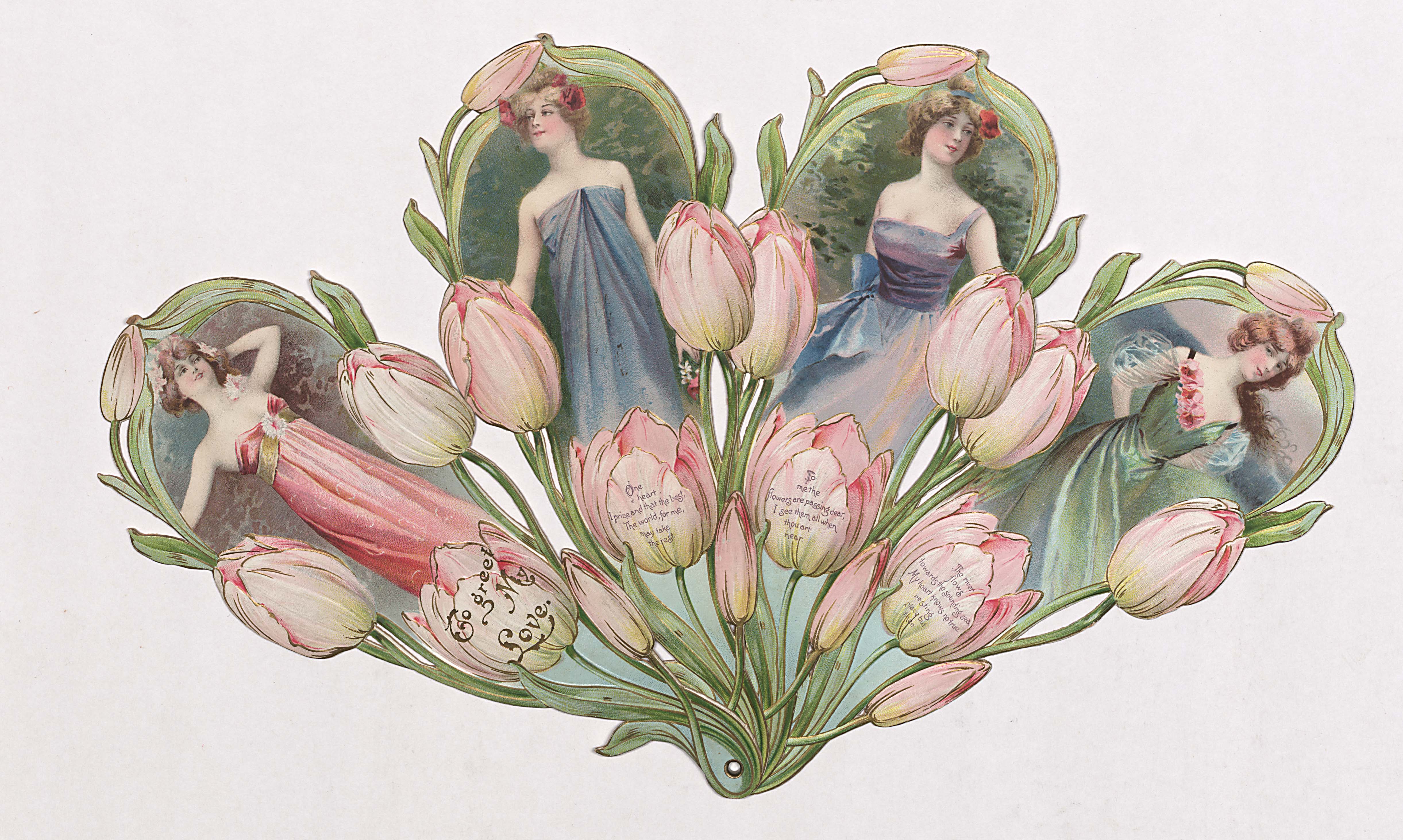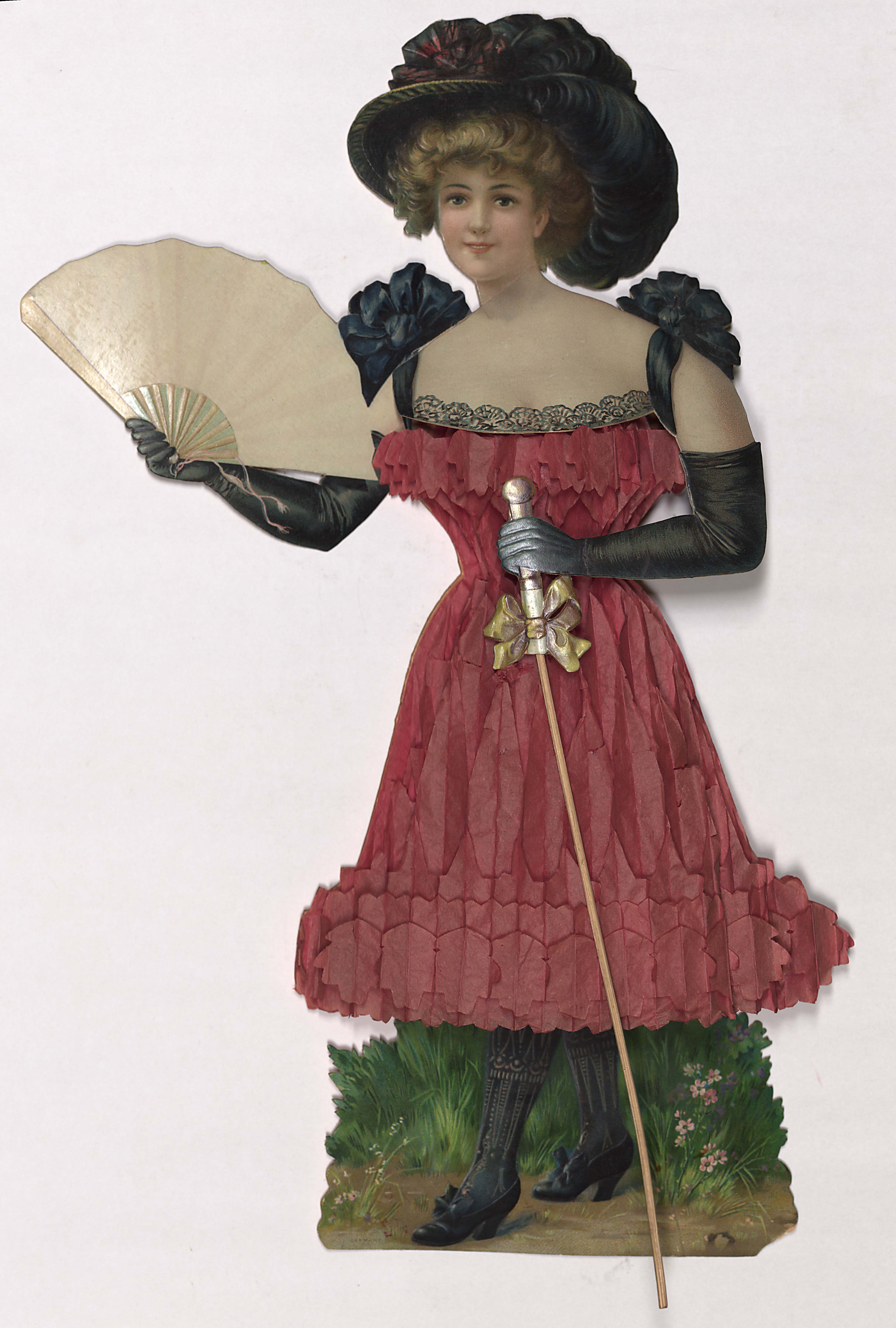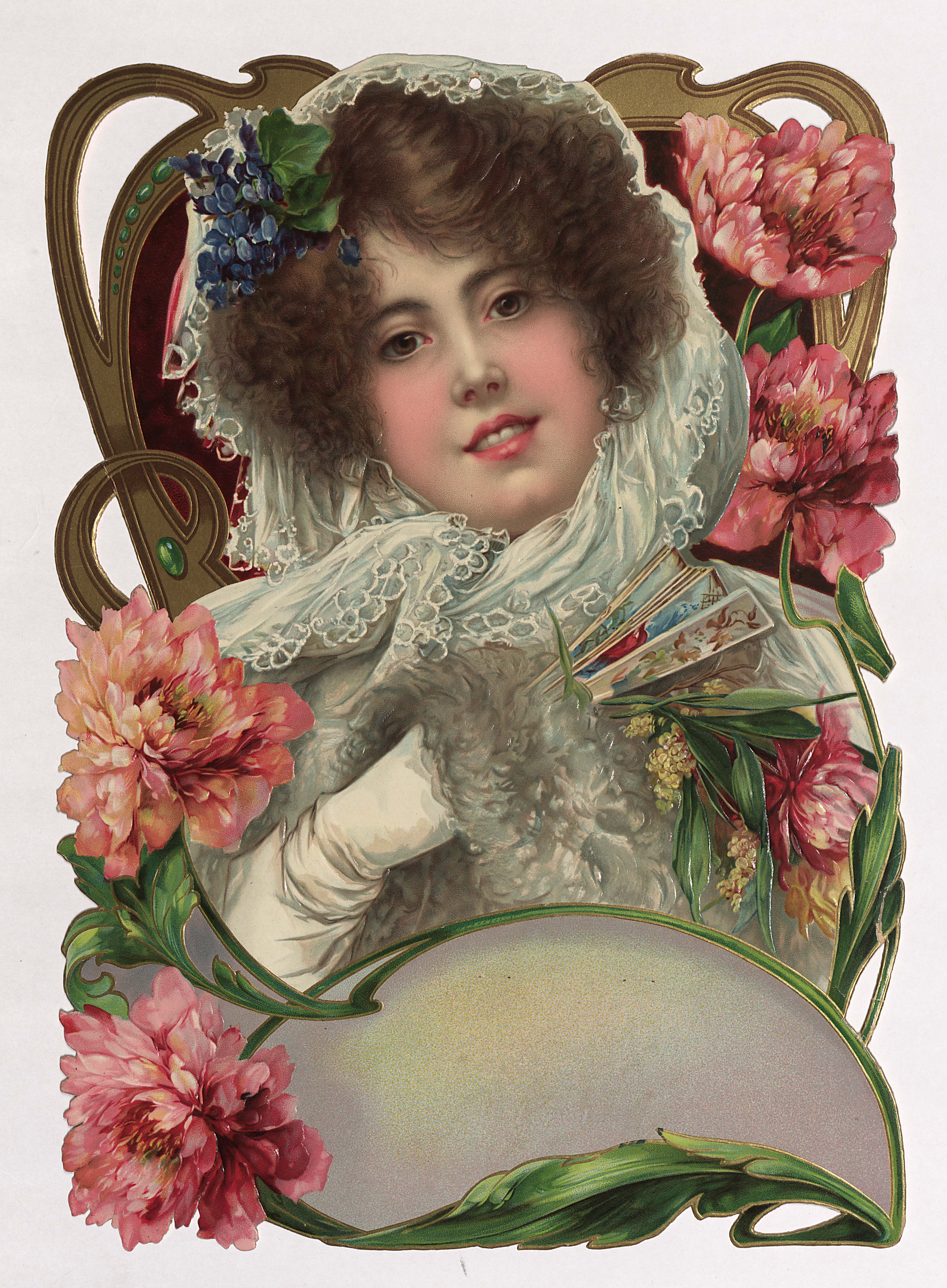 This illustration—a woman surrounded by flowers, dressed in delicate clothing, and carrying a hand fan—was most likely printed to be used as an advertisement but never was, judging from the blank space at the bottom where the ad would have appeared.