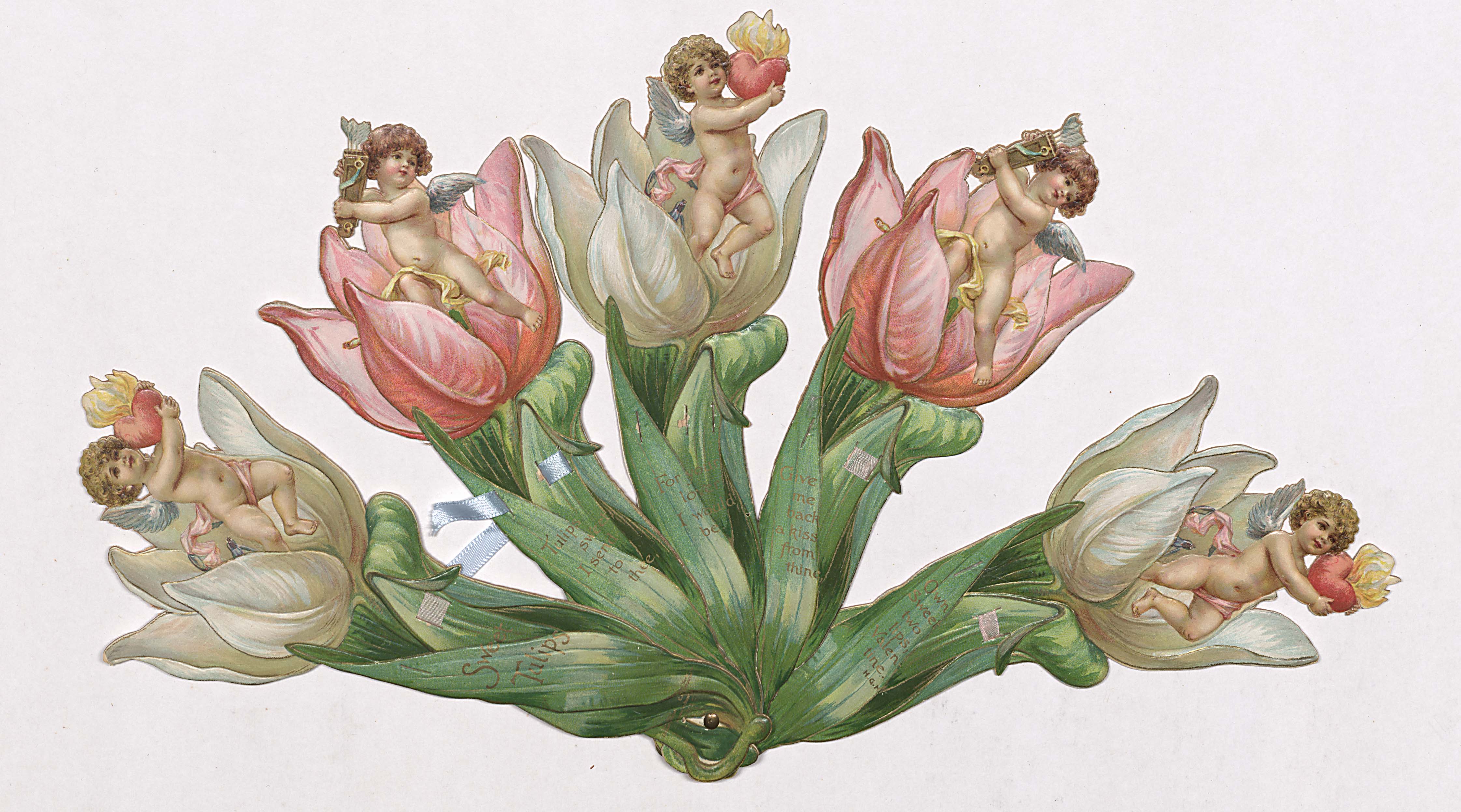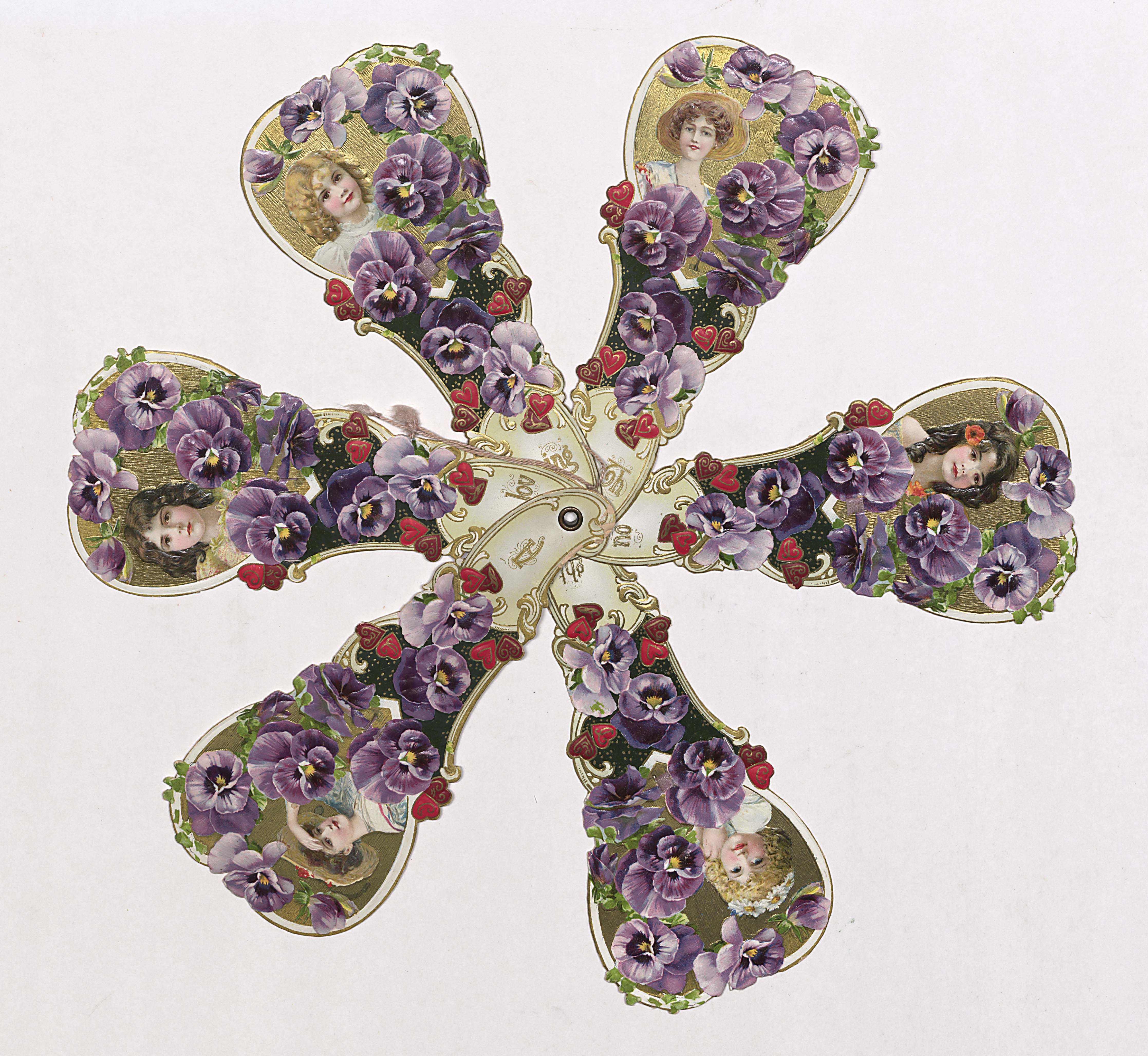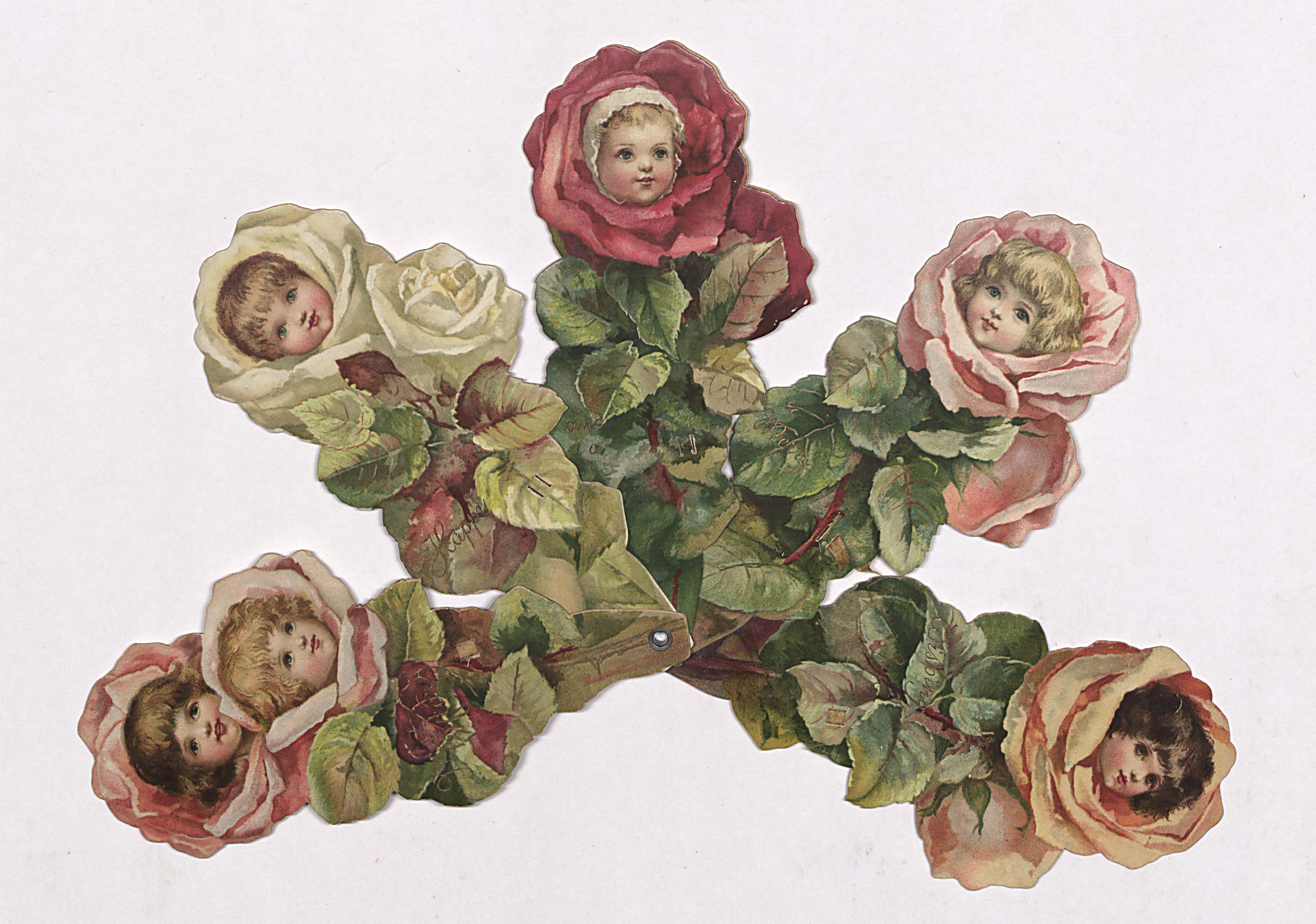 This illustration—a woman surrounded by flowers, dressed in delicate clothing, and carrying a hand fan—was most likely printed to be used as an advertisement but never was, judging from the blank space at the bottom where the ad would have appeared.