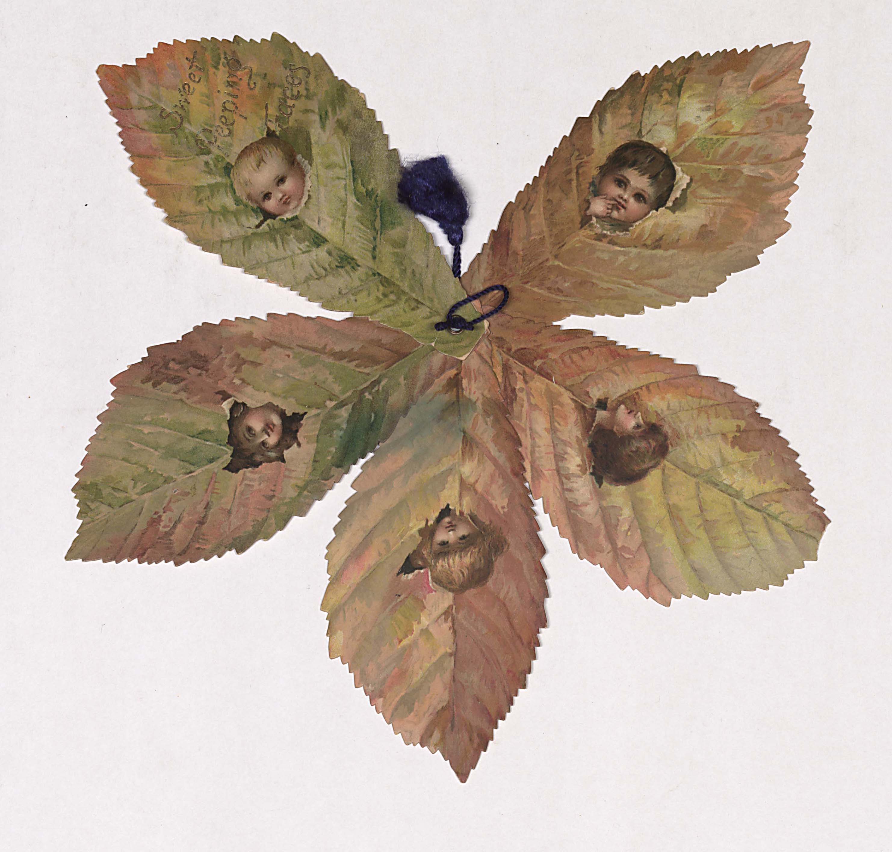 Sweet Peeping Faces has five leaves with the heads of children showing in them. On the back is a lengthy poem