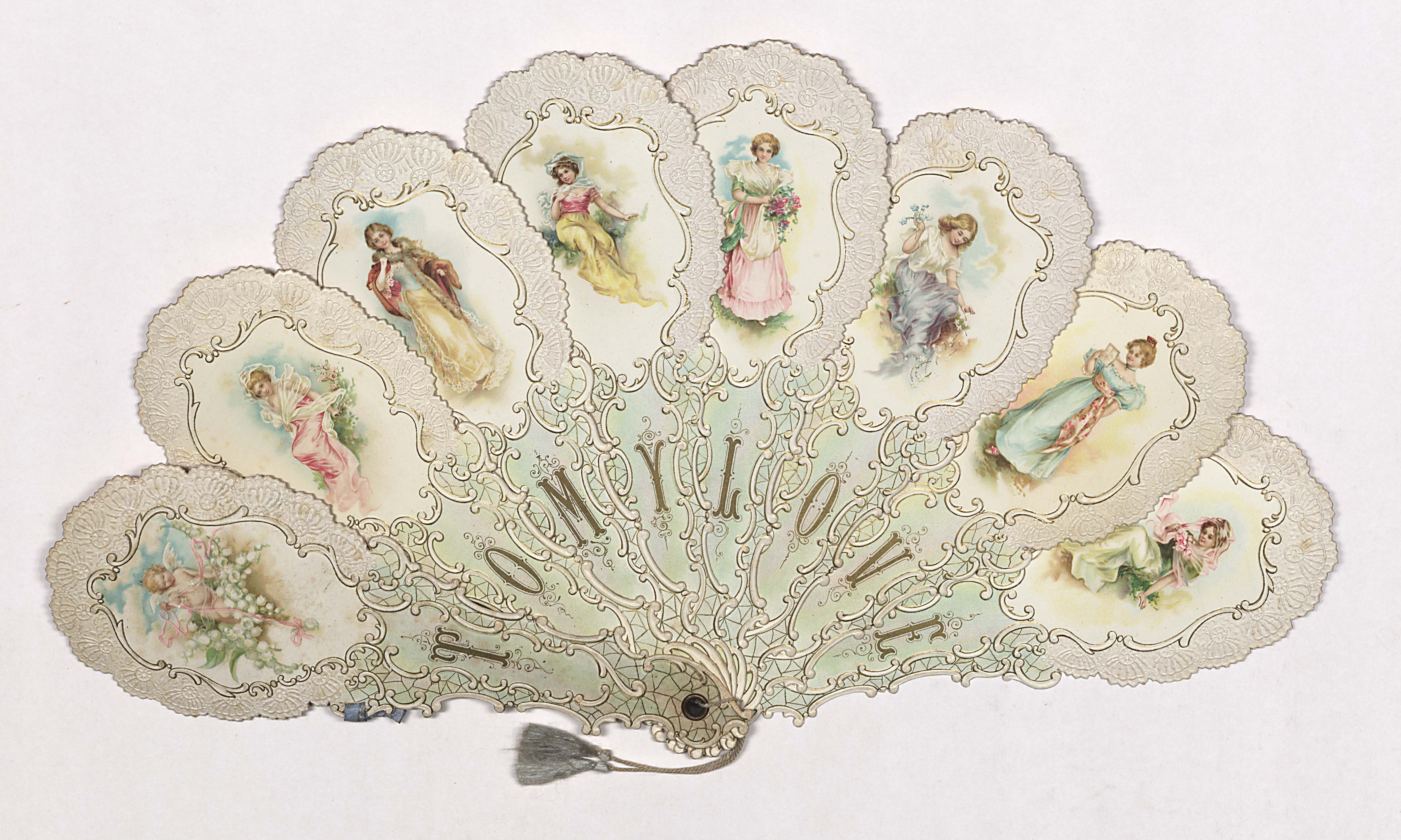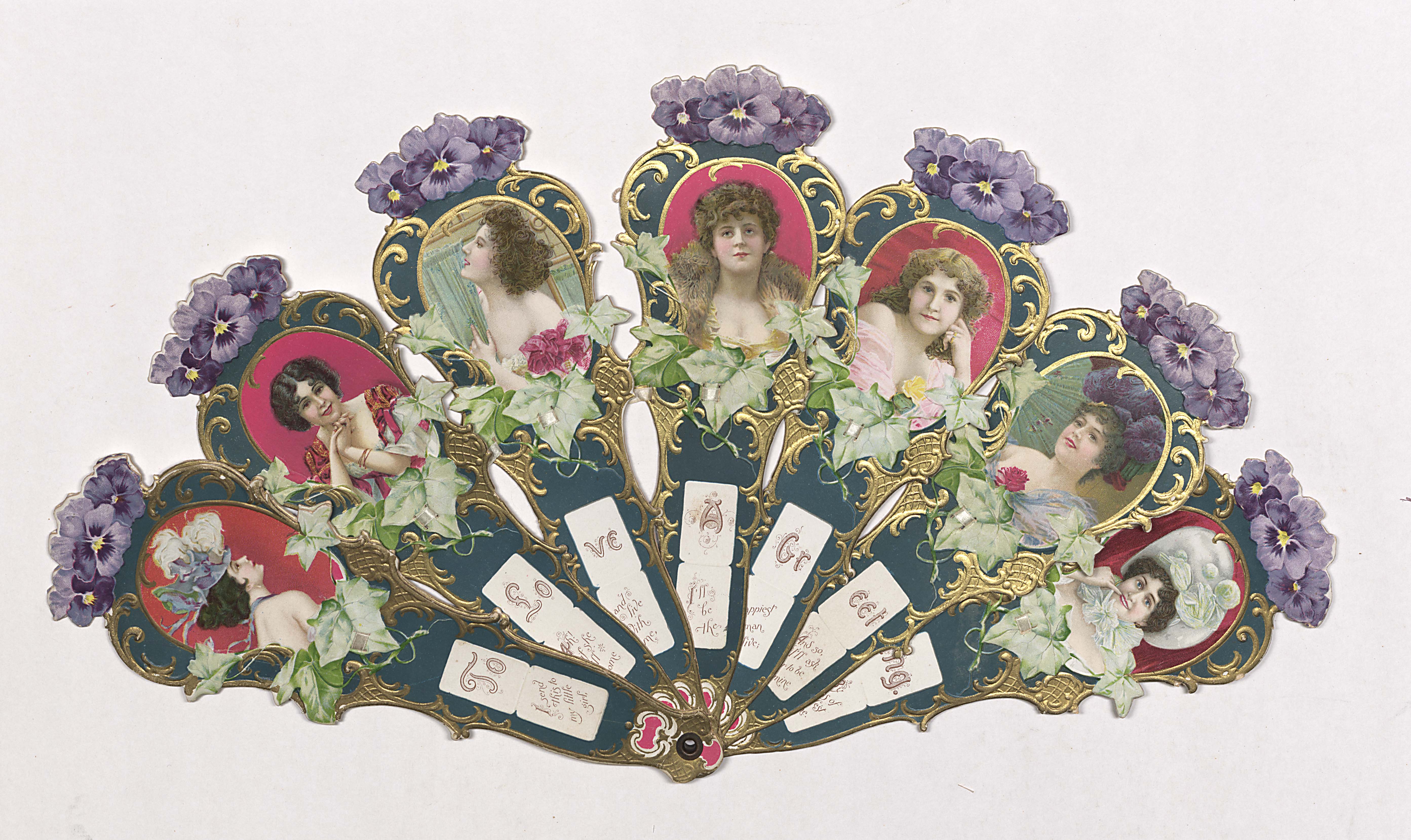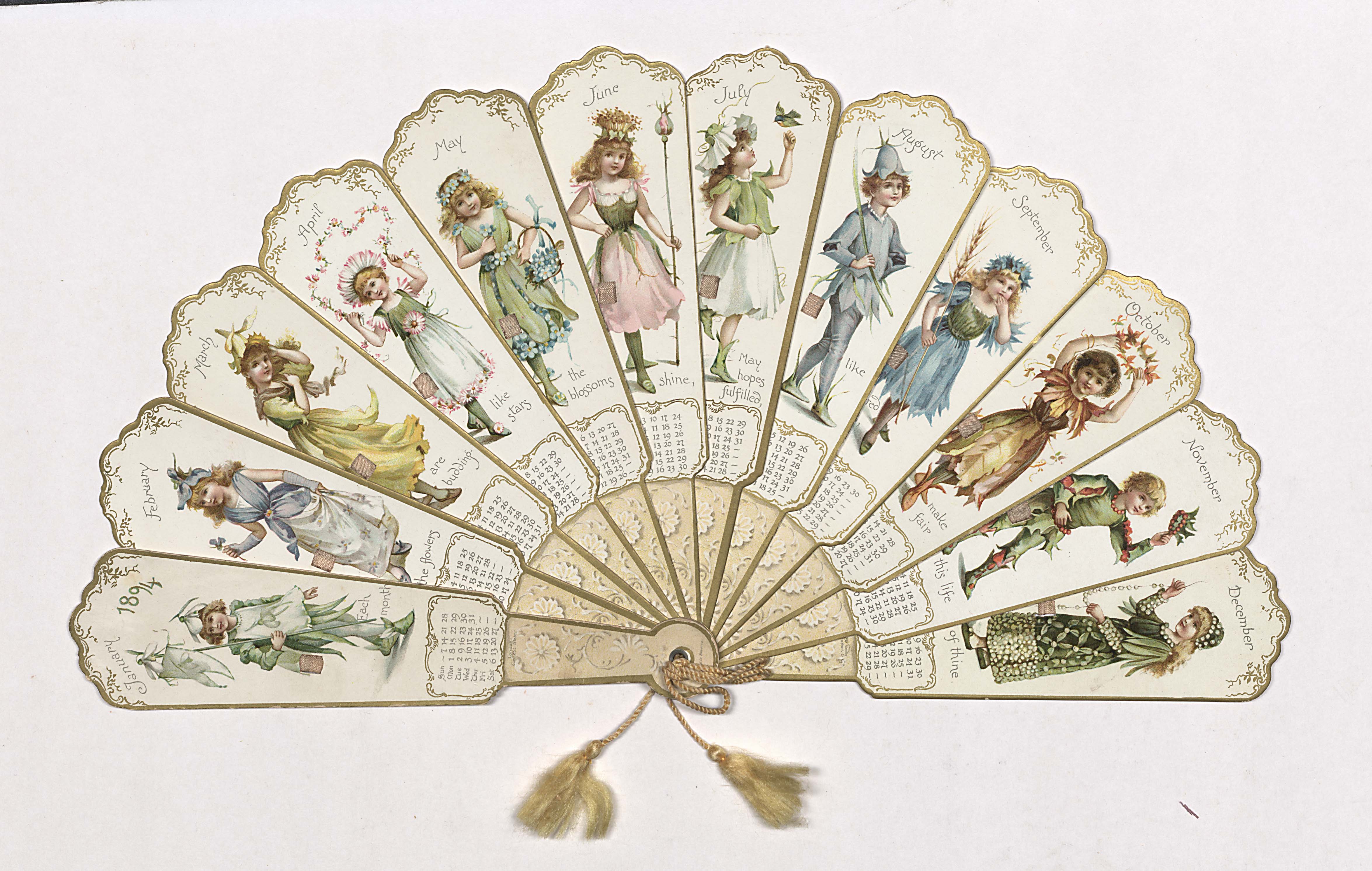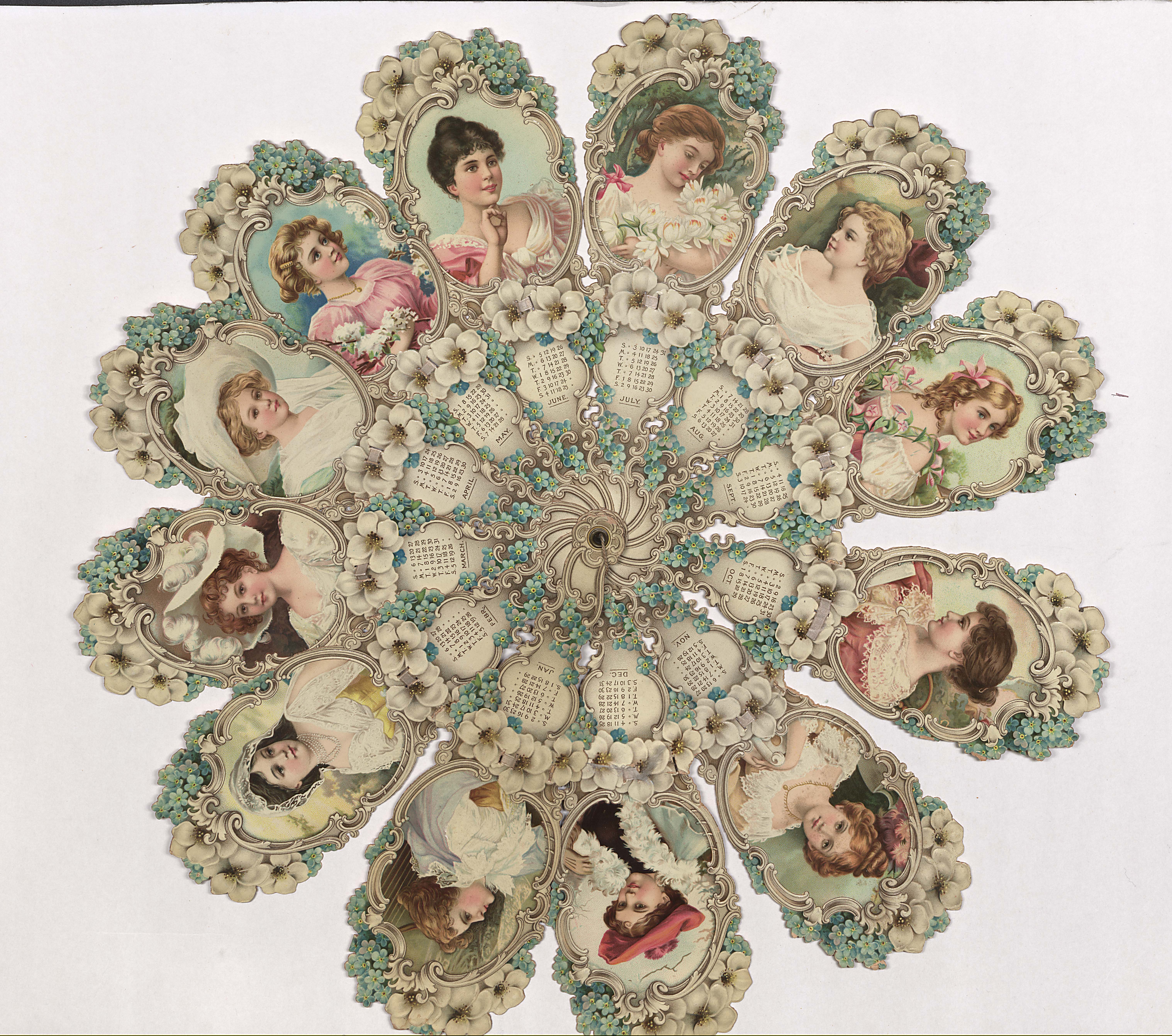Calendar fan from the early 1900s, each month with a separate section, all featuring portraits of a different woman.