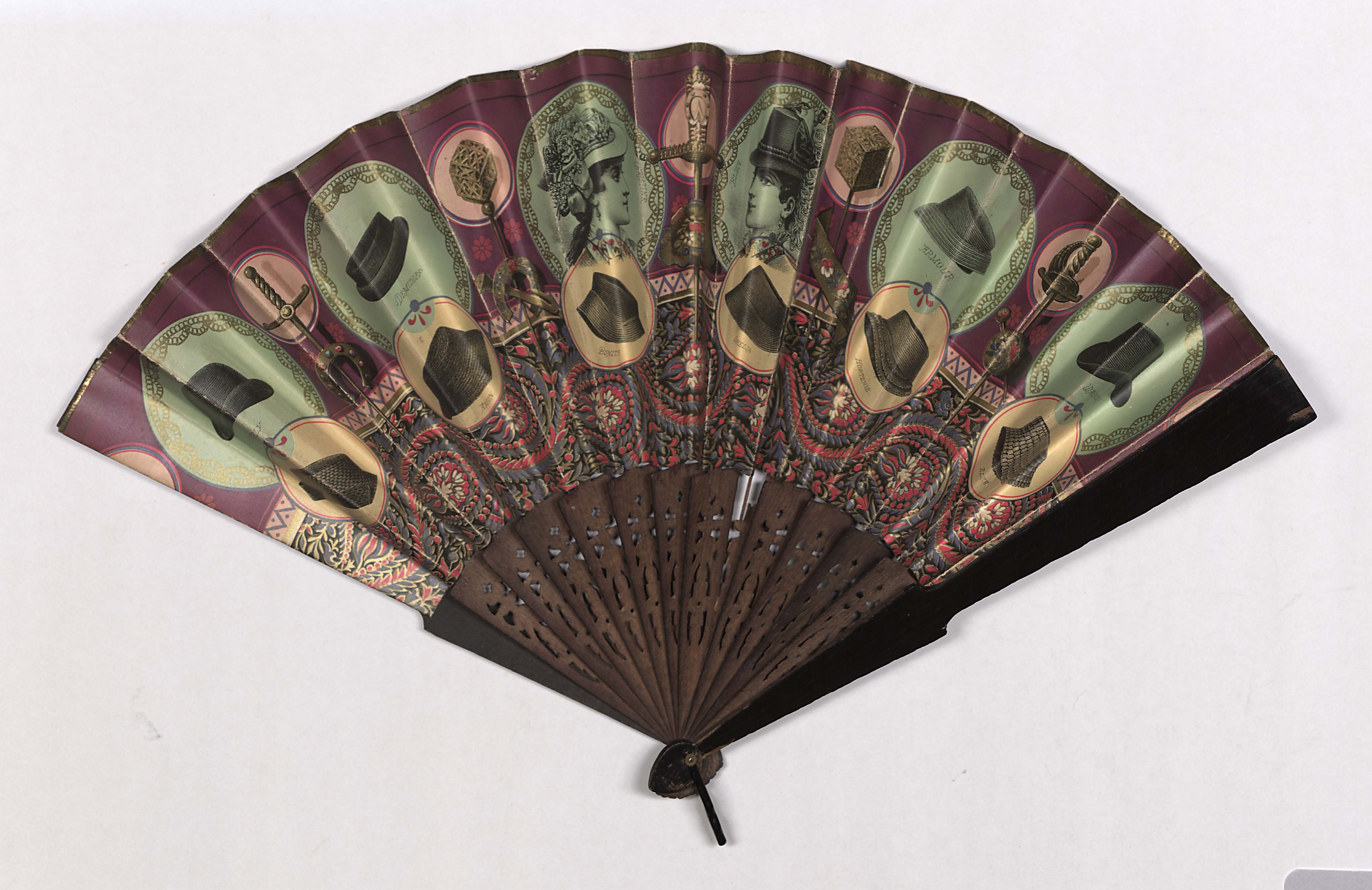 Hand fan showing various forms of head wear. For the other side, see Image 26.