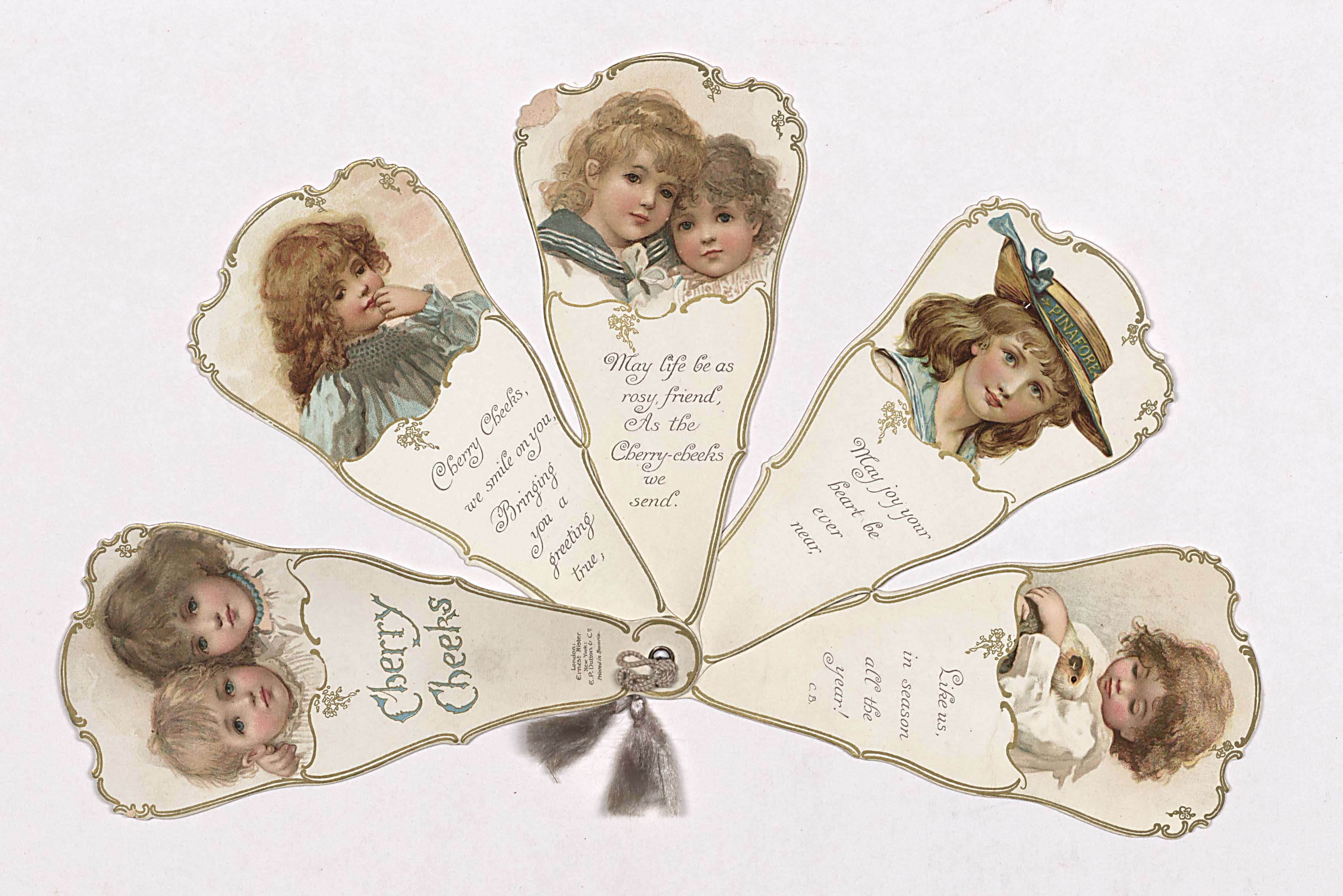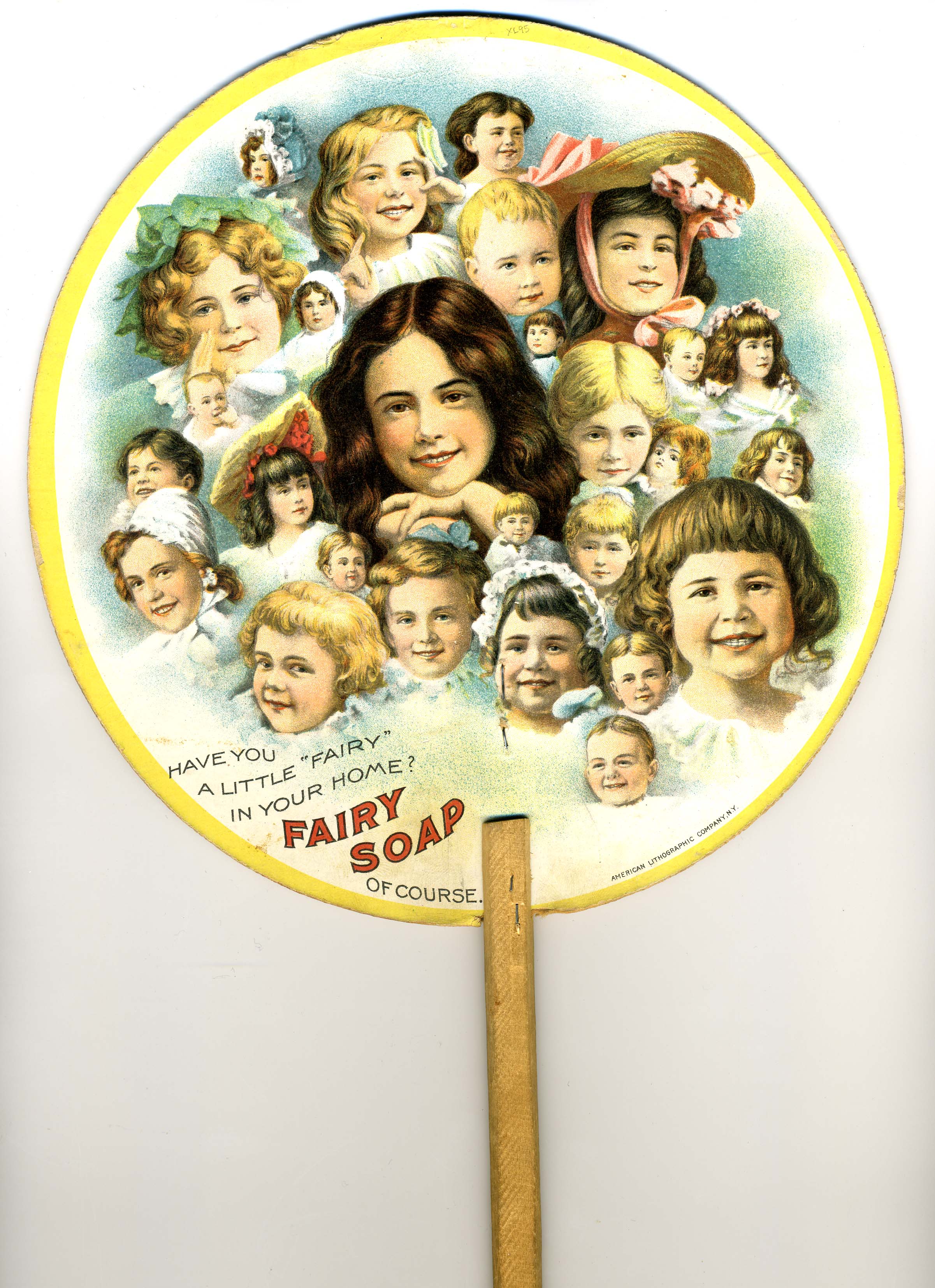Hand fan showing a number of smiling children’s faces, seemingly all girls, and asking: Have you a little “fairy” in your home? Fairy soap of course.