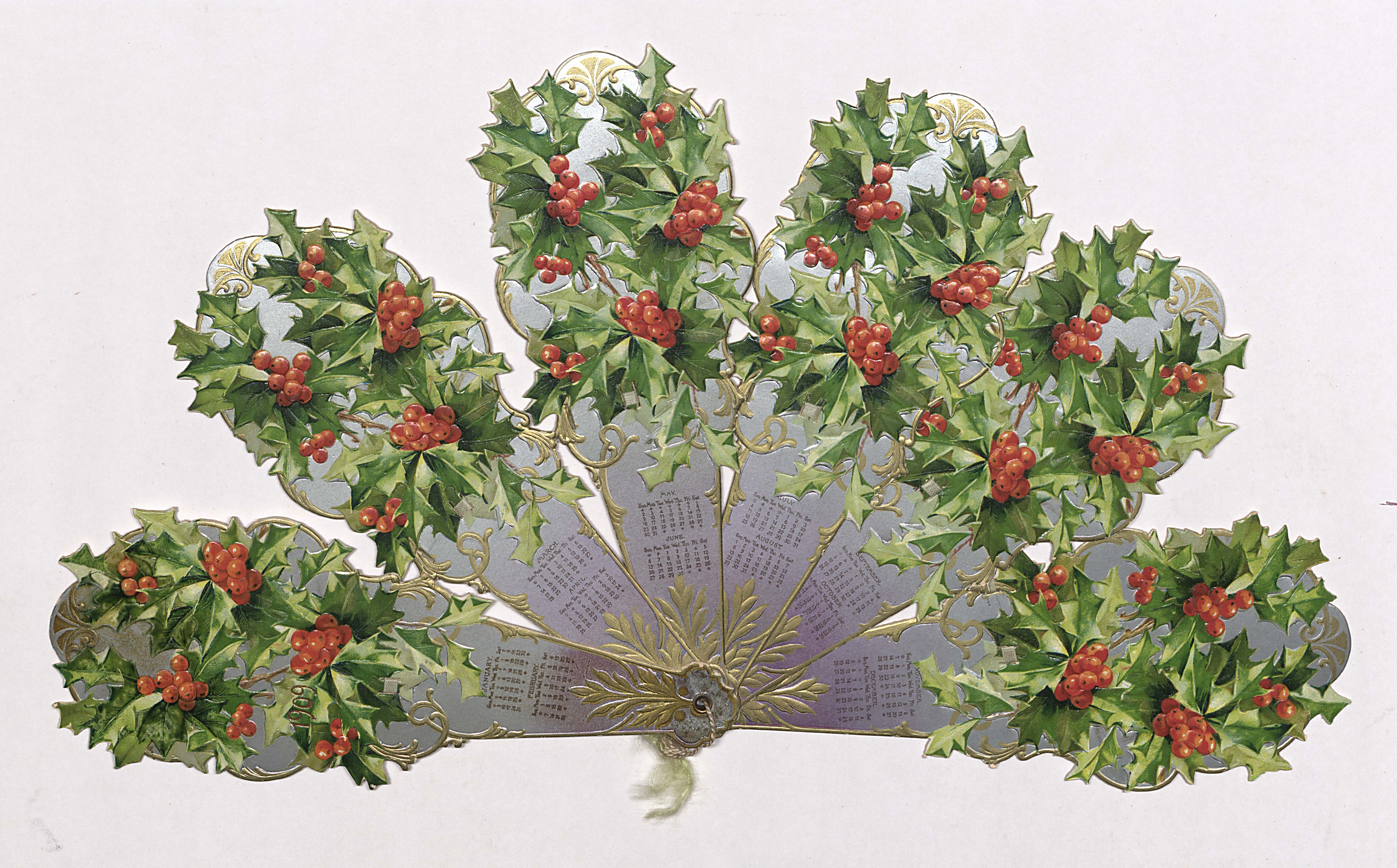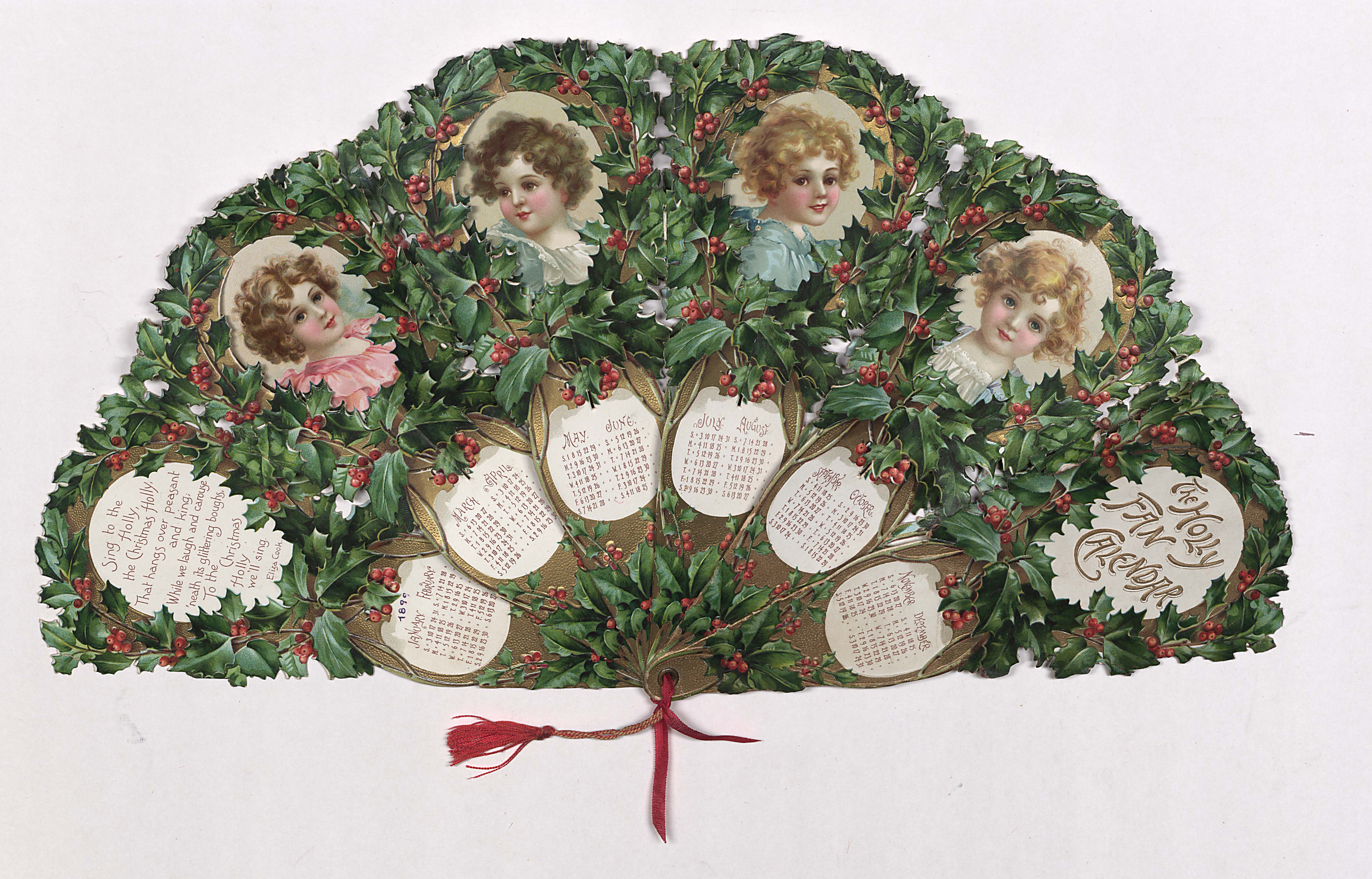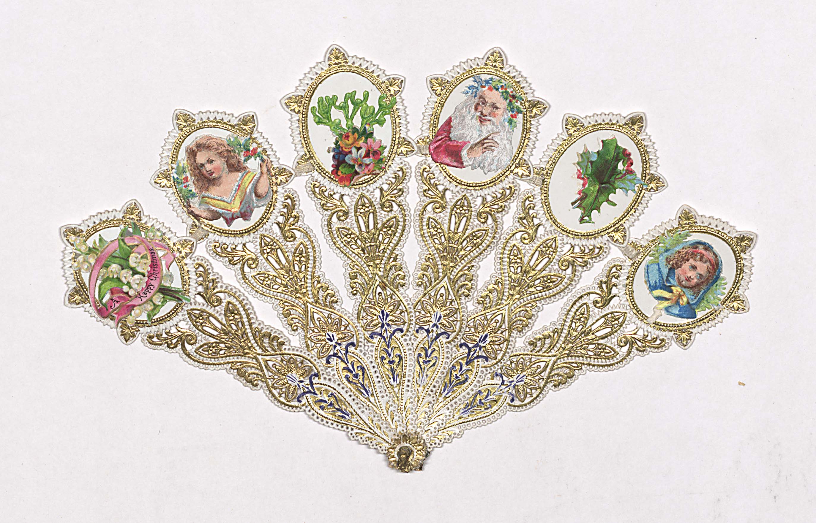 Happy Christmas, a delicate fan, perhaps from the United Kingdom featuring Christmas imagery, including a Santa Claus figure, holly, and a child, one possibly anticipating gifts.