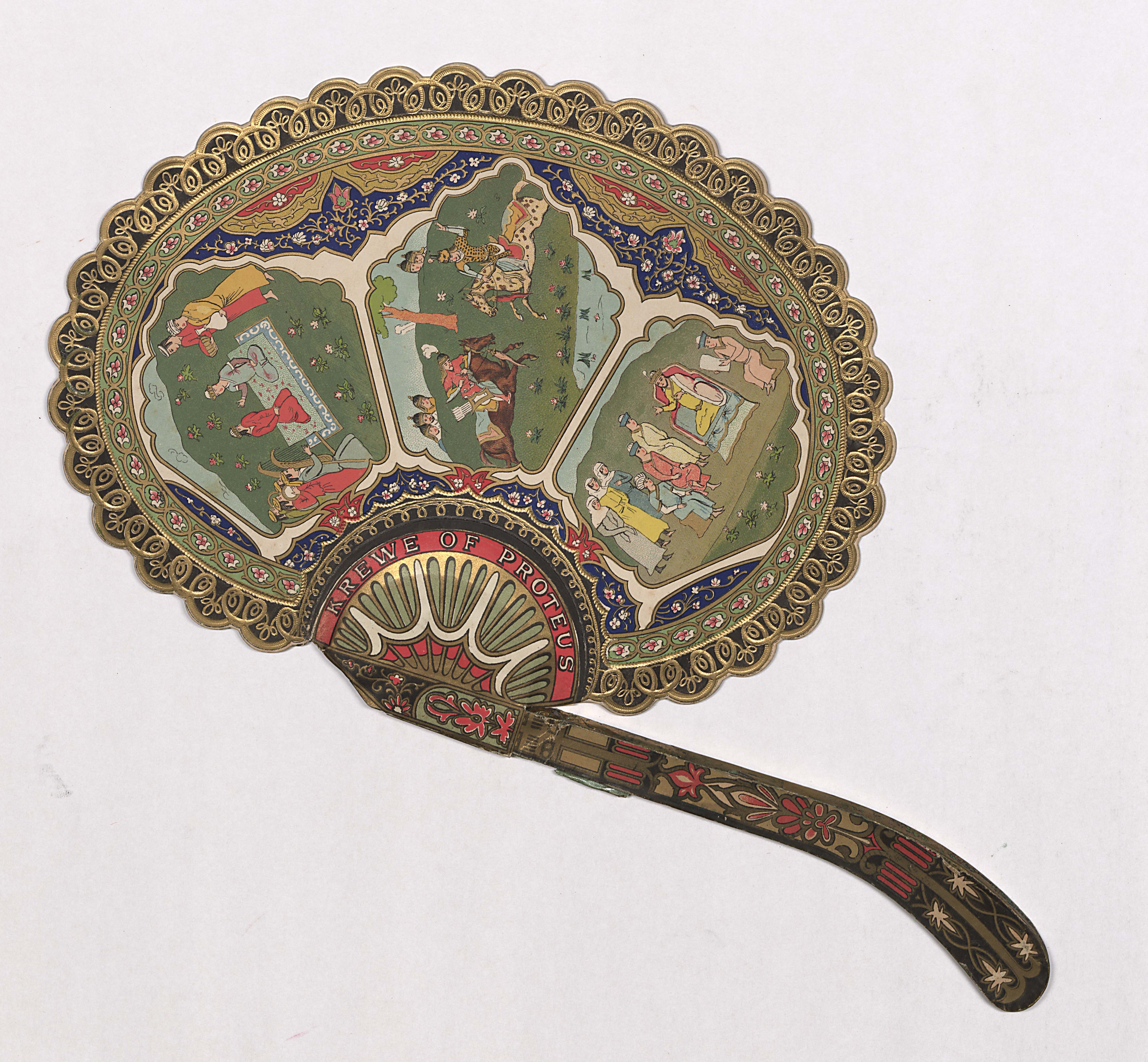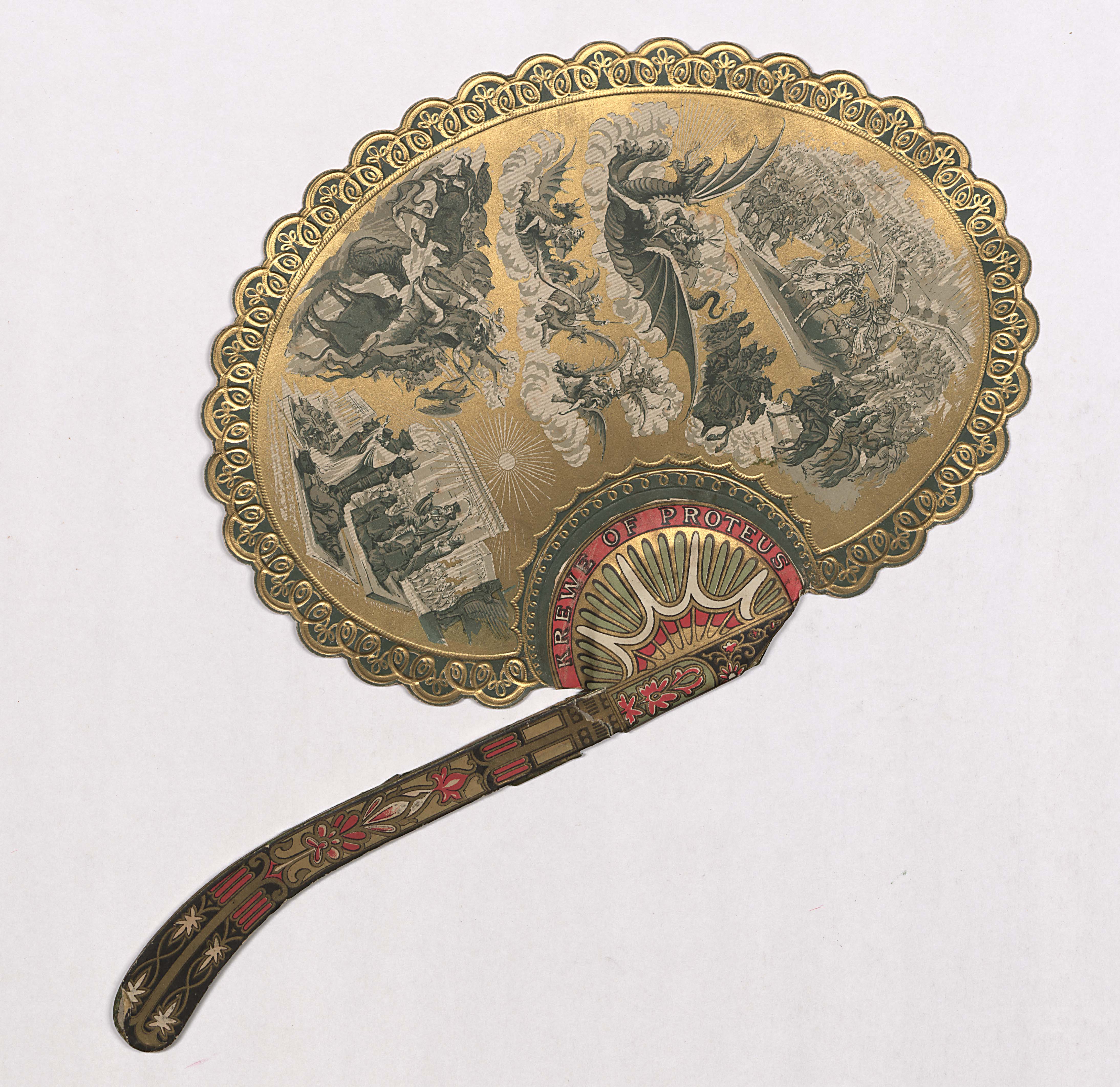 Krewe of Proteus fan, labeled as such on both sides. It was most likely carried during a Mardi Gras parade. The Krewe of Proteus is the second oldest parade organization associated with the New Orleans Mardi Gras, having been founded in 1882. For the other side, see Image 47.