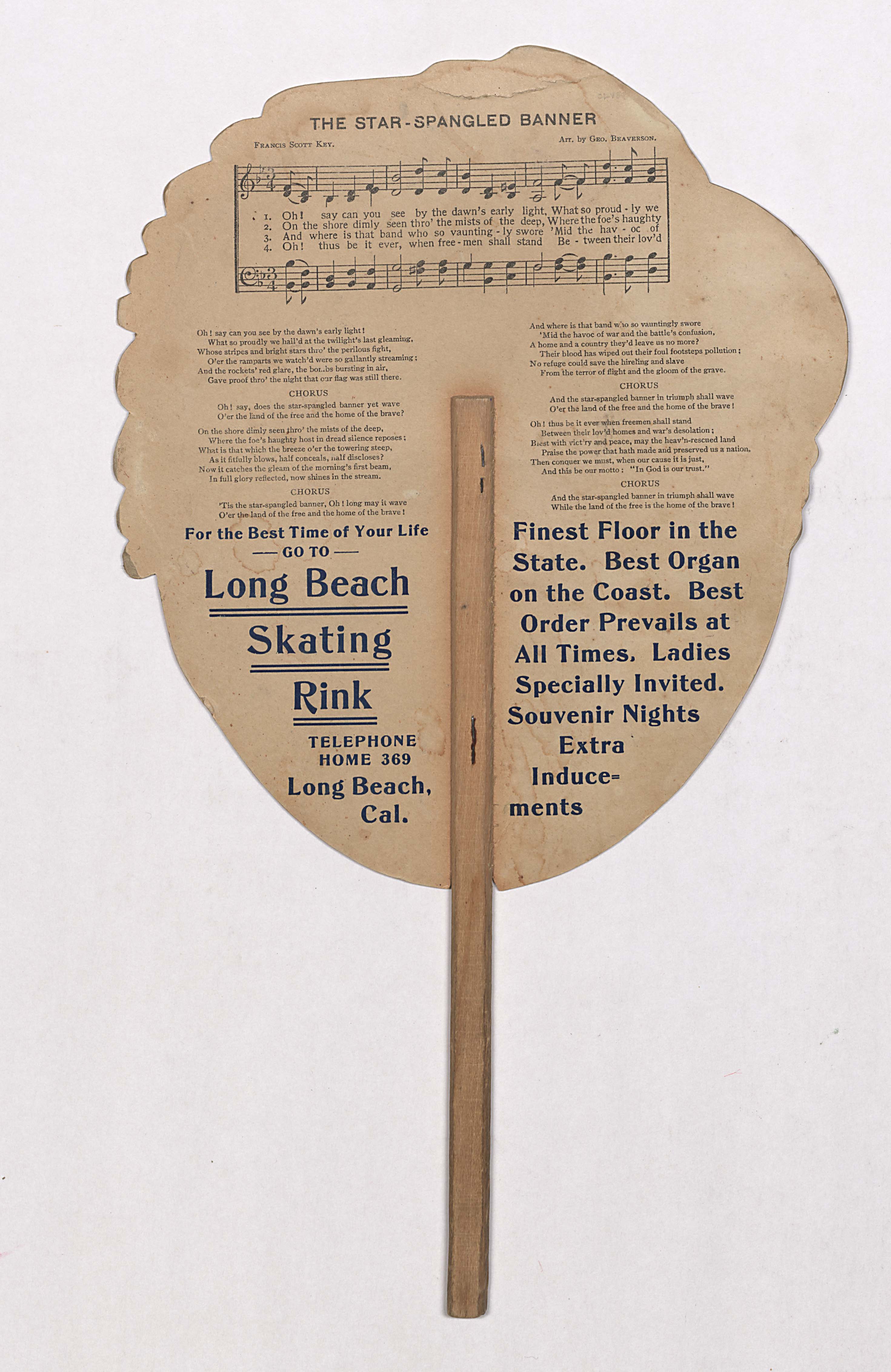 Reverse of fan in Image 48 with the words to the “Star-Spangled Banner” and advertising for the Long Beach, California Skating Rink, which had the “Finest Floor in the State. Best Organ on the Coast. Best Order Prevails at All Times. Ladies Specially Invited. Souvenir Nights Extra Inducements.”