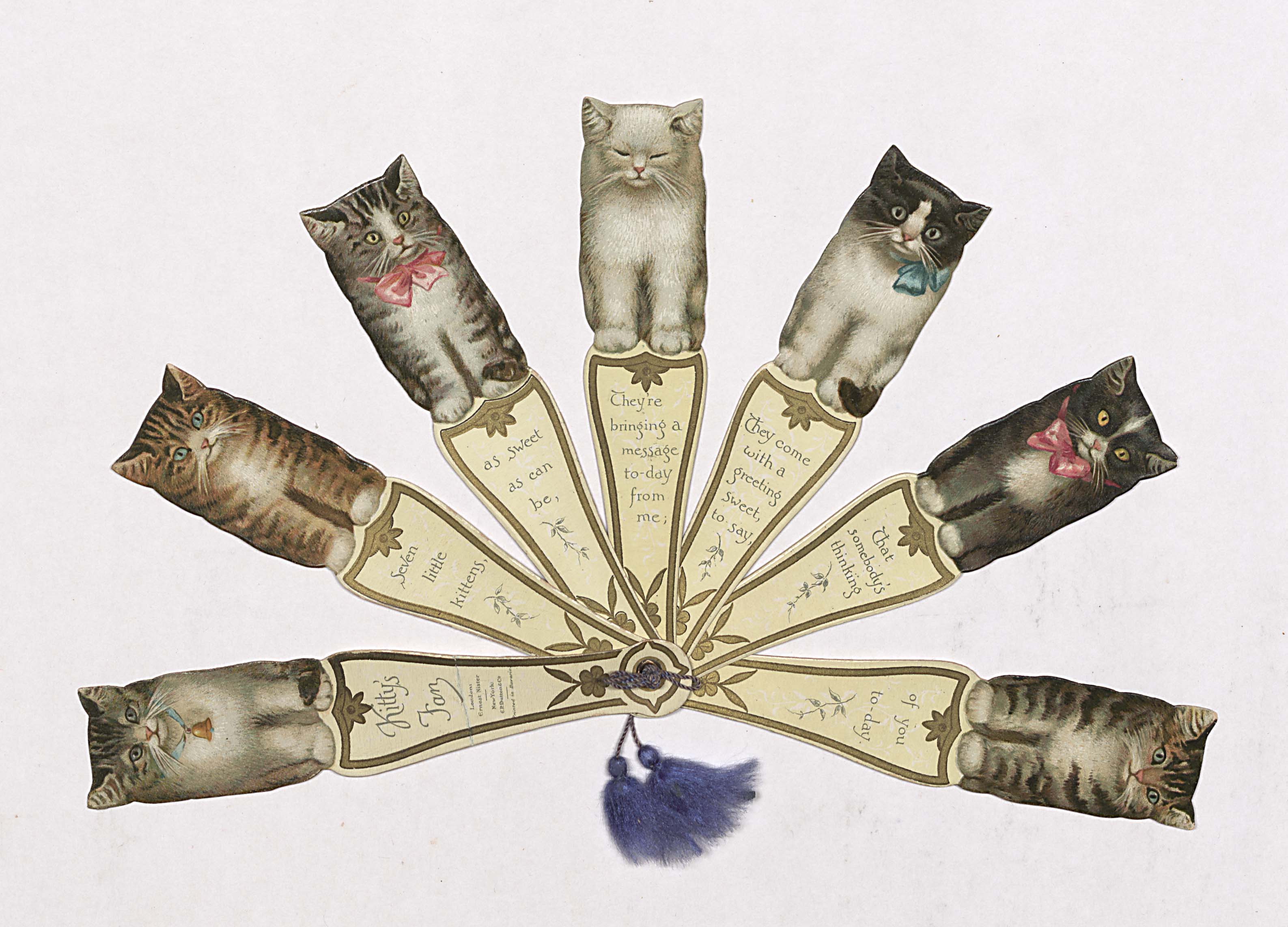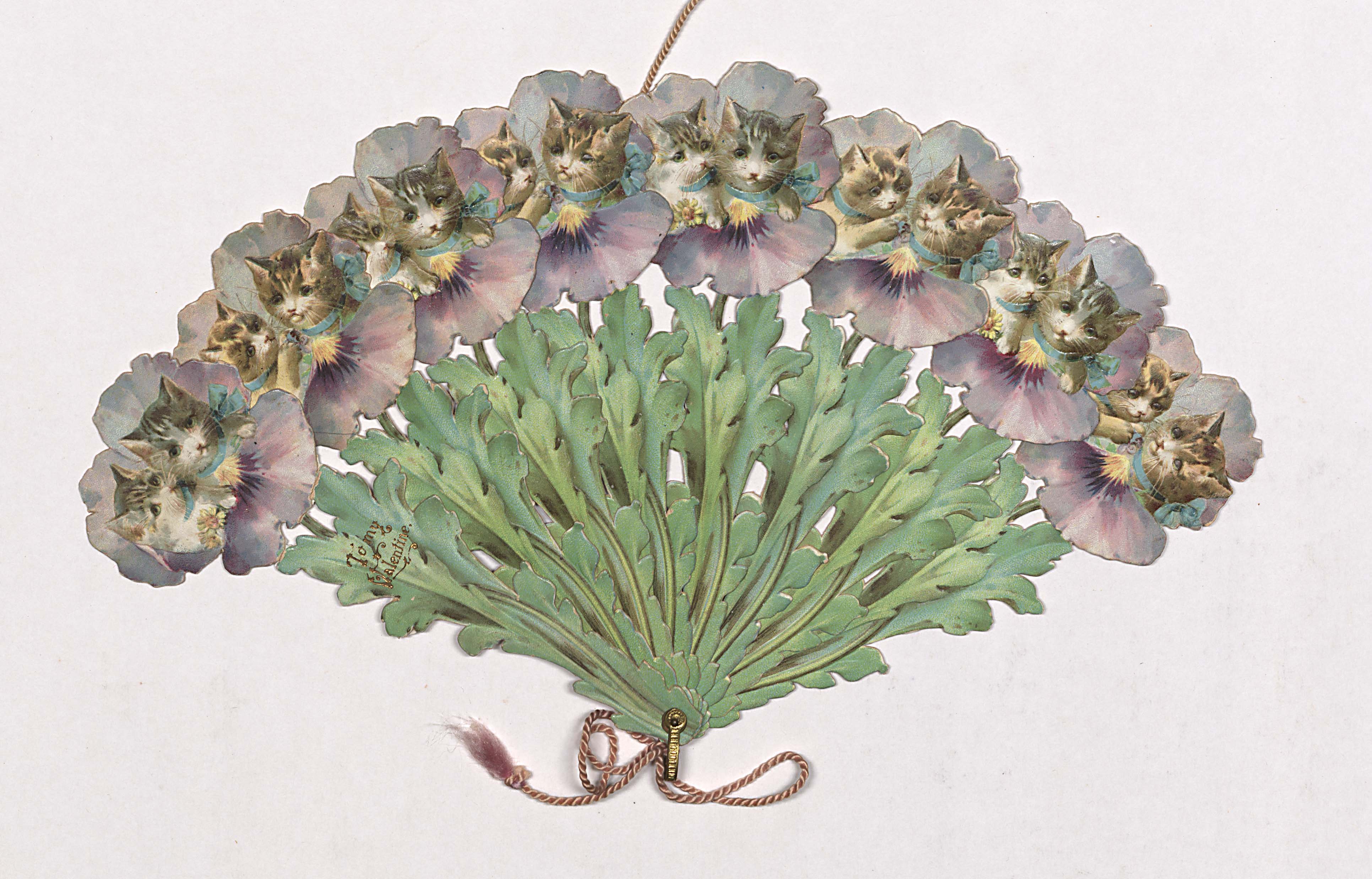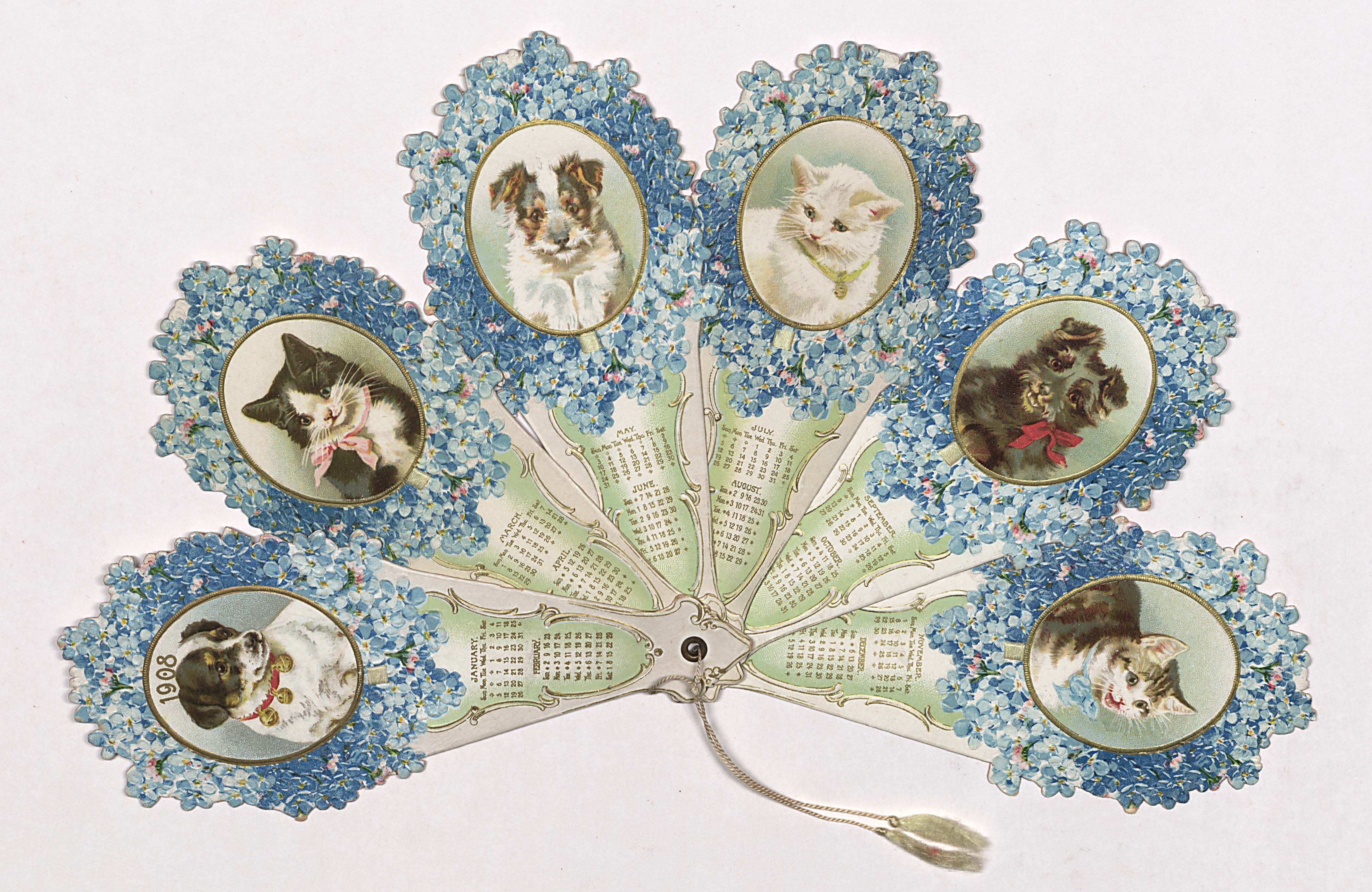 Fan with calendar for 1908, with illustrations of the heads of three dogs and three cats.