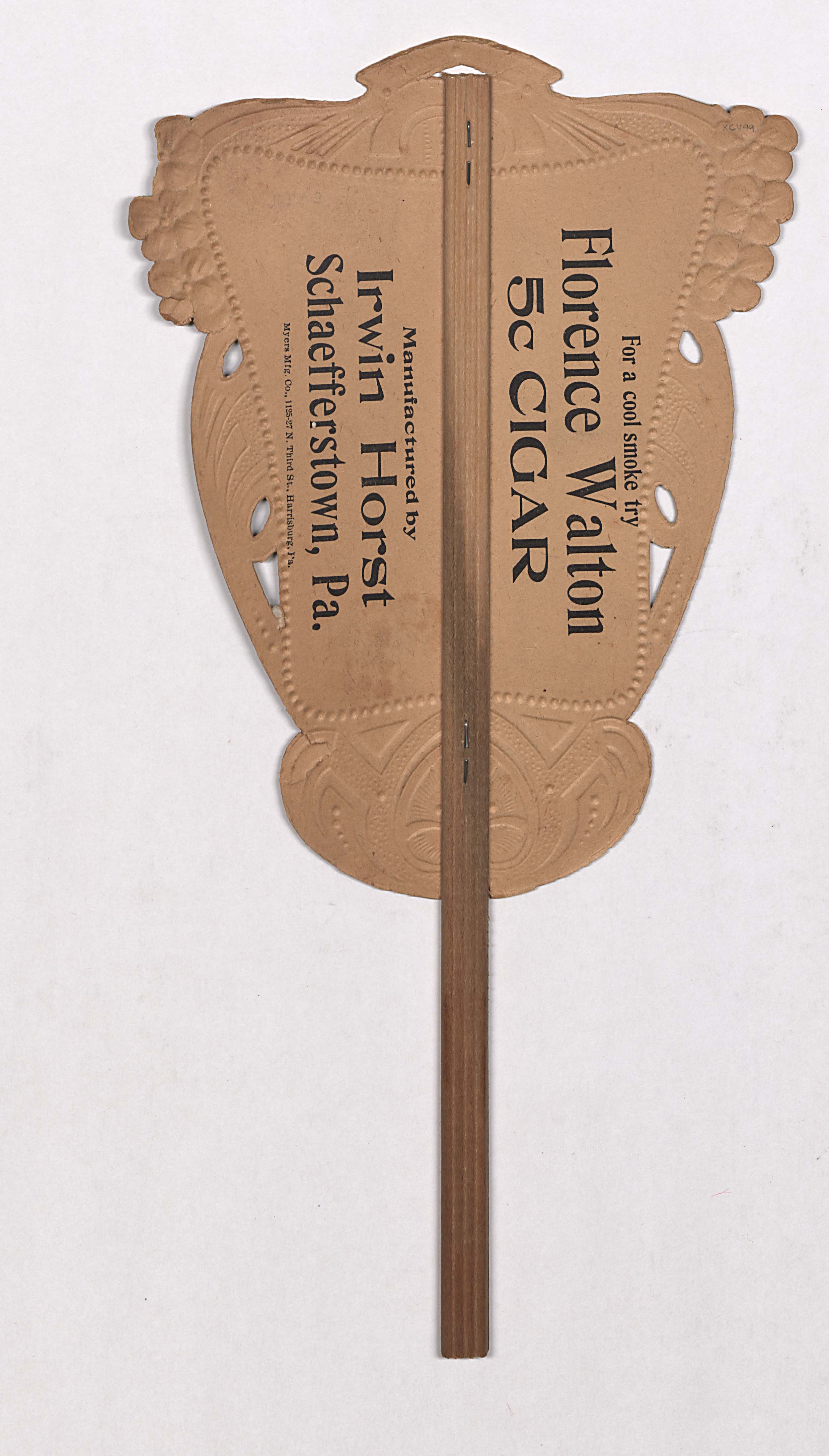 Reverse of fan in Image 50 with an advertisement for cigars: “For a cool smoke try Florence Walton 5¢ Cigar. Manufactured by Irwin Horst Schaefferstown, Pa.”
