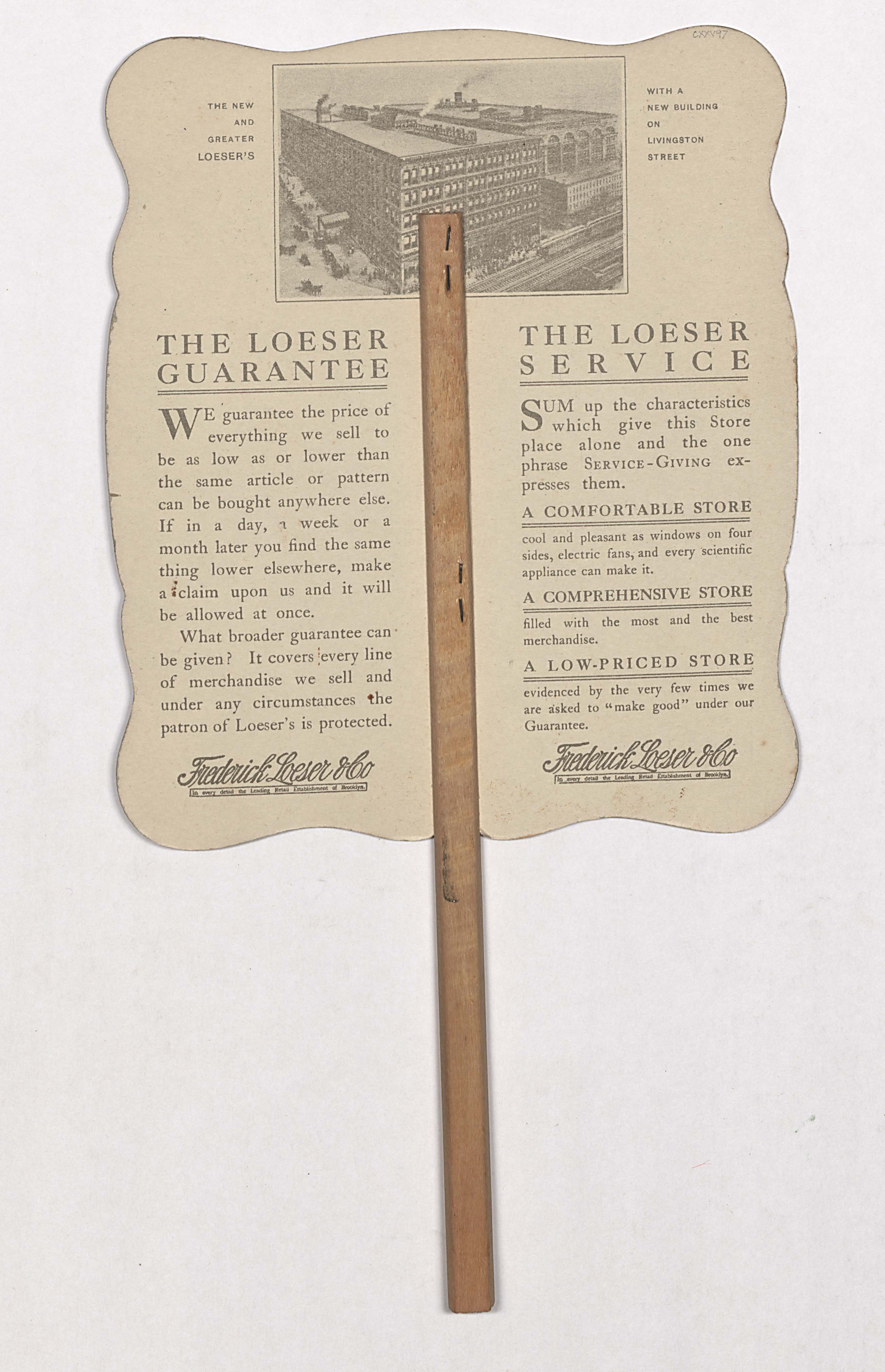 Reverse of fan in Image 52. The Frederick Loeser & Co. pledge: “We guarantee the price of everything we sell to be as low as or lower than the same article or pattern [that] can be bought anywhere else . . . What broader guarantee can be given?”