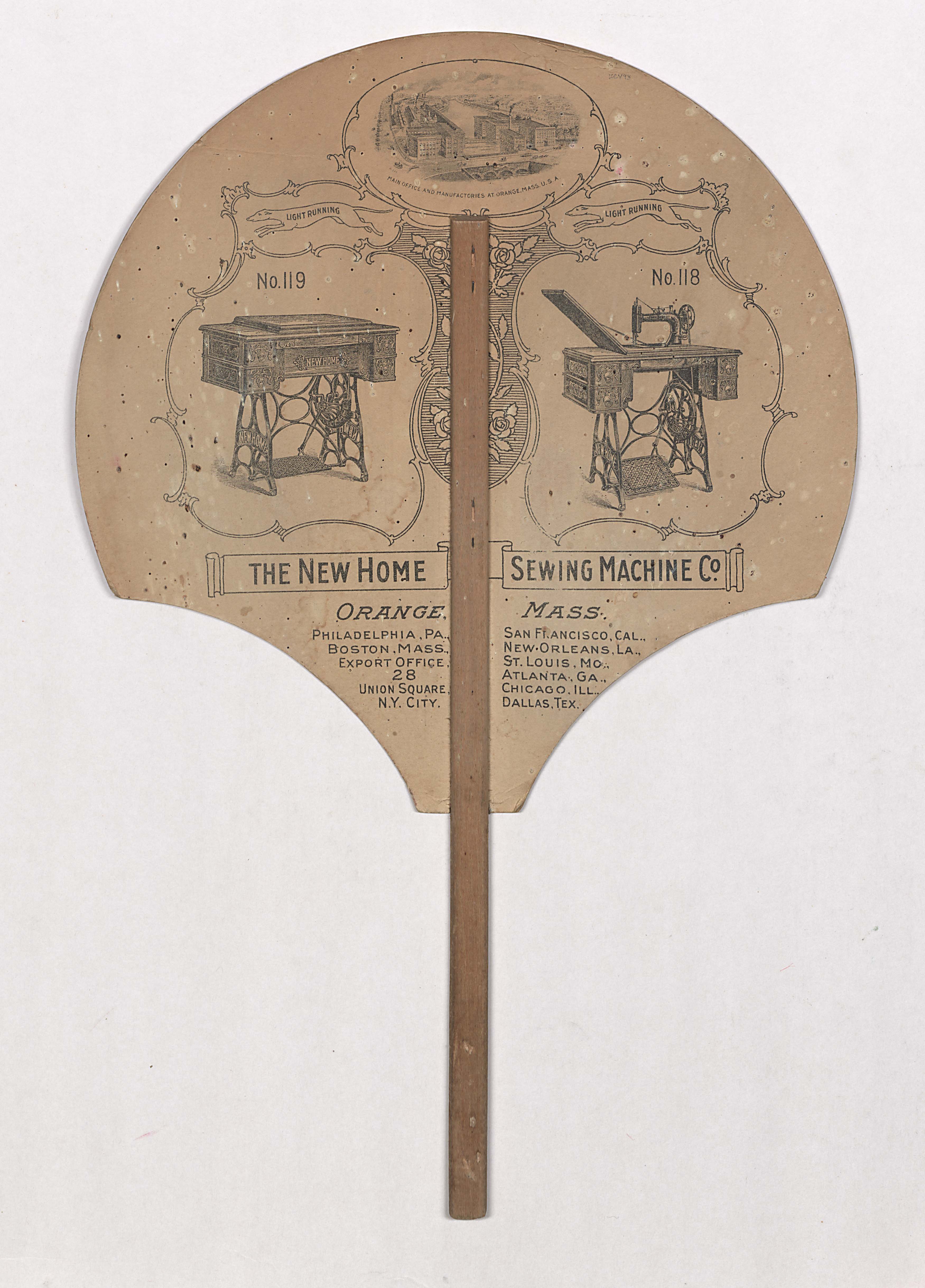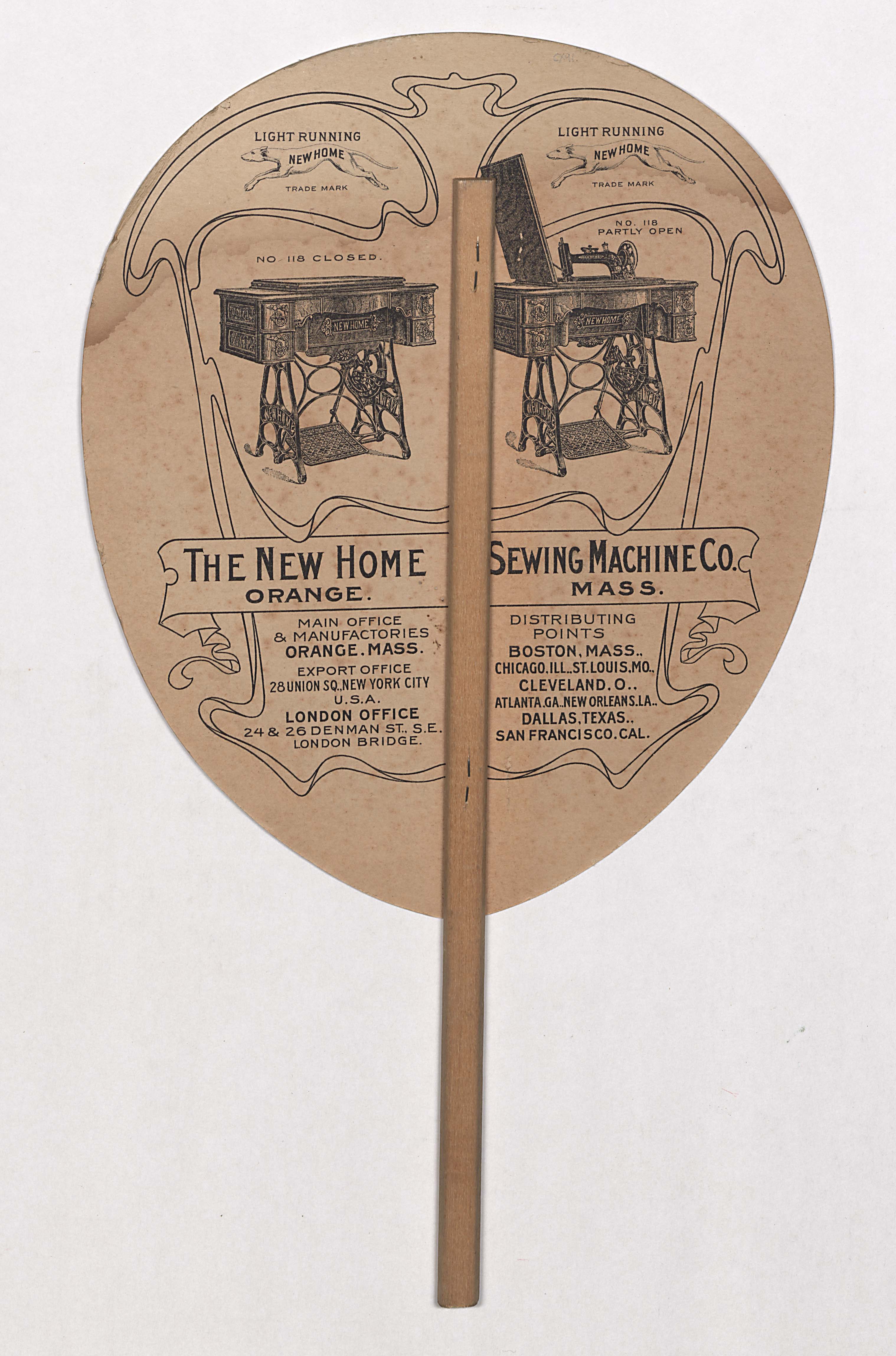 Reverse of fan in Image 54 with New Home Sewing Machine Co. advertisement listing its many locations and images of its sewing machines and factory.