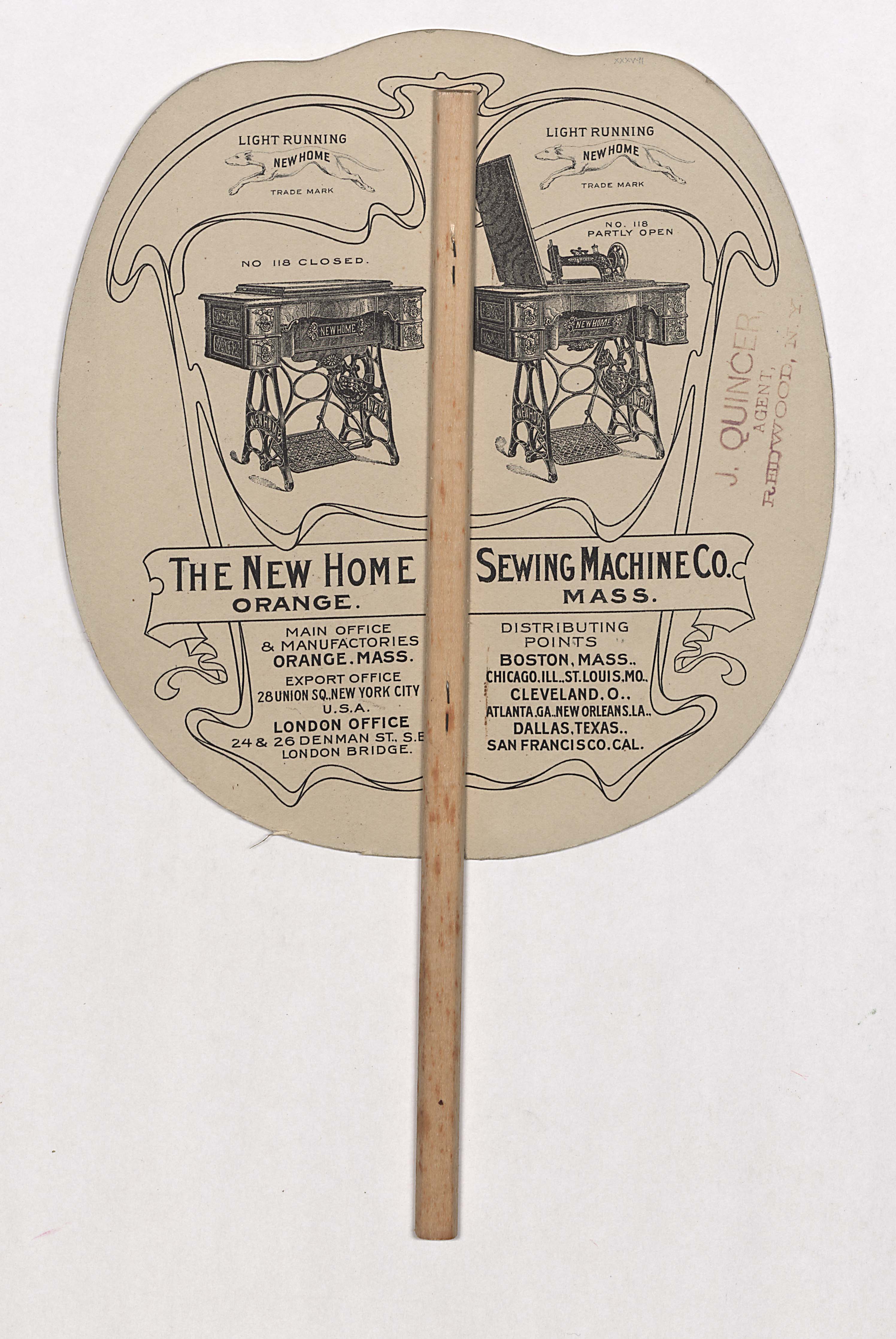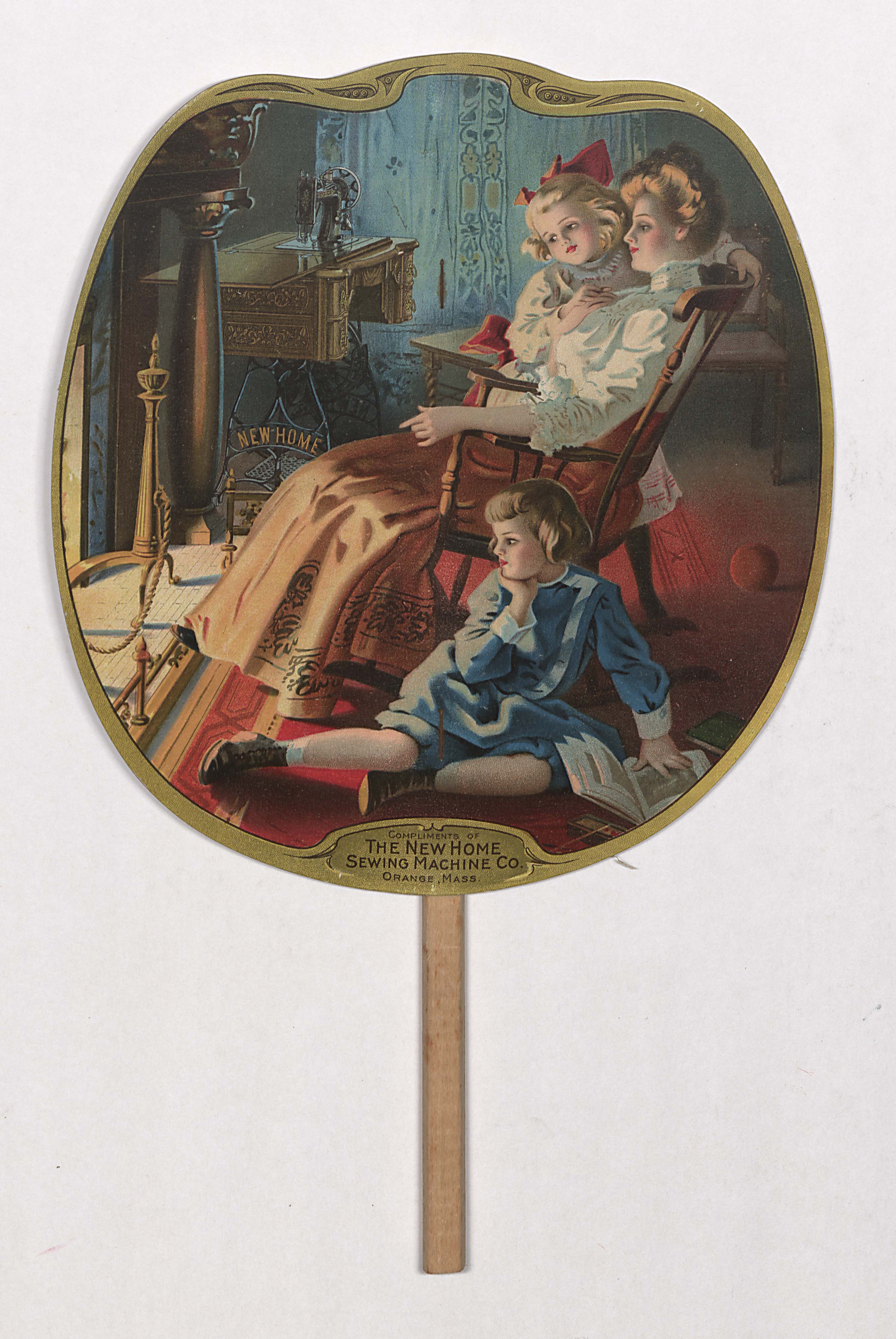 Fan illustrating a domestic scene showing a mother with her two daughters and a sewing machine in the background. Circulated compliments of the New Home Sewing Machine Co., Orange, Massachusetts and used by an agent, J. Quincer, Redwood, New York. For the other side, see Image 57.